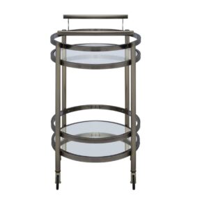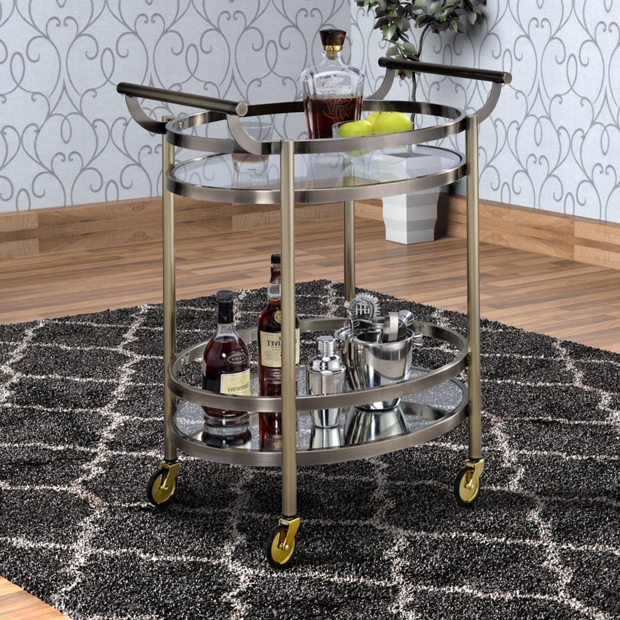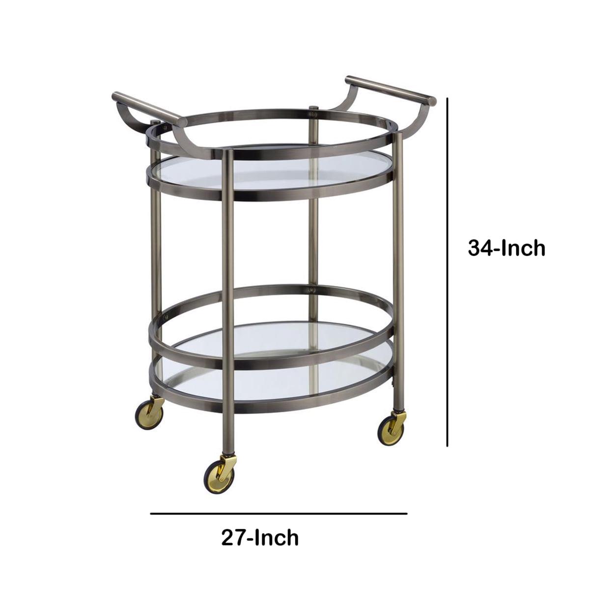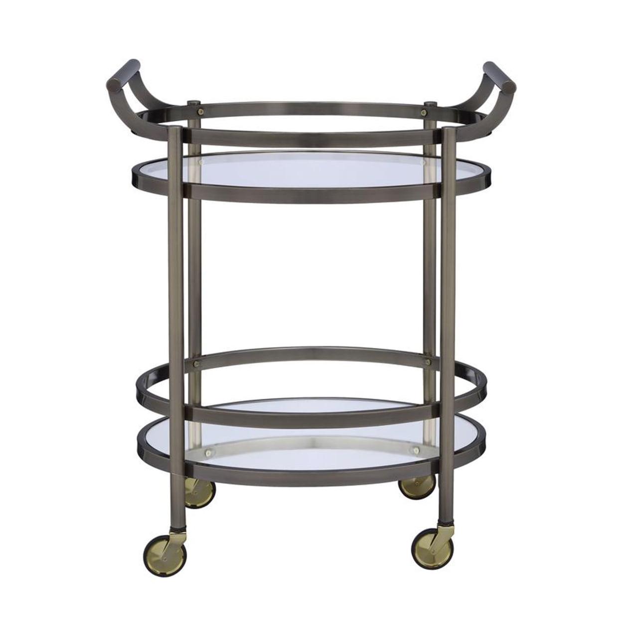 Oval Metal Serving Cart, Clear Glass and Gold- Saltoro Sherpi Show off your personality with this serving cart, featuring a metal frame finished in gold and top tray of glass and lower mirrored shelf for that glam appeal. The clear tempered glass top and mirror bottom are the ideal place for placing your dishes and dining accessories. Roll it where need be on its softer rubber wheels and prepare to entertain.