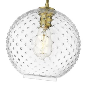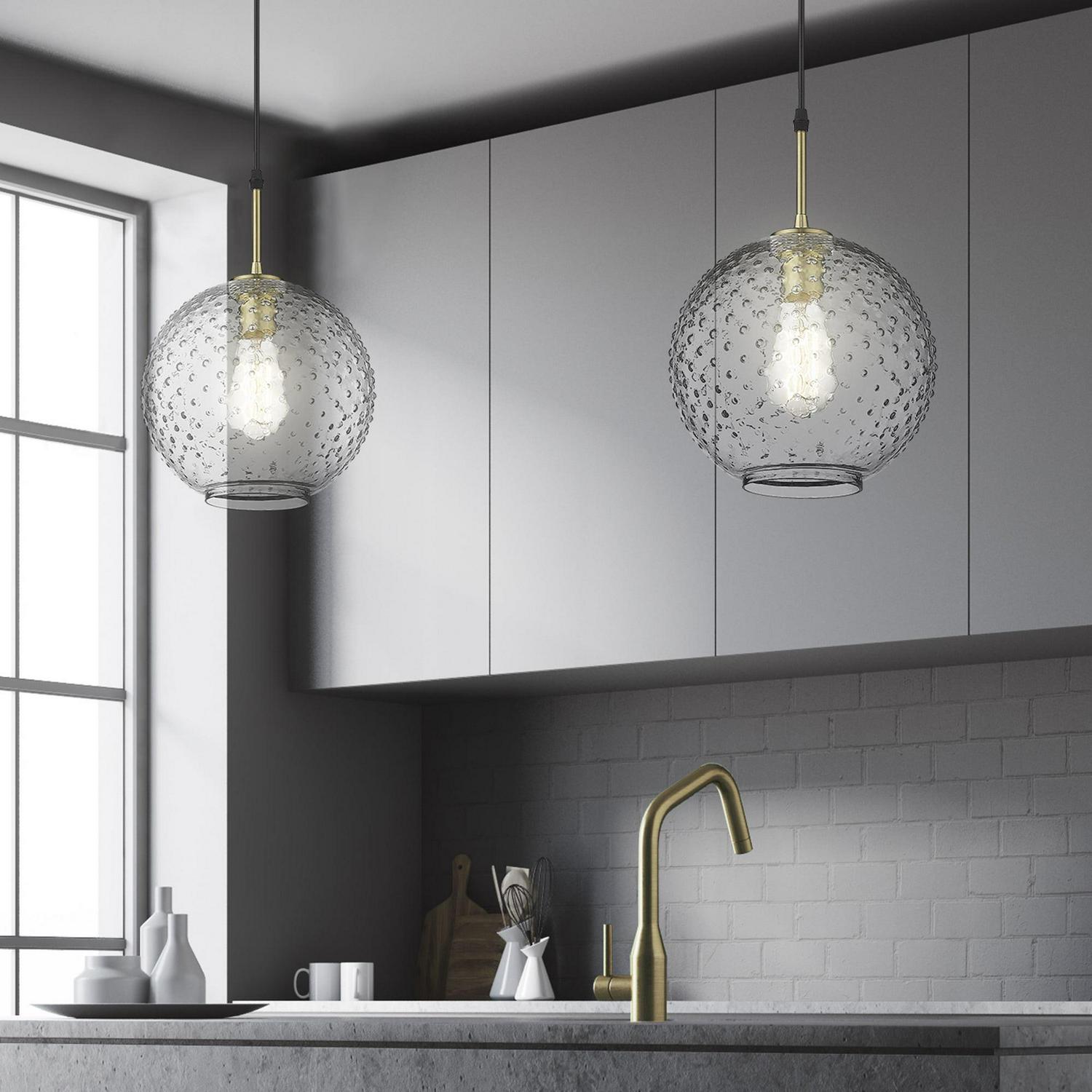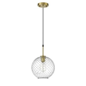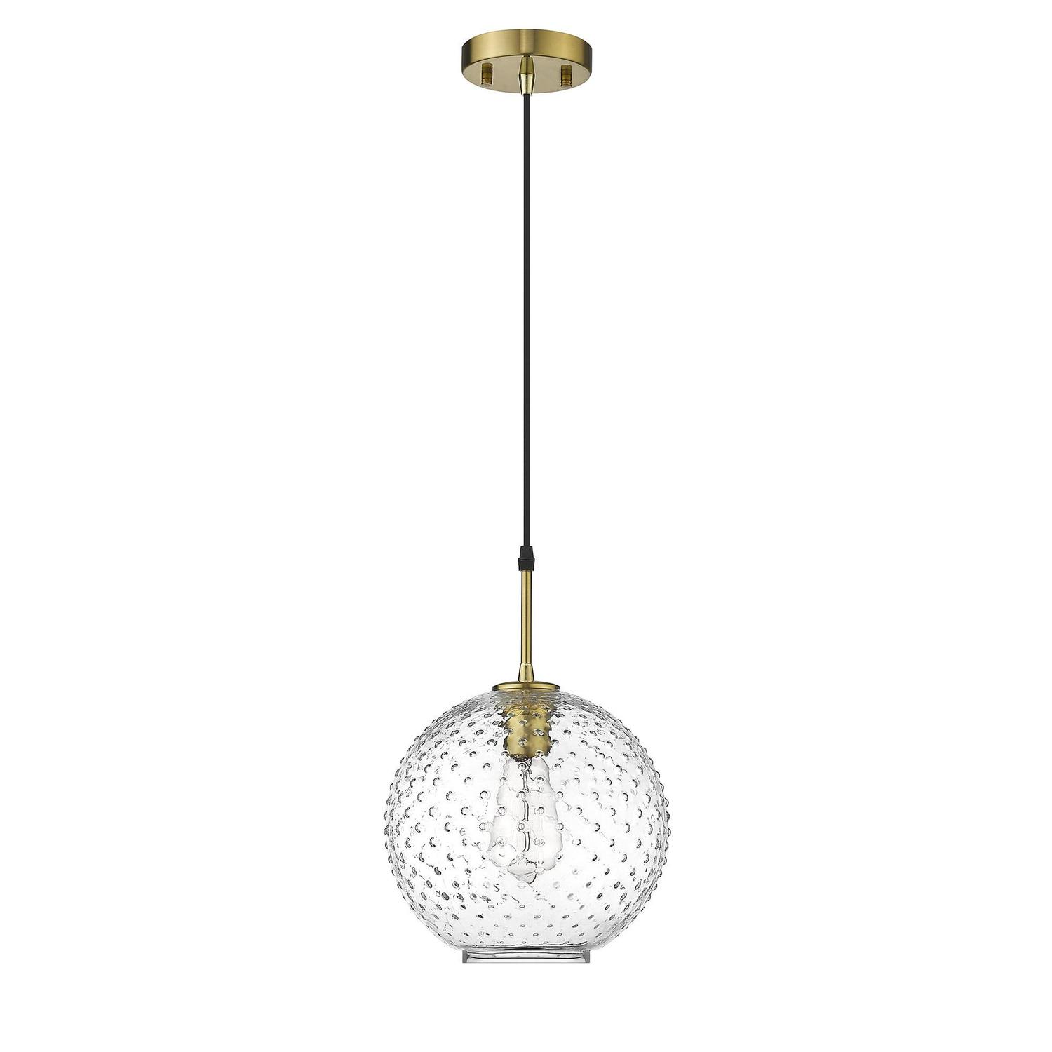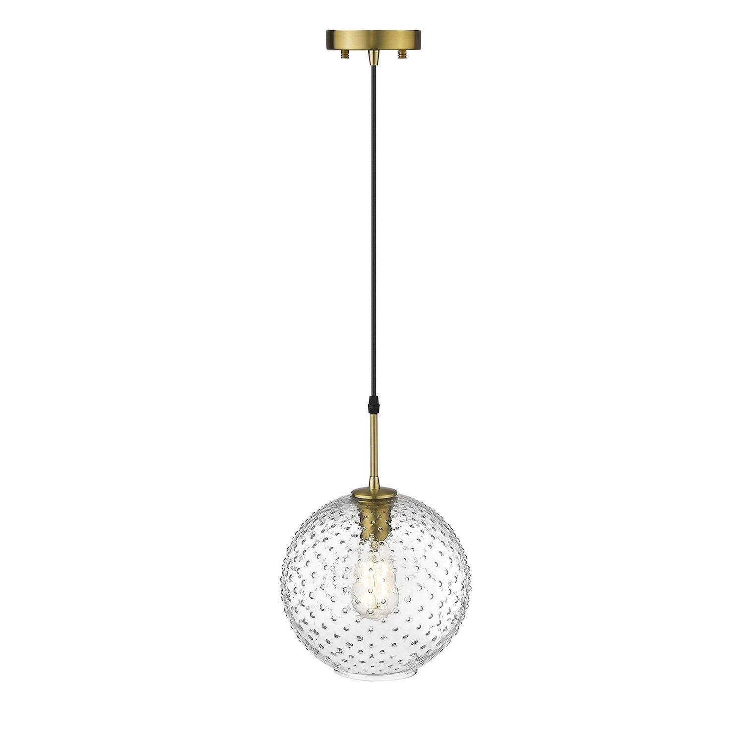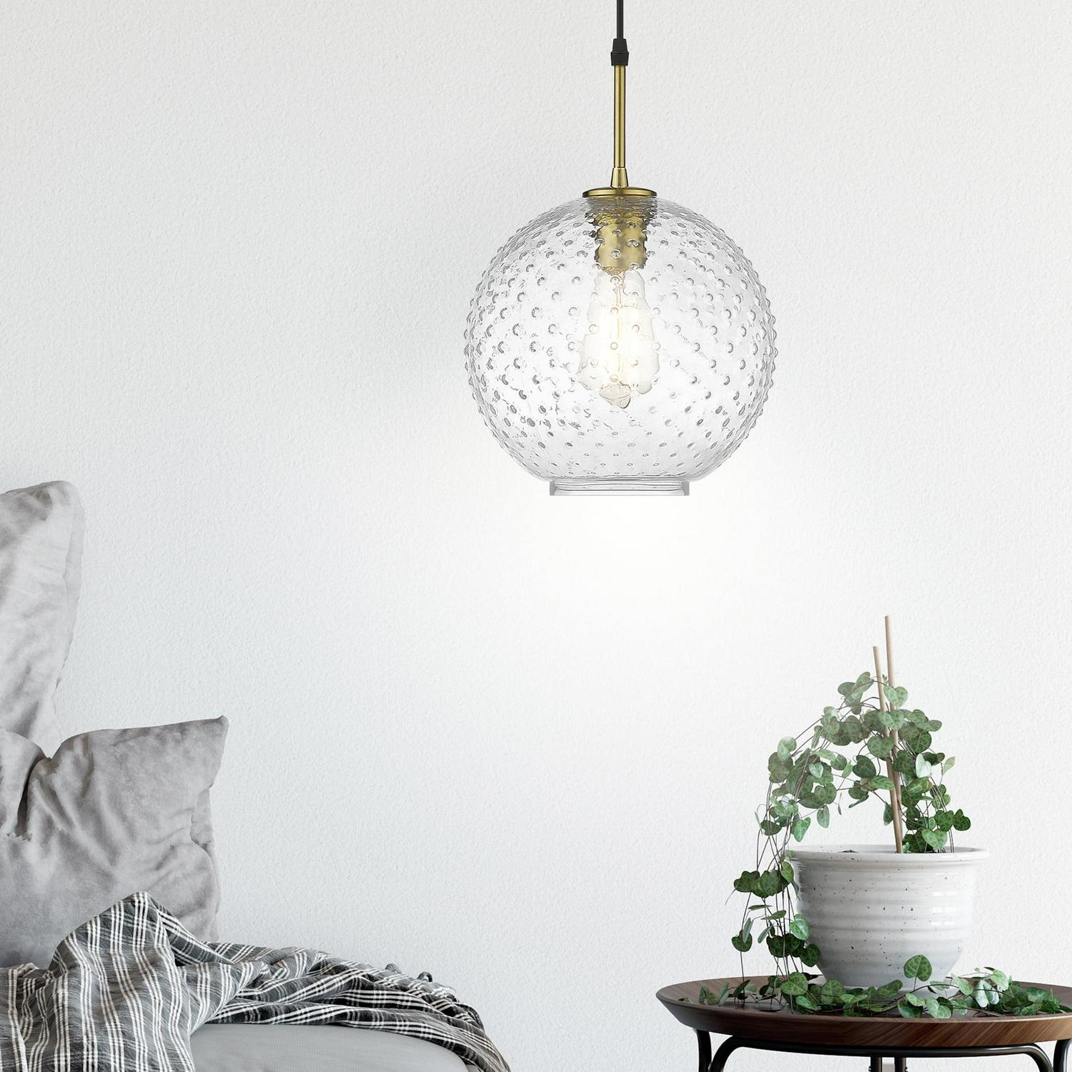 The gleaming glint of gold accents the playful glass orb shade of the Manika single pendant light by Ove Decors. A clear glass spherical shade with an open sconce bottom and pretty studded dot detail stands in delicate relief against the sanded gold accent of the bulb socket holder suspension and cable finial. An exposed filament soft white LED bulb adds the final polish to this contemporary stunner.