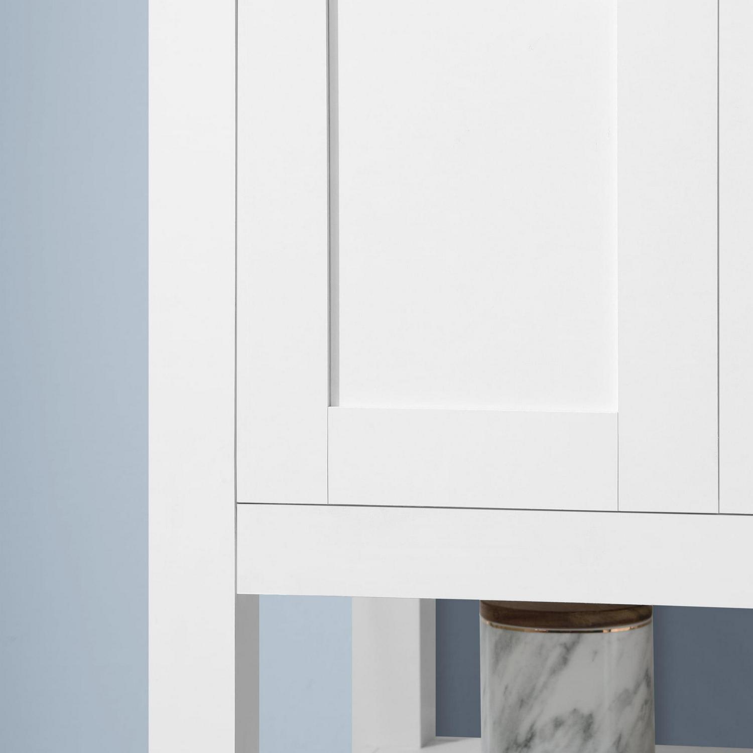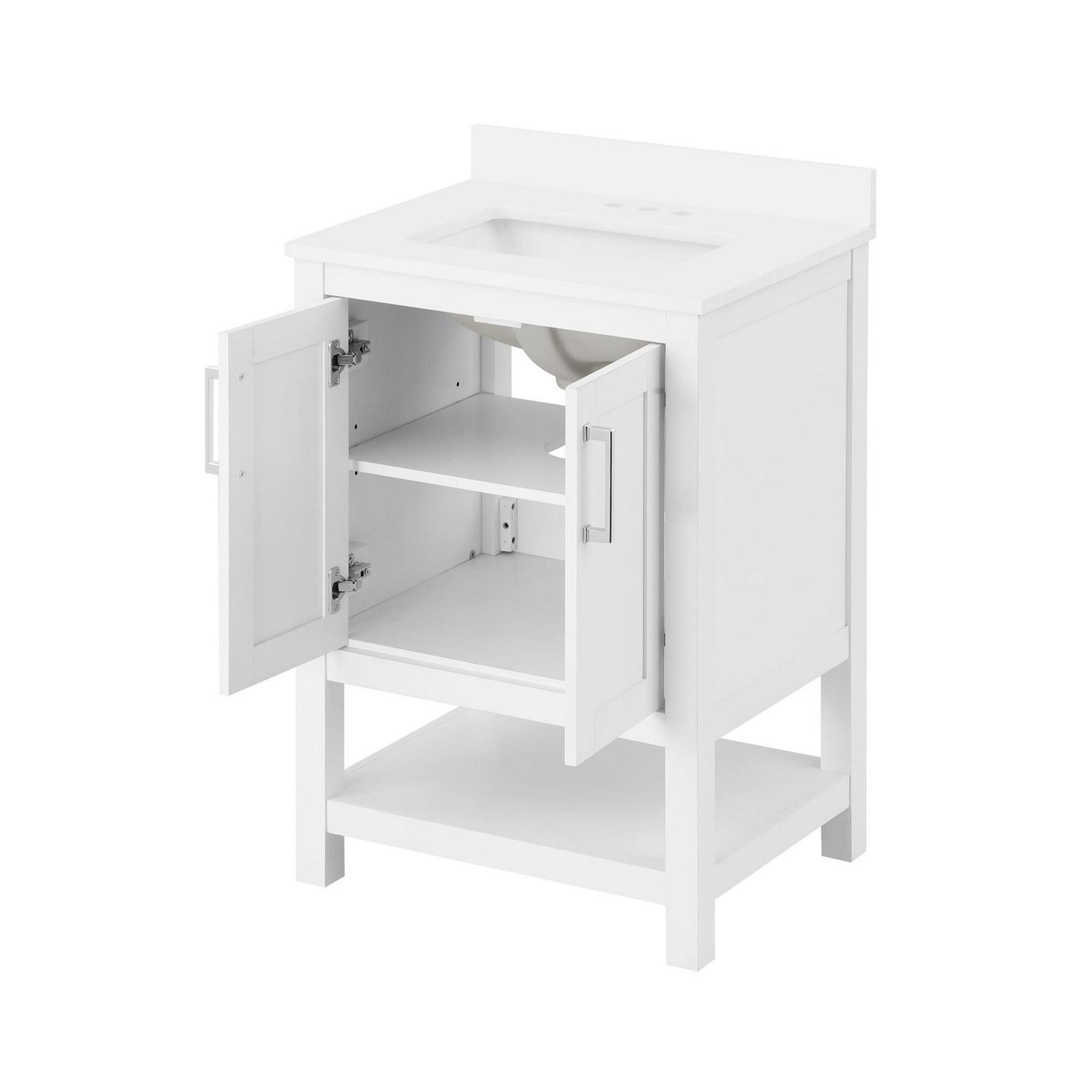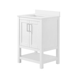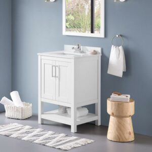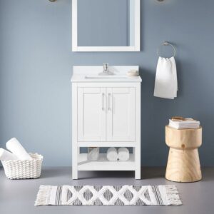 The Vegas by Ove Decors is a freestanding vanity in Pure White with a simple and minimalistic design – perfect for mid-size to smaller bathrooms. All doors offer 3-way adjustable hinges with easy access and 110-degree opening capability. Inside the cabinet will be an adjustable interior shelf. The bottom of the cabinet showcases a full open shelf. The vanity comes with premium quality hardware in a smooth chrome finish. The Bombay White engineered marble vanity top comes with an attached under-mount rectangular glazed ceramic sink with overflow. The top has a straight edge profile and comes with a removable backsplash. The vanity top comes pre-drilled for a 4″ spread faucet (not included). Choose the perfect fit between a variety of sizes and finishes to match your personal style and make your next bathroom remodel a success.