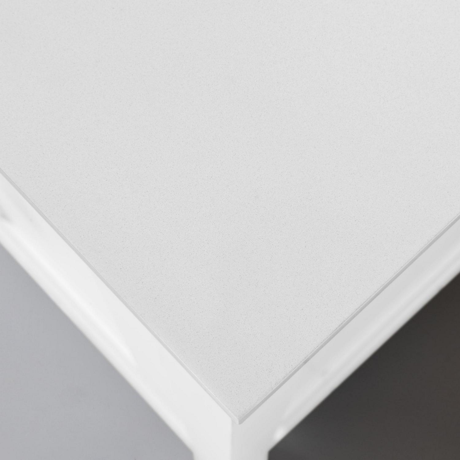 – The vanity top is Bombay White Engineered Marble with attached under-mount rectangular glazed ceramic sink with Overflow and straight edge profile. Matching backsplash included. The top comes pre-drilled for a 4″ faucet spread. (Faucet sold separately).