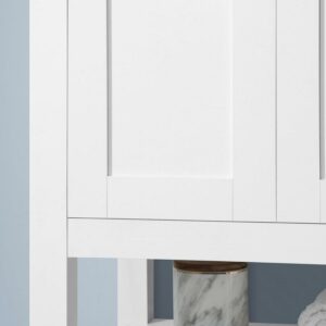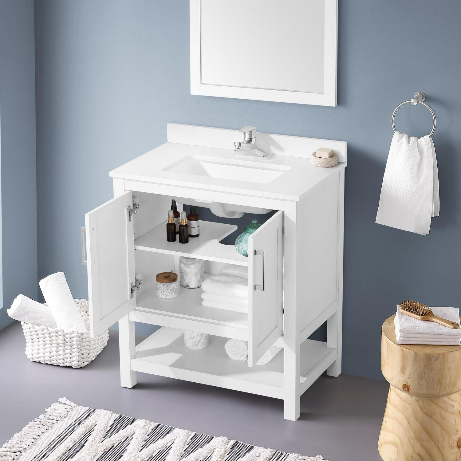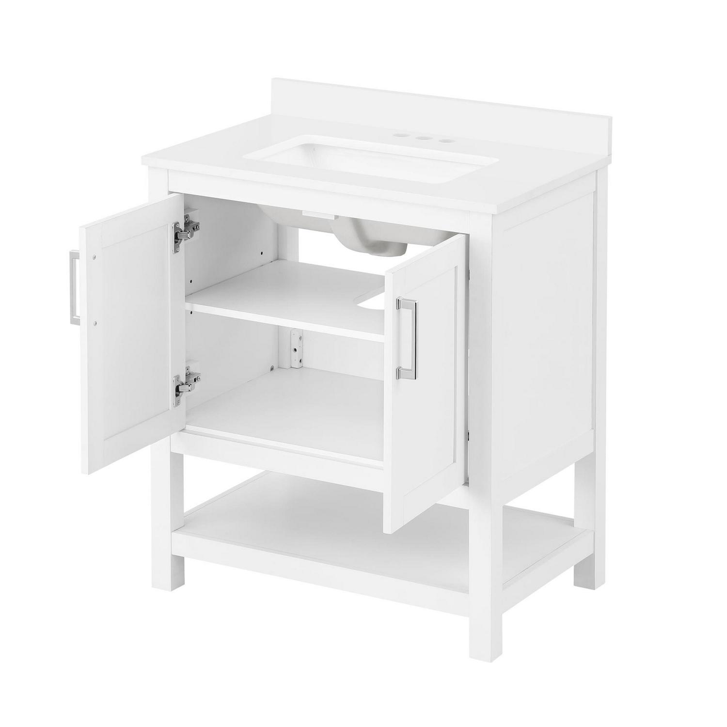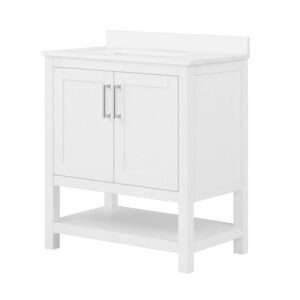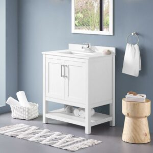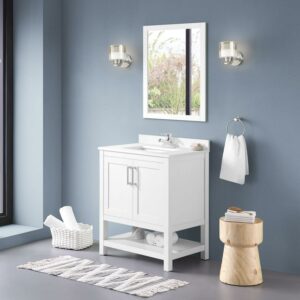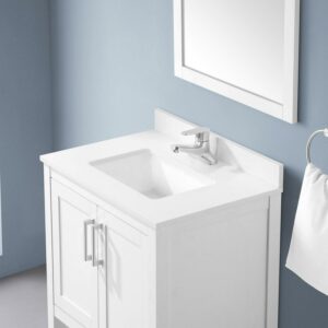 The Vegas by Ove Decors is a freestanding vanity in Pure White with a simple and minimalistic design – perfect for mid-size to smaller bathrooms. All doors offer 3-way adjustable hinges with easy access 110 degree opening capability. Inside the cabinet will be an adjustable interior shelf. The bottom of the cabinet showcases a full open shelf. The vanity comes with premium quality hardware in a smooth chrome finish. The Bombay White Engineered Marble vanity top comes with an attched undermount rectangular glazed ceramic sink with overflow. The top has a straight edge profile and comes with removable backsplash . The vanity top comes pre-drilled for a 4″ spread faucet (not included). Choose the perfect fit between a variety of sizes and finishes to match your personal style and make your next bathroom remodel a success.