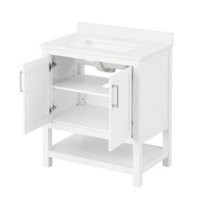 – Assembly: Cabinet and Vanity Top arrive fully assembled and are easy to install. Cabinet arrives with back cutout panel easy plumbing.