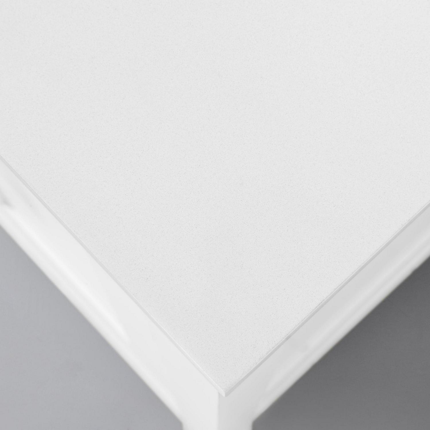 – Vanity top is Bombay White Engineered Marble with attached undermount rectangular glazed ceramic sink with overflow and straight edge profile. Matching backsplash included. Top comes pre-drilled for 4 faucet spread. (Faucet sold separately).