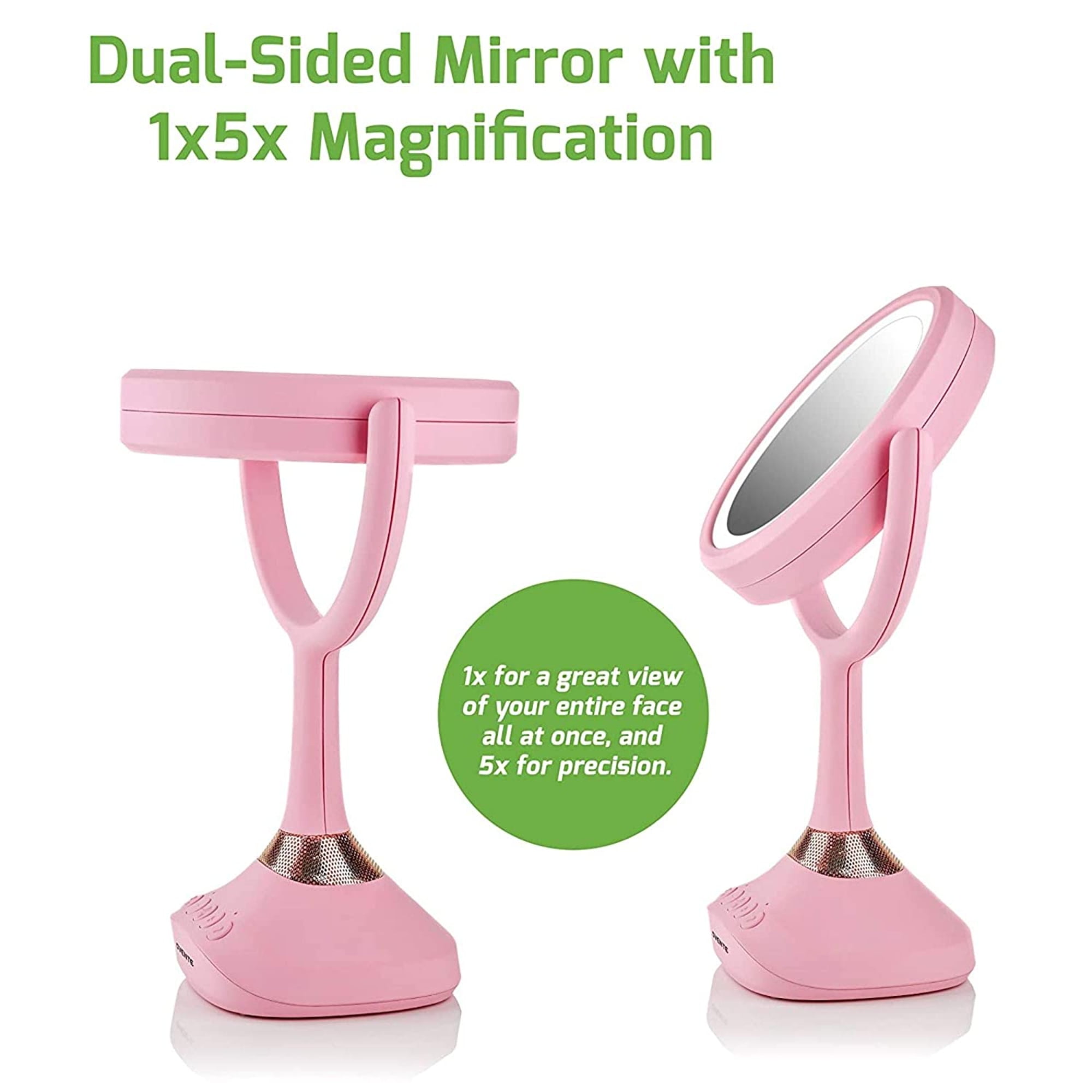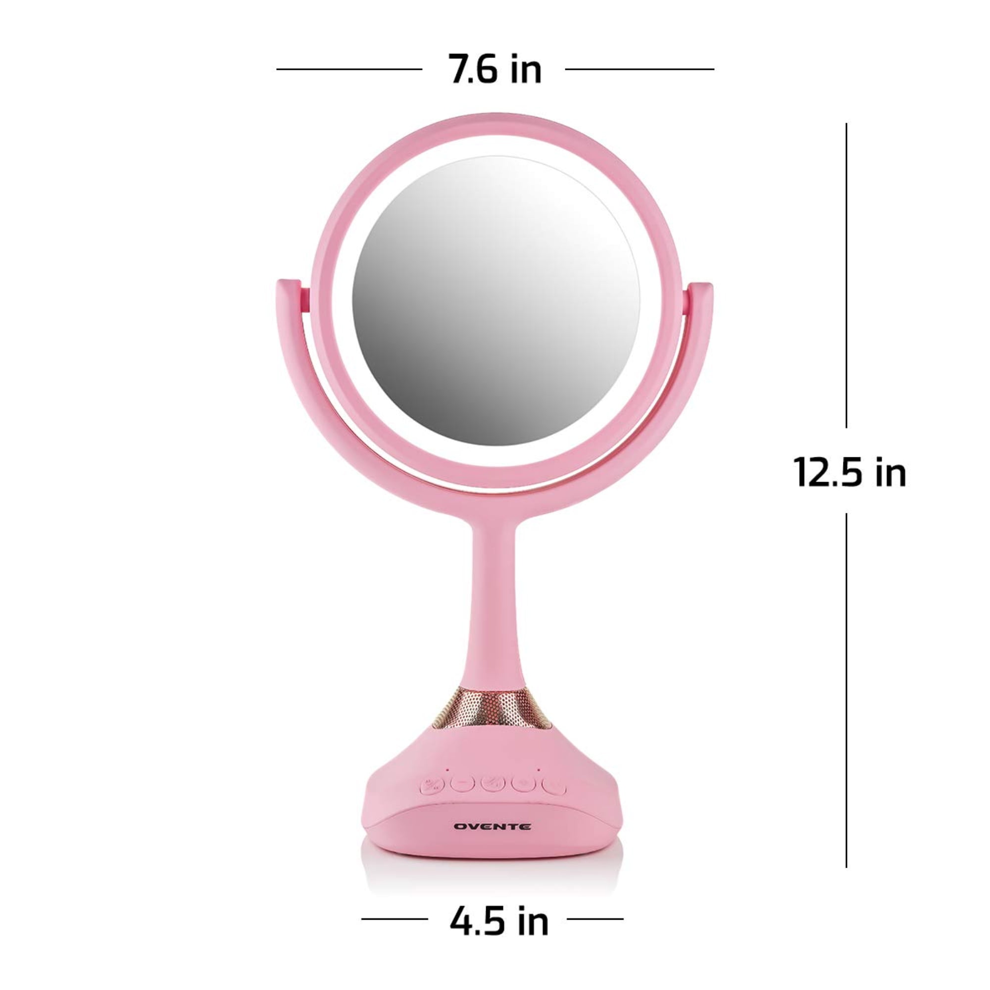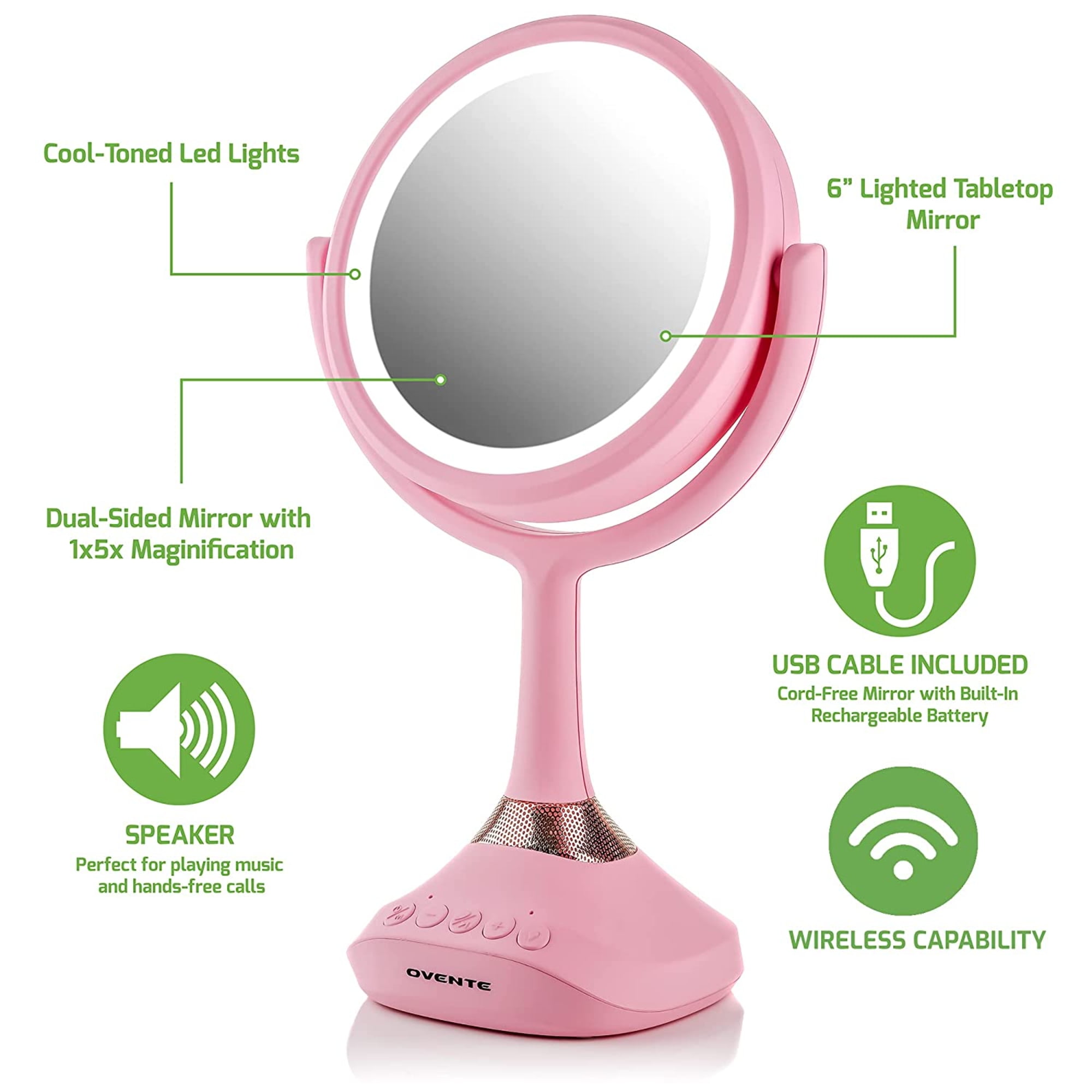 OVENTE 6” Lighted Round Vanity Mirror, Table Top, 360 Degree Spinning, 1X 5X Magnifier, MP3 Audio, Baby Pink MRT06P1X5X