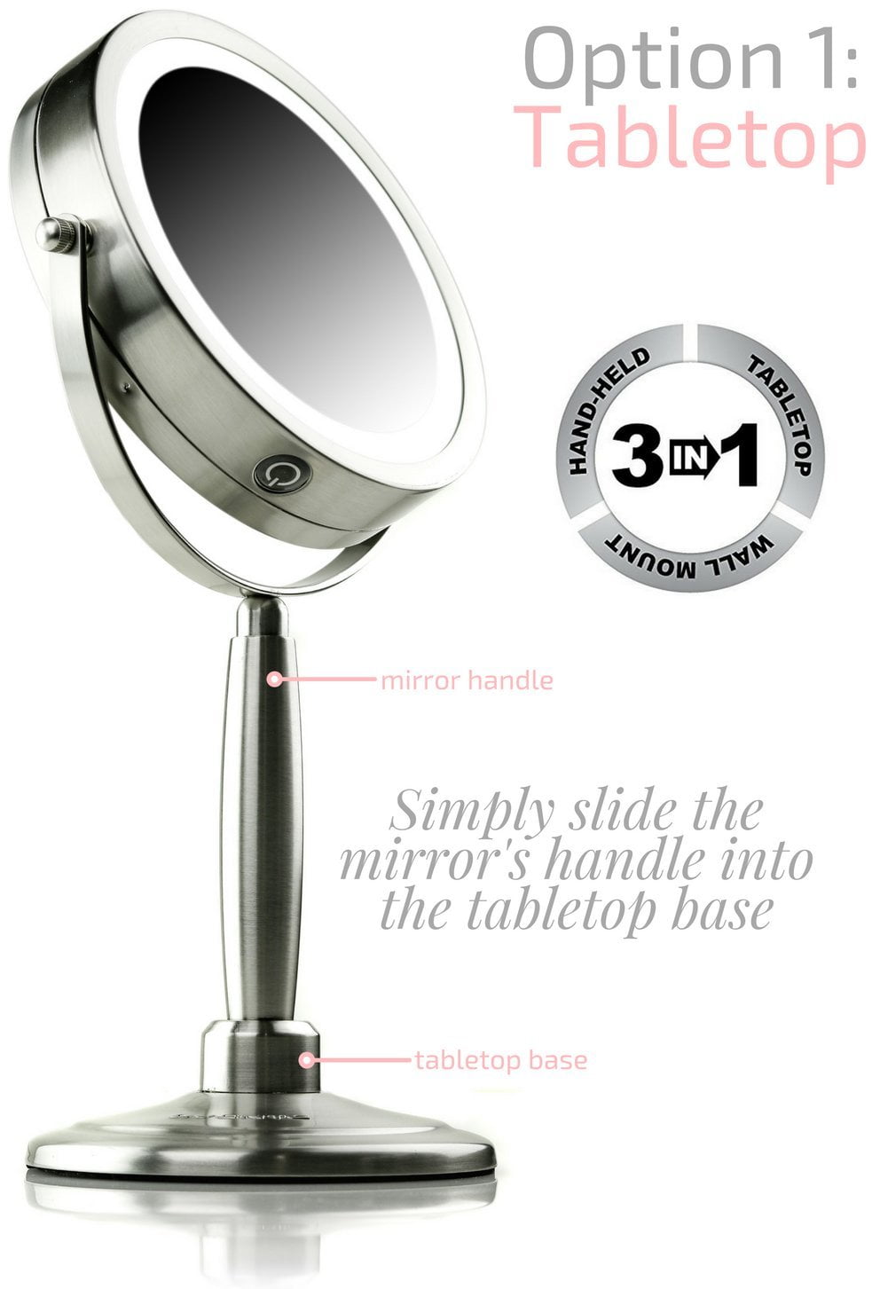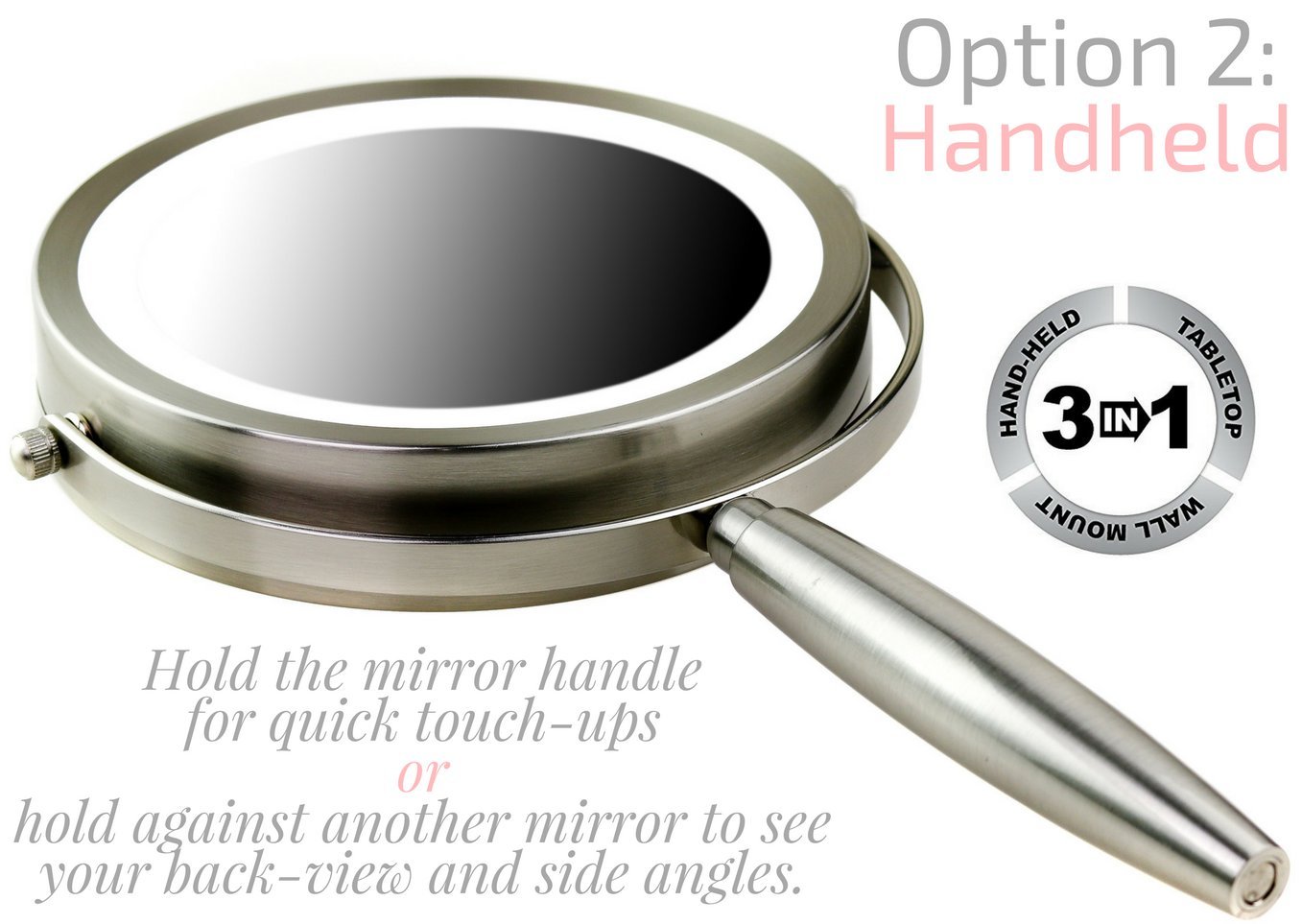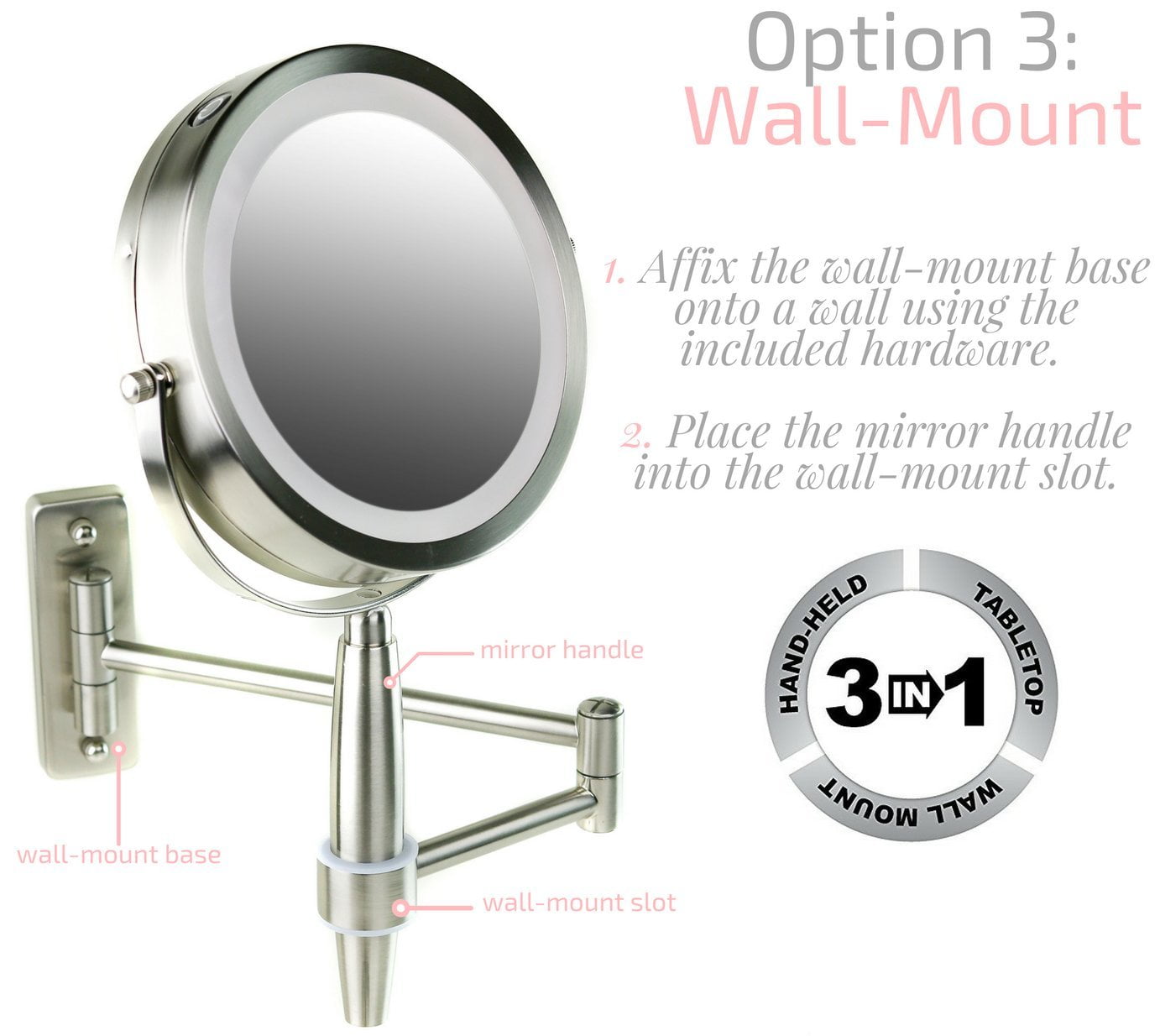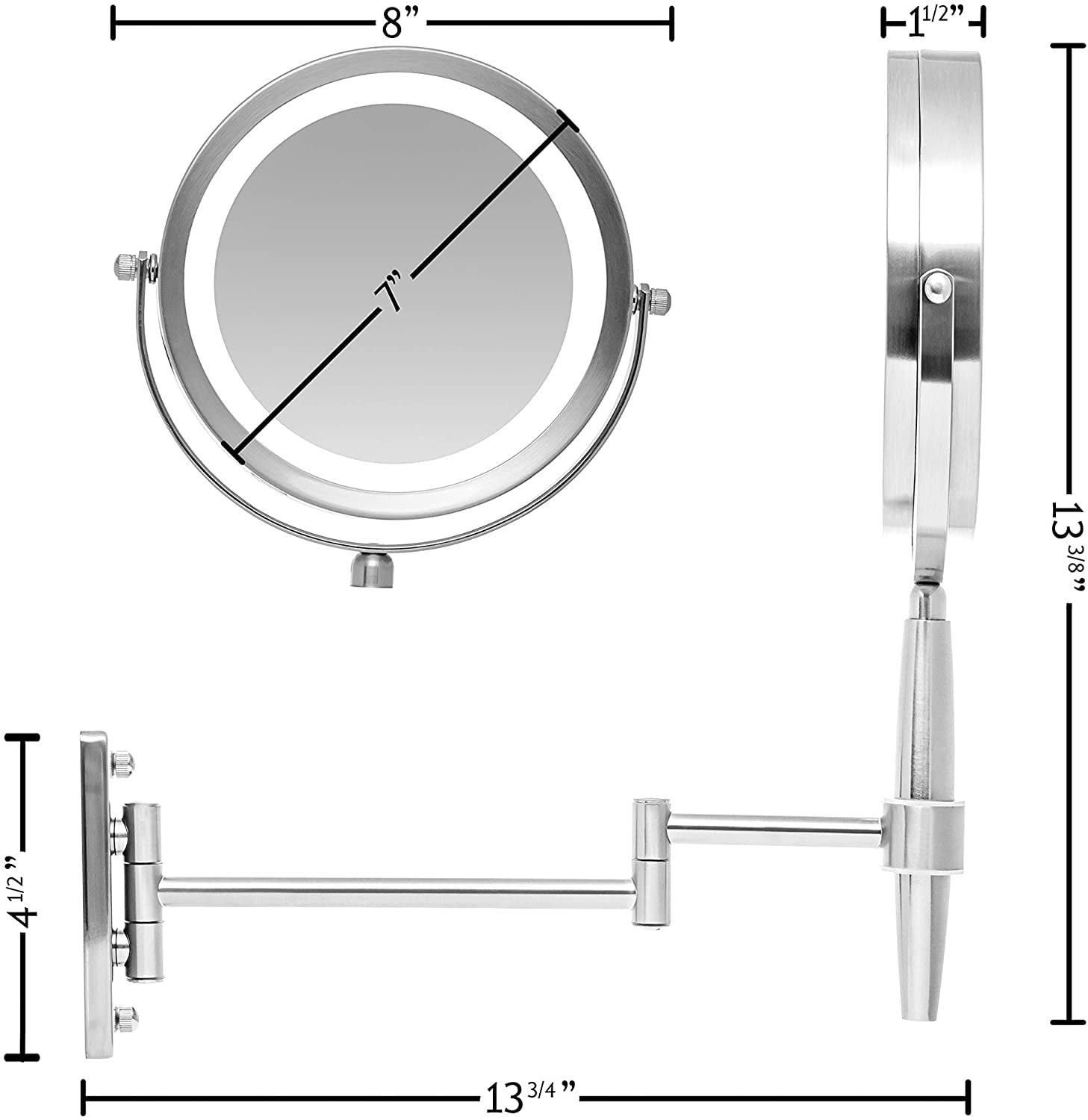Introducing MFM Series Mirrors! This multi-use mirror can be changed seamlessly from hand held, tabletop to wall mount. It has a Three Tone Ring LED light that changes with a touch of the mirror: cool, natural and warm tones. You can pull or flex the swinging extension to many angles. This flexible electric magnified lit looking glass allows you to see up close so you can absolutely see your eyebrow and facial hair much more clearly. It has a great look for personal style but also emits a professional top notch brightness that’s perfect for any desk, shower, desktop or counter and because it can also be hands free, it’s also convenient for any home, bedroom, hotel, dental, shower, and facial needs. This cute countertop mirror can be great for many décor, including vintage, Hollywood, medical, or anything that involves beauty and cosmetics. Having a strong bright wall mountable mirror is perfect for bathroom, restroom, grooming, shaving, haircut and vanity needs. This mirror is powered by 4 AAA batteries (not included) for a cordless and clutter-free environment. Use it at home for a modern look for the master bath or even help keep everything hands free by keeping one less thing off the countertop. Use it as a portable option for any traveling, big or small. Its ability to magnify, show off your accessories and continue a salon & spa experience at home makes this a consumer preferred product. Ovente’s MFM Series 3 IN 1 Wall Mount, Tabletop and Handheld Mirror is available in: 2 Deluxe Finishes: Nickel Brushed and Polished Chrome 2 Size Offer(s): 7 Inch and 8.5 inch 2 Magnification Offer(s): 1x5x and 1x8x