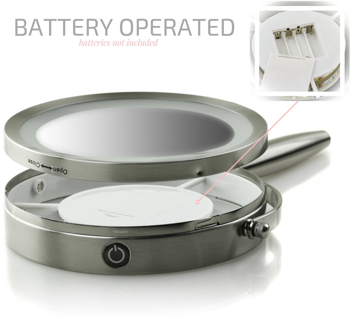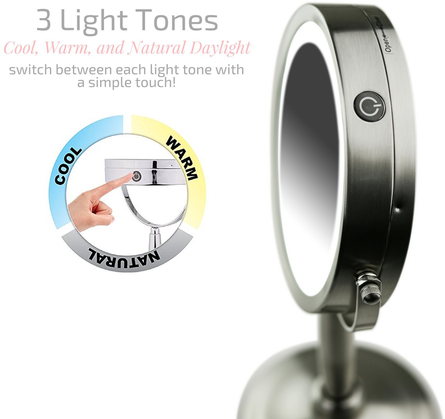 Dual-Sided & 8x Magnifying – This two-sided 360-degree swivel design luxury mirror features 1x & 8x magnifications. 1x (full face view) and 8x (to see every detail up close) 3 Tone LED Ring Light – Choose Cool, (bright & clear) Natural, (replicates daylight) or Warm, (date night & special occasion) with a touch of the mirror. Elegant Extending Arm, Secure Base & Handheld – This interchangeable set has 3 options for use. Mounted on the wall, Tabletop stand with its sturdy base, and hand held also. 4 AAA Battery Powered – Operate as cordless, using only batteries (not included). US-based Customer Service: Ovente warranties that the product shall be free from defects in material & workmanship under normal use & conditions, for 1 year from the original purchase date.