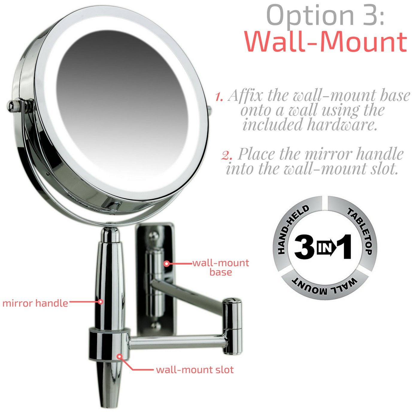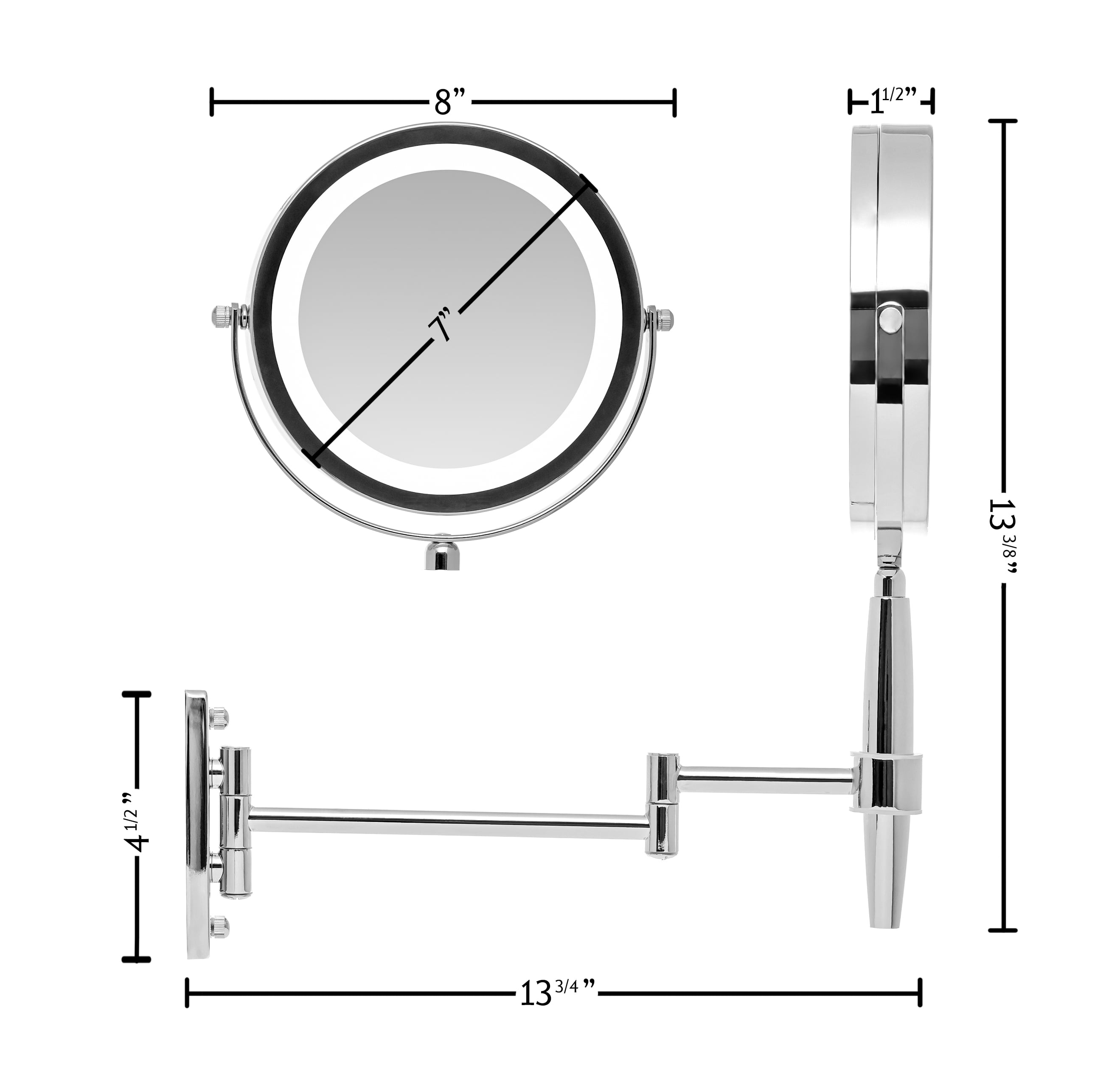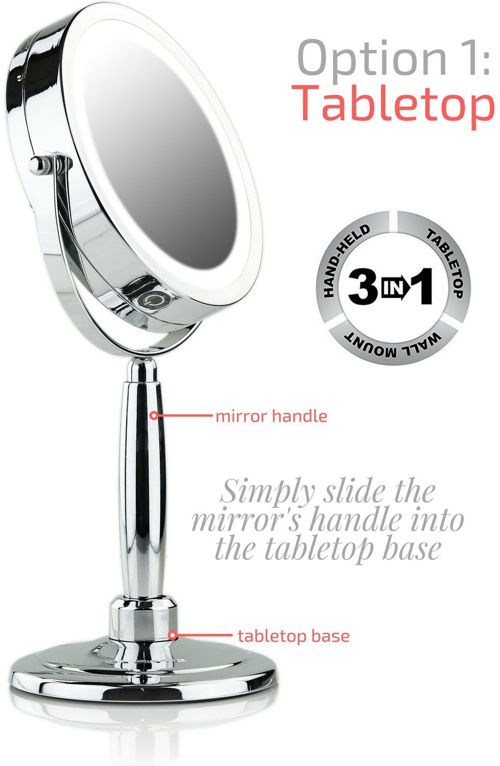 Introducing MFM Series Mirrors! This multi-use mirror can be changed seamlessly from hand held, tabletop to wall mount. It has a Three Tone Ring LED light that changes with a touch of the mirror: cool, natural and warm tones. You can pull or flex the swinging extension to many angles. This flexible electric magnified lit looking glass allows you to see up close so you can absolutely see your eyebrow and facial hair much more clearly. It has a great look for personal style but also emits a professional top notch brightness that’s perfect for any desk, shower, desktop or counter and because it can also be hands free, it’s also convenient for any home, bedroom, hotel, dental, shower, and facial needs. This cute countertop mirror can be great for many décor, including vintage, Hollywood, medical, or anything that involves beauty and cosmetics. Having a strong bright wall mountable mirror is perfect for bathroom, restroom, grooming, shaving, haircut and vanity needs. This mirror is powered by 4 AAA batteries (not included) for a cordless and clutter-free environment. Use it at home for a modern look for the master bath or even help keep everything hands free by keeping one less thing off the countertop. Use it as a portable option for any traveling, big or small. Its ability to magnify, show off your accessories and continue a salon & spa experience at home makes this a consumer preferred product. Ovente’s MFM Series 3 IN 1 Wall Mount, Tabletop and Handheld Mirror is available in: 2 Deluxe Finishes: Nickel Brushed and Polished Chrome 2 Size Offer(s): 7 Inch and 8.5 inch 2 Magnification Offer(s): 1x5x and 1x8x