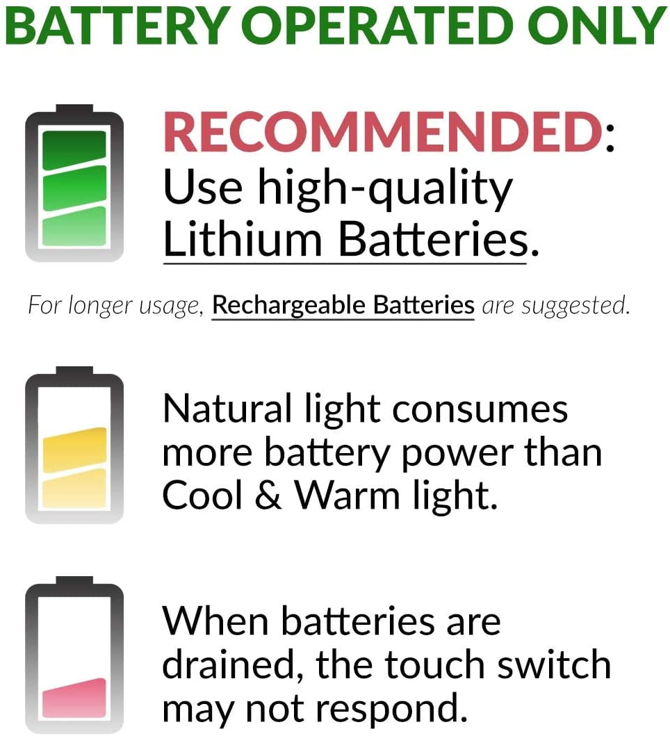 Dual-Sided & 8x Magnifying – This two-sided 360-degree swivel design luxury mirror features 1x & 8x magnifications. 1x (full face view) and 8x (to see every detail up close) 3 Tone LED Ring Light – Choose Cool, (bright & clear) Natural, (replicates daylight) or Warm, (date night & special occasion) with a touch of the mirror. Elegant Extending Arm, Secure Base & Handheld – This interchangeable set has 3 options for use. Mounted on the wall, Tabletop stand with its sturdy base, and hand held also. 4 AAA Battery Powered – Operate as cordless, using only batteries (not included). US-based Customer Service: Ovente warranties that the product shall be free from defects in material & workmanship under normal use & conditions, for 1 year from the original purchase date.