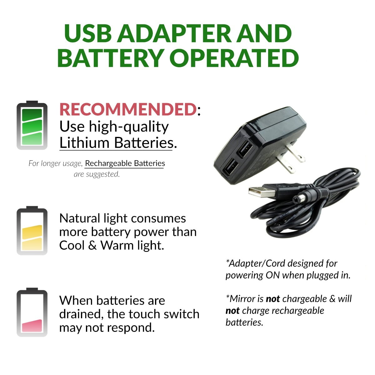 Dual-Sided & 10x Magnifying -This Two Sided 360° swivel design luxury mirror features 1x & 10x magnifications. 1x (full face view) and 10x (to see every detail up close) Dimmable Diffused White LED w/ Acrylic Edge– Helps to produce brighter glow. Use dimmable light knob to dim white tone ring lights (simulates natural daylight); gives you full control of intensity. Concave Lens – Creates the magnification side. For clear, undistorted view, look into the mirror at 4.2 inches or closer. (See Maximum Distance Recommended Guide) 4 AA Battery & 2- PORT USB – Can be cordless, using only batteries (not included) or, operated by 2- PORT USB Adapter and cable (included) which allows you to charge a device while using the mirror. US-based Customer Service: Ovente warranties that the product shall be free from defects in material & workmanship under normal use & conditions, for 1 year from the original purchase date.