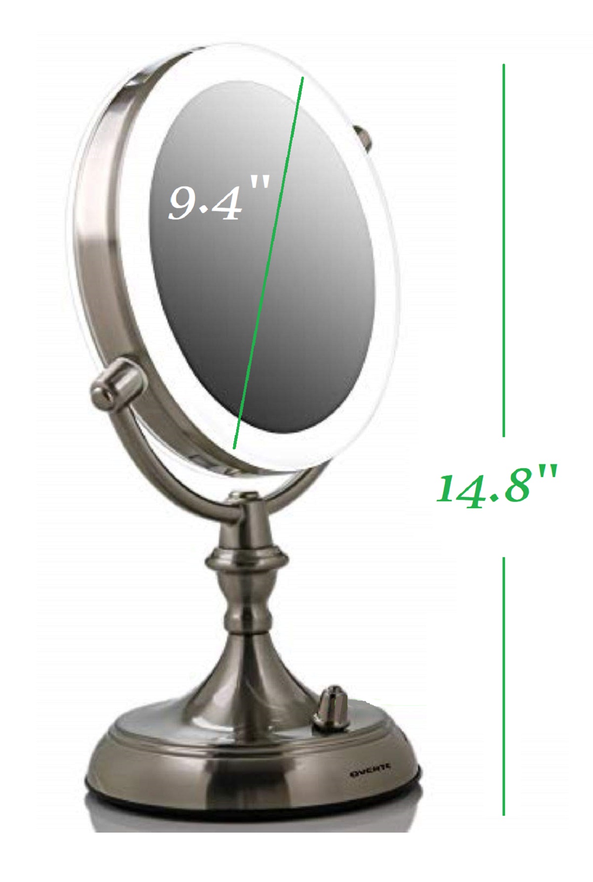 Easy to use: This dual sided 360-degree rotation design cosmetic vanity mirror features 1x magnification on one side and flip for a 5x magnifying view. 1x for full view and 5x allows you to fix even the smallest detail to achieve that perfect look. Cool Tone Lighting: Natural white LED light last longer then other competitors while using less electricity helping you to save money. No bulb replacement needed as this bulb will last the entire lifetime of the mirror. The light is also dimmable with just a turn of the knob on the base, giving you full control. Portable Convenience: This mirror is powered by a plug in AC adapter that is included with the mirror, or 4 AA batteries (not included). So you can enjoy this compact mirror while you travel with it by your side anywhere you go. Elegant Decor Design: This standing circle tabletop mirror magnifier creates a luxurious lighted focal point while brightening up your face for a professional cosmetic finish. Distortion Free View: Look 4 inches away for a distortion free view. Best for only the most detailed beauty makeup applications with no stretch or shrinking glass view. 1-Year warranty on Domestic (USA) Repairs and Replacements on workmanship and materials from date of purchase from authorized reseller. International inquiries please contact manufacturer customer service directly for better assistance. Dual-Sided & 5x Magnifying – This Two Sided 360-degree swivel design luxury mirror features 1x & 5x magnifications. 1x (full face view) and 5x (to see every detail up close). Dimmable Diffused White LED w/ Acrylic Edge – Helps to produce brighter glow. Use dimmable light knob to dim white tone ring lights (simulates natural daylight); gives you full control of intensity. Concave Lens – Creates the magnification side. For clear, undistorted view, look into the mirror at 12 inches or closer. (See Maximum Distance Recommended Guide) 4 AA Battery & 2- PORT USB – Can be cordless, using only batteries (not included) or, operated by 2- PORT USB Adapter and cable (included) which allows you to charge a device while using the mirror. US-based Customer Service: Ovente warranties that the product shall be free from defects in material & workmanship under normal use & conditions, for 1 year from the original purchase date.