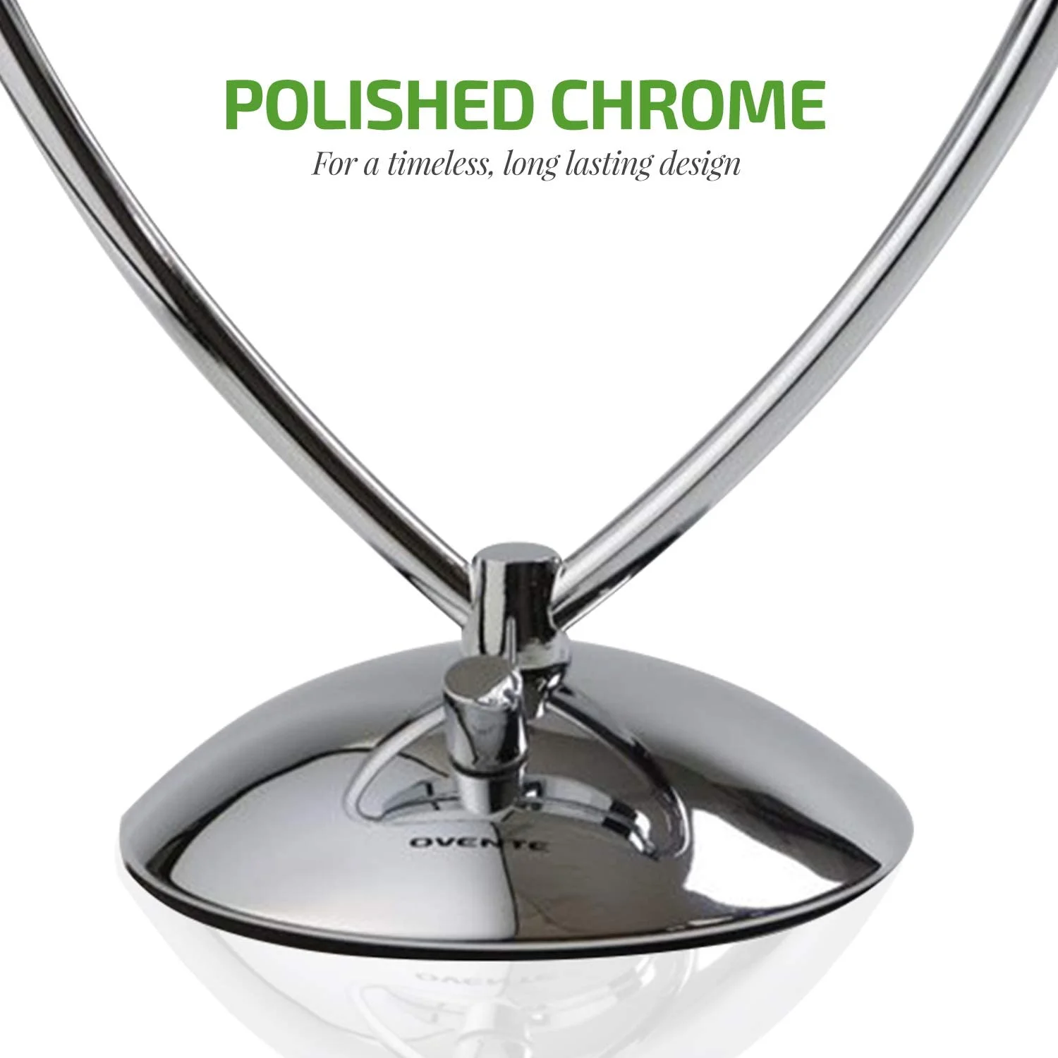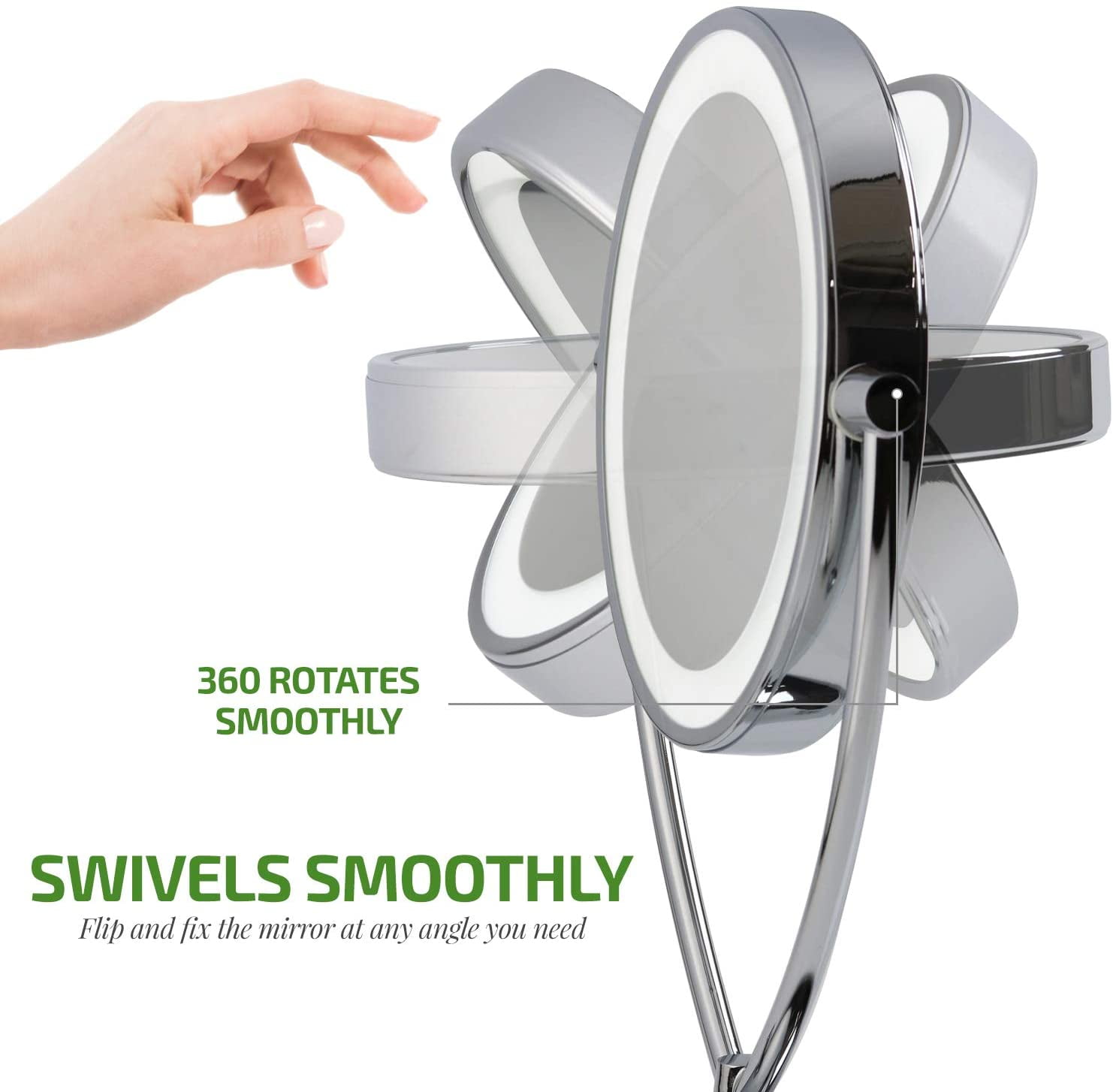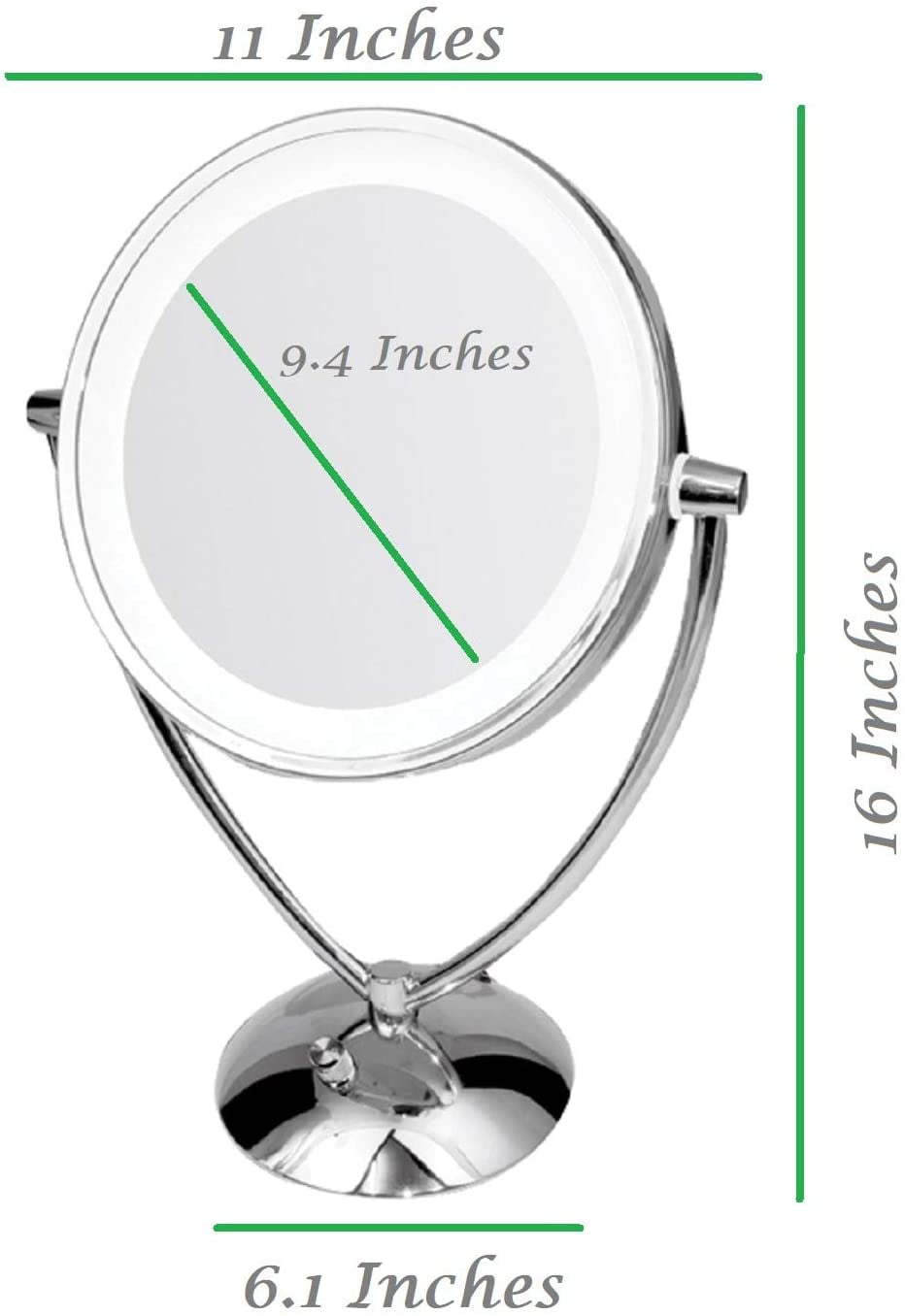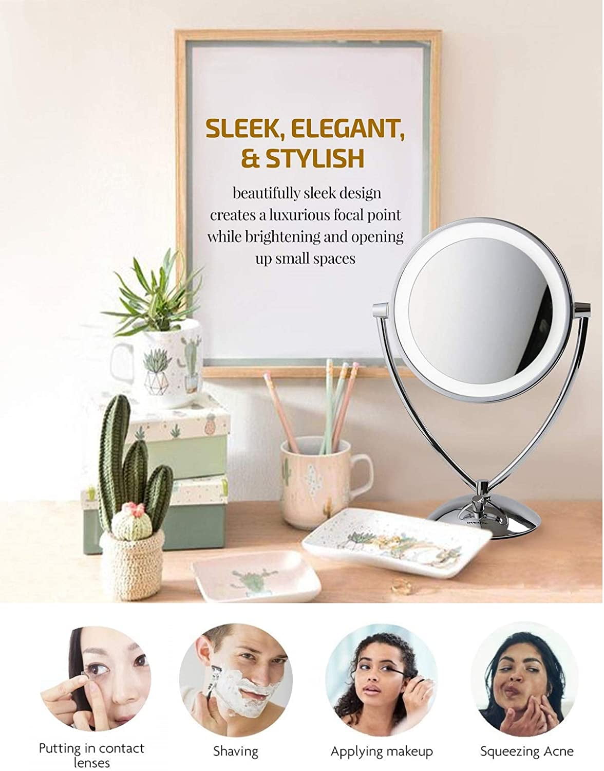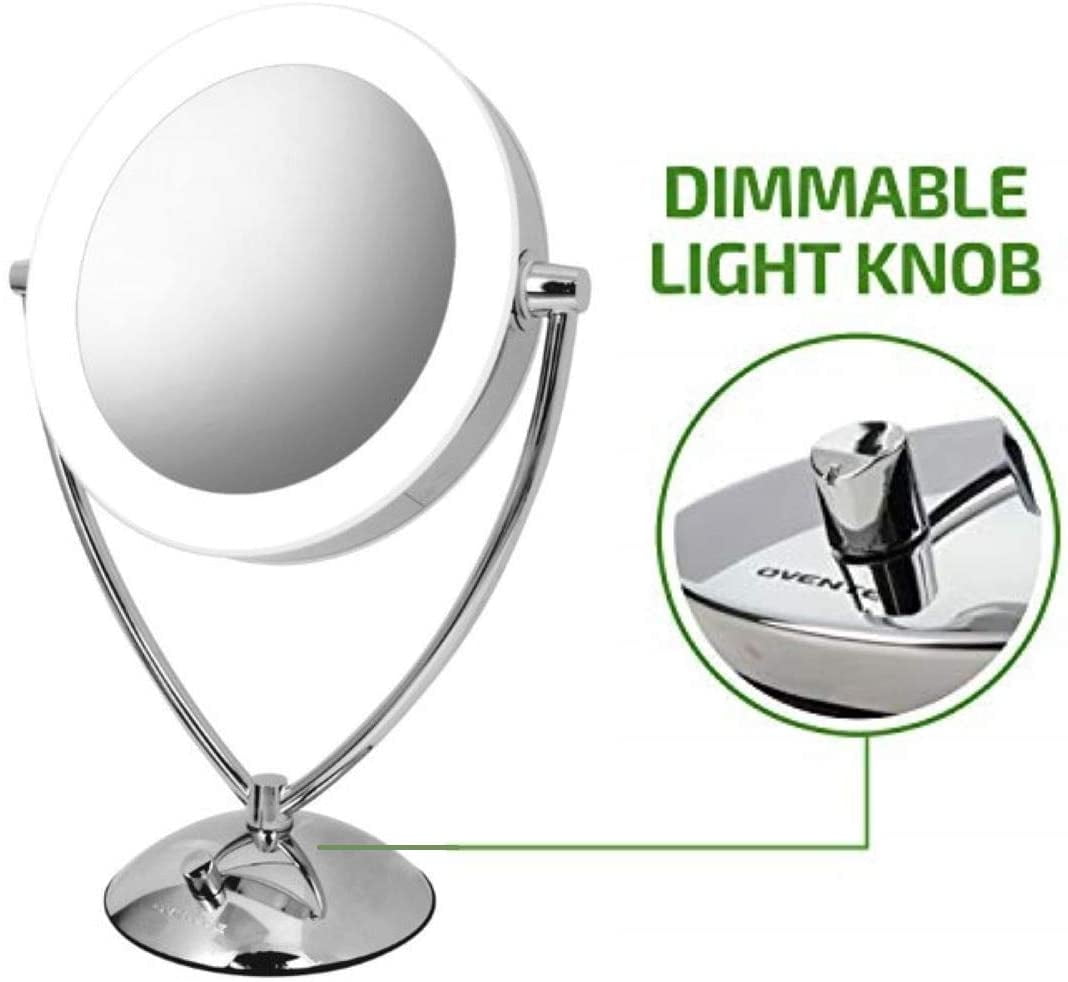 Ovente Lighted Tabletop Makeup Mirror 9.5 Inch LED Dimmable 1X 5X Magnifier 360 Adjustable Double Sided Battery USB Operated Bedroom Lamp Vanity Cosmetic Professional Large Polished Chrome MLT45CH1X5X