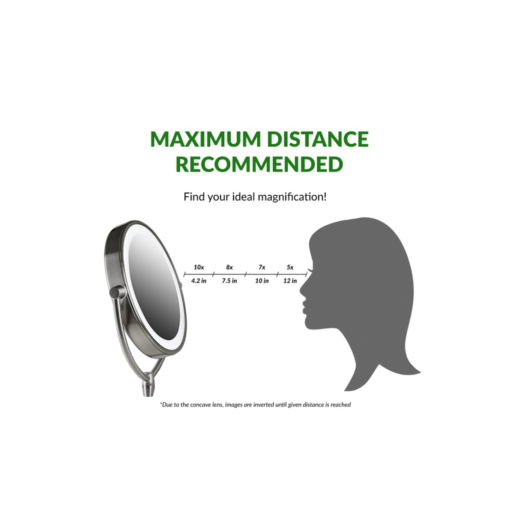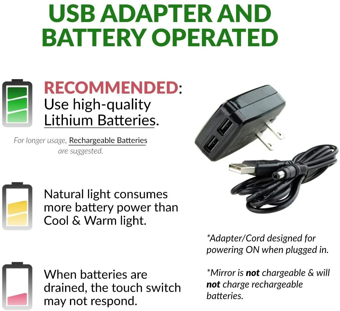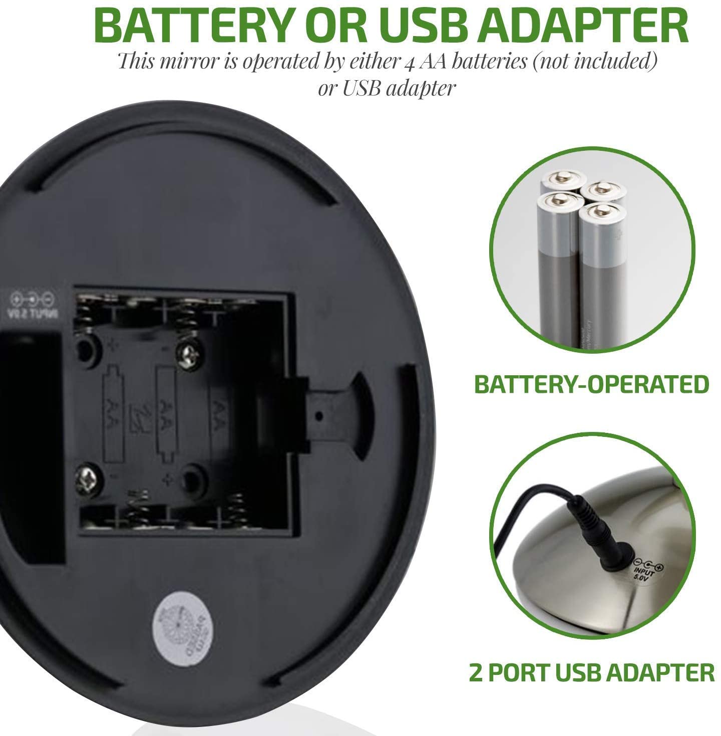 Dual-Sided & 5x Magnifying – This Two-Sided 360-degree swivel design luxury mirror features 1x & 5x magnifications. 1x (full face view) and 5x (to see every detail up close). Diffused, Dimmable White Tone LED – Turn light knob to dim white tone ring LED lights (simulates inside daylight); gives you full control of intensity. Concave Lens – Creates the magnification side. For clear, undistorted view, look into the mirror at 12 inches or closer. (See Maximum Distance Recommended Guide). 4 AA Battery & 2- PORT USB– Can be cordless, using only batteries (not included) or, operated by 2- PORT USB Adapter and cable (included) which allows you to charge a device while using the mirror. US-based Customer Service: Ovente warranties that the product shall be free from defects in material & workmanship under normal use & conditions, for 1 year from the original purchase date.