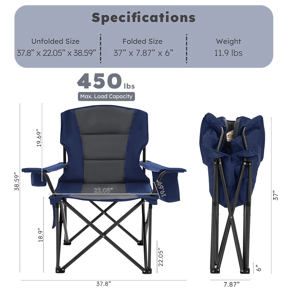 Oversized Camping Outdoor Chair Support 400 LBS Carry Bag Included, Heavy Duty Full Padded Folding Chairs with Lumbar Support, Cooler Bag, Mesh Cup Holder, Pocket for Lawn,Sport(Grey&Navy)