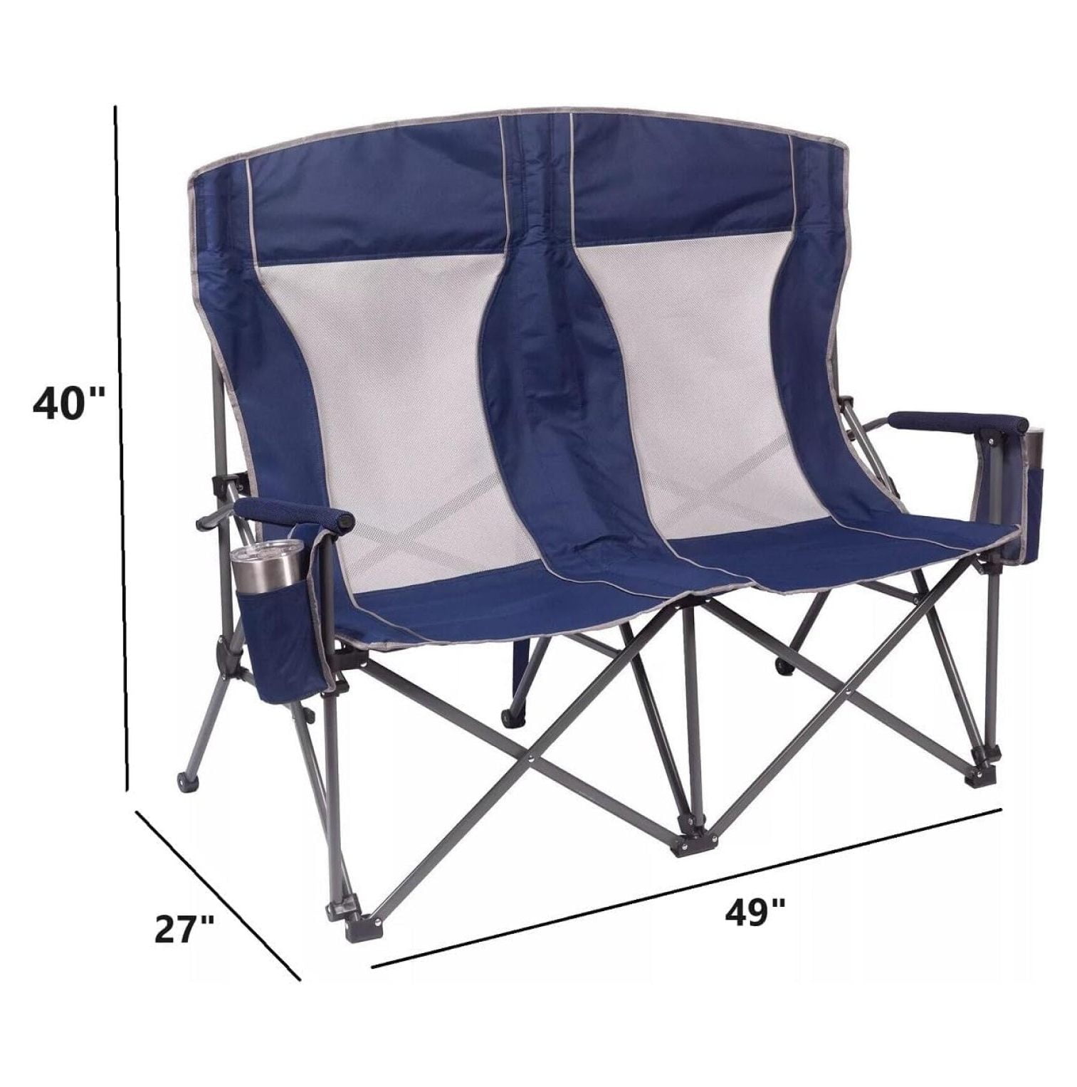 in comfort in the Oversized Double Hard Arm Chair with your spouse, child, relative or best friend at the next family gathering, sporting event or BBQ. Built with padded arms and a headrest, cool breathable moisture-wicking mesh and durable polyester fabric on a rugged steel frame offers comfort and convenience. With a 650 lbs. weight capacity, 325 lbs. per seat, this chair is sturdy and durable. The chair includes oversized drink holders, an adjustable carry strap, folds compactly for storage or transport and includes a carry bag for convenience.