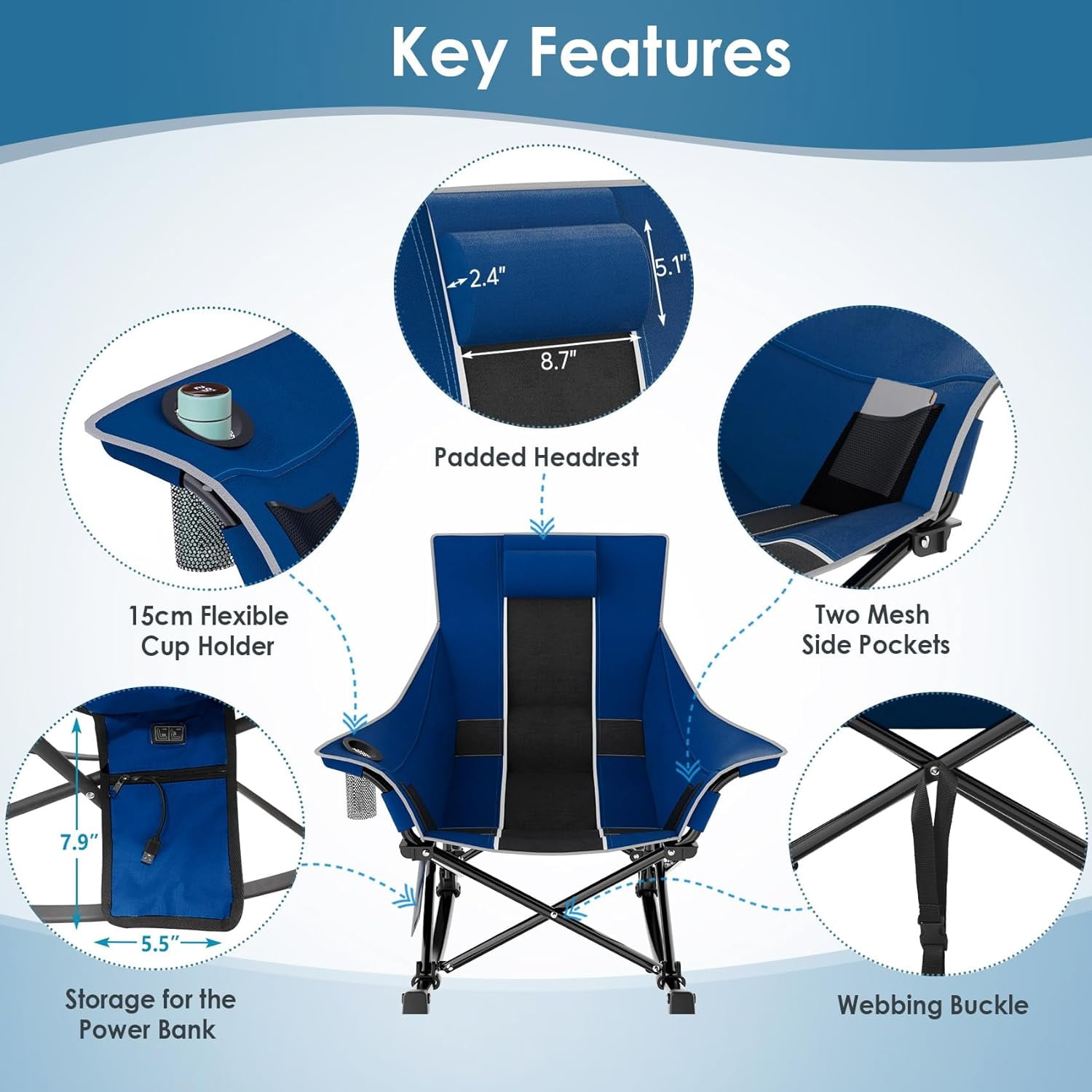Oversized Heated Camping Chair, XL Rocking Camping Chair W/3 Heat Levels for Back & Seat, Portable Folding Heated Chairs Outdoor Sports for Patio Lawn Outdoor Travel, Power Bank(Not Included)