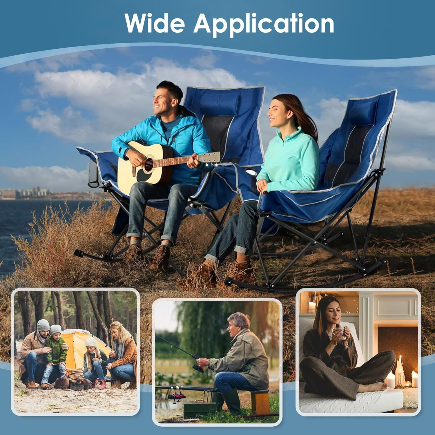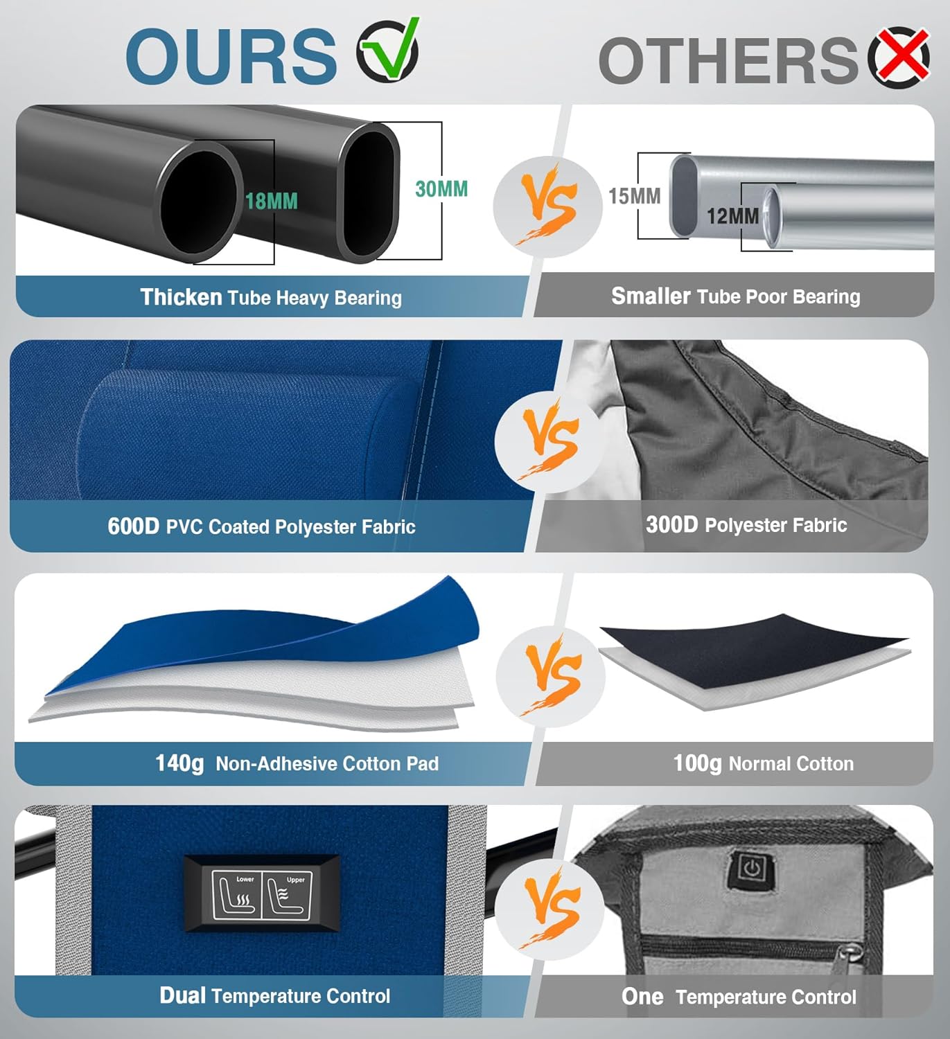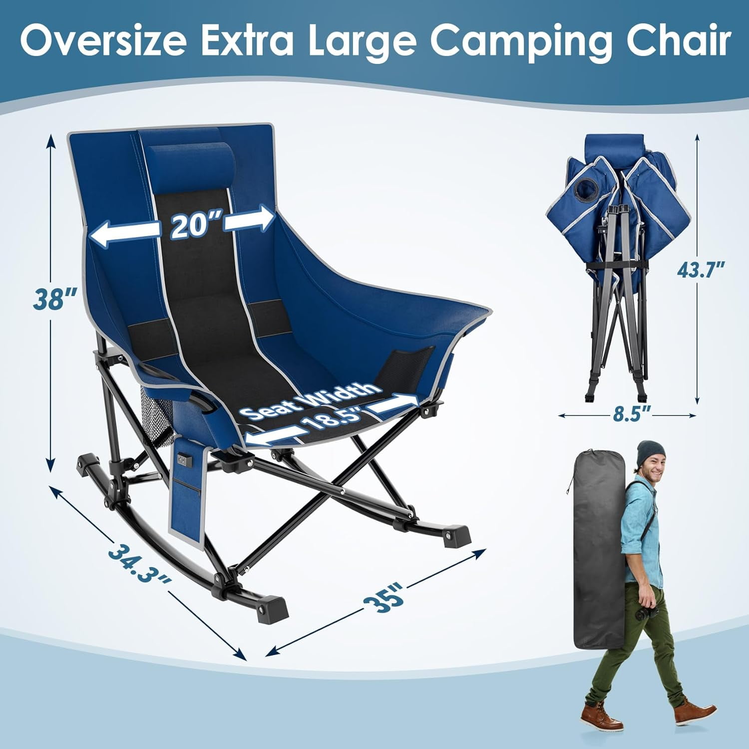 【TIPS】This oversized camping rocking chair comes with a USB connector cable and does Not INCLUDE a power bank. 【Advanced 3-Level Dual Heating Zones】The heated chair features three heating settings (blue for low, white for medium, and red for high), providing personalized comfort. The dual control buttons allow separate adjustment of the temperature for the back and seat positions, customizing the warmth to your preference. The heated camp chair utilizes USB-powered heating technology. The warmth safely penetrates the body. 【Ultimate Comfort & Portable Design】Premium upright cotton padding ensures exceptional comfort and back support. The fully padded and comfortable armrests, high backrest, and cozy rocking chair seat provide you with a comfortable seating experience. The smooth rocking design helps you relax and enjoy the breeze on your journey. This heated lawn chair has a storage size of 43.7″ x 8.5″ and comes with a convenient carrying bag, making it easy to transport this outdoor heated chair anywhere you go. 【Thoughtful Design】This portable rocking camping chair is equipped with a unique back mesh pocket and a beverage cup holder. There is an integrated side pocket on each armrest, allowing you to free up your hands during camping, hiking, traveling, or watching sports events. This makes it easy to store your sunglasses, books, and phone within arm’s reach. The beverage cup holder has a diameter of 3″ and a depth of 5.9″, accommodating water bottles and other beverage cans. 【Premium Materials】The heated sports chair is constructed with a sturdy steel frame, double-layered and durable 600D Oxford fabric, and secure X-shaped brackets that have interwoven straps in the middle to prevent leg pinching. The fabric with PVC coating is waterproof, and the chair is filled with a 140g non-glue cotton pad, providing outstanding strength, durability, and breathability. To ensure long-term use of the chair, it is recommended not to exceed a weight capacity of 330 lbs.