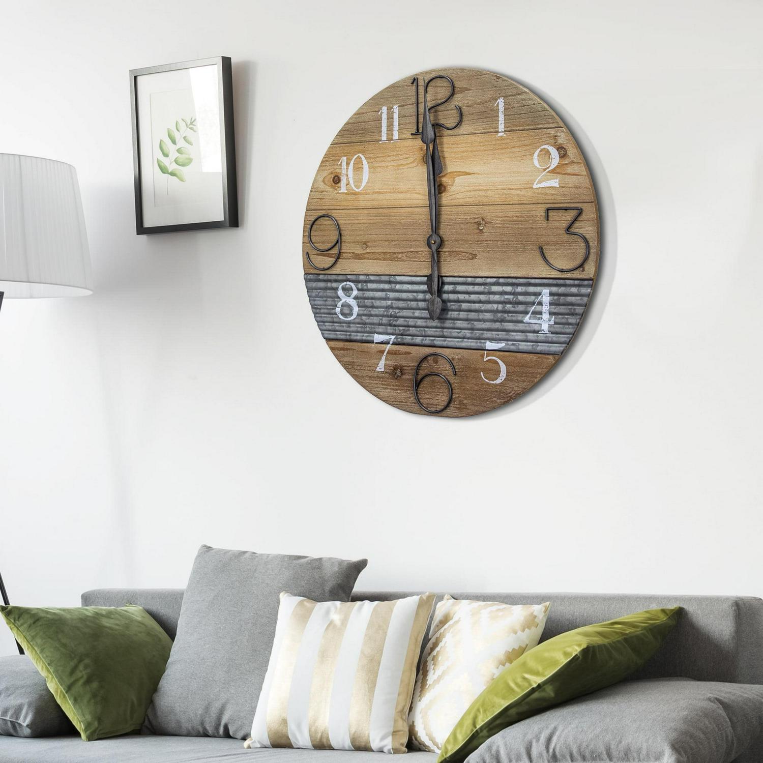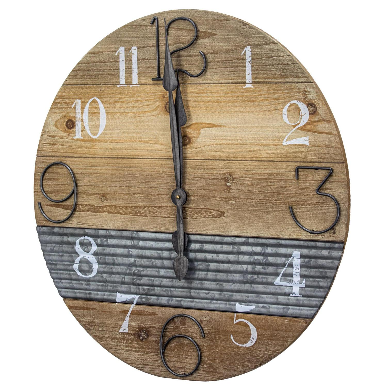 Don t let time stand still on this oversized wood and metal hanging farmhouse wall clock. Made from panels of rustic wood and corrugated galvanized metal, this rustic wall decor piece offers up that farmhouse charm and flair with subtlety and style. The 12, 3, 6 and 9 o clock hour indicators on this oversized wonder are made from metal, giving the clock a dimensional and tactile element. The remaining numbers are rendered in white paint which covers both the wooden and metal portion of the clock while the spade style hour and minute hands give the piece a classic look. This round analog clock makes for a big and bold wall decor accessory for your home as it not only serves an everyday function but it also provides a decorative accent to your home. The oversized element gives the clock undivided attention as it commands the eye to fixate onto it and holds focus with its farmhouse aesthetic and rustic charm. In addition, this oversized wall clock is battery-operated (1 AA battery required, not included), so no cords, plugs, or visible electronics will ever interfere with its timeless aesthetic. It also comes equipped with two triangle rings attached on the back, making hanging and installation quick and easy. So whether you decide to hang this beauty in your living room, kitchen, dining room or bedroom, you ll be able to keep an eye on the clock in a stylish and decorative way with a timepiece that will leave a lasting impression you can count on. PRODUCT SPECS: Dimensions: 23.5 H x 23.5 L x 1.5 D Weight: 5.25 lbs Contains two triangle rings for hanging Requires one AA battery Battery not included