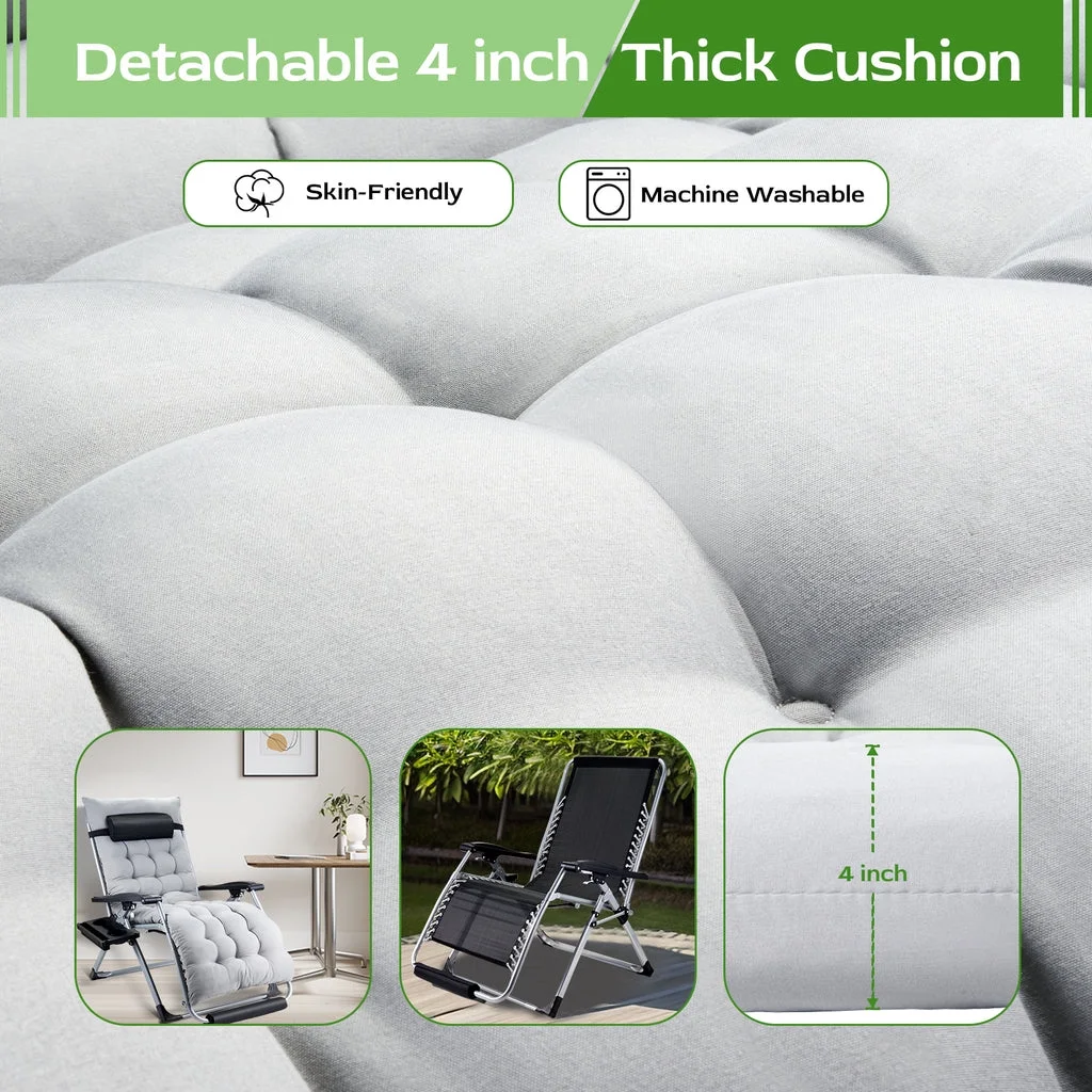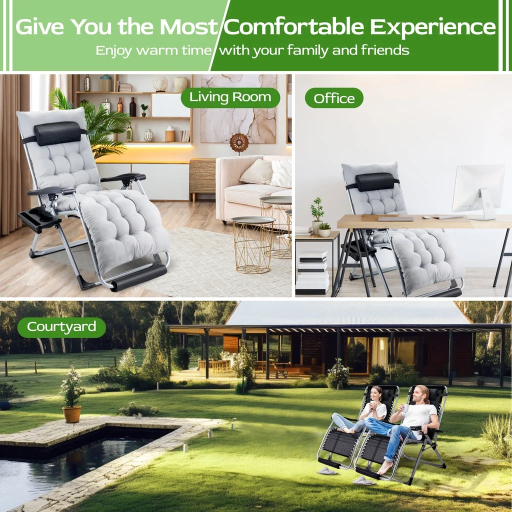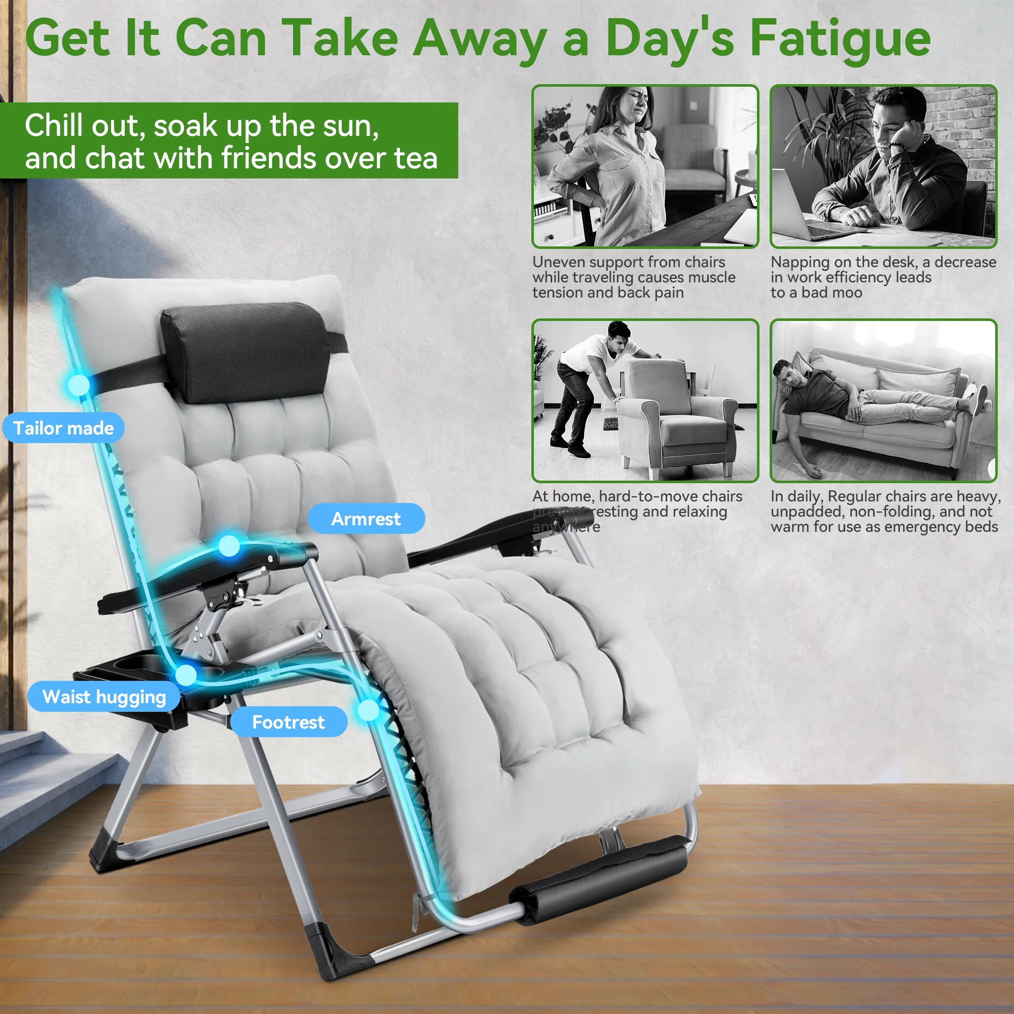 Reclining Lounge Chair with Removable Cushion & Tray [OVERSIZED XXL SIZE]💺💺💺💺💺💺💺 Set up size is 29″W x 31″D x 45″H, Folding size is 31″W x 33″L x 5.7″H. Cushion Pad is 70″L x 33″W. CHAIR WEIGHT is 22lbs.The WEIGHT CAPACITY is 500lbs. [LONG-LASTING & DURABLE USE]💺💺💺 The zero gravity chair can take 440-500 pounds of weight. This outdoor patio reclining chair is extra durable and will last you a lifetime. This professional outdoor padded lounge chair is built with premium quality materials, which provide increased durability and resistance. [COMFORTABLE & ERGONOMIC DESIGN]💺 The zero gravity chair is designed to satisfy your ultimate comfort. The armrest of outdoor padded lounge chair is thick and contoured. It will serve you whether sitting or lying, outdoor and indoor. Our folding lounge chair comes with a thick and soft pad, and the ergonomic design of this outdoor recliner chair can relieve pressure on your spine, improve circulation, and reduce muscle tension. [ADJUSTABLE & ZERO-GRAVITY CHAIR]💺💺 Our folding lounge chair has an adjustable design that can be adjusted from 110 to 170-degree angle. This amazing feature of outdoor recliner chair helps you select the optimal angle that brings you to a comfortable, relaxing position. Simply push the clip to unlock the position, and pull the clip back to secure it at your desired position. [WIDELY APPLICATION]💺💺💺💺💺💺💺💺 Whether relaxing by reading a book or getting a quick break, this comfortable outdoor patio reclining chair is your one of the best choice. This padded lounge chair can be used indoors, for outdoor activities, such as family gatherings, BBQs or beach day, or at the office, lawn and yard. [REMOVABLE SOFT PAD]💺💺💺💺💺💺💺 Intuitive design features that this outdoor recliner chair can be used by anybody. You can remove the soft cushion from outdoor patio reclining chair to promote better airflow durin.Whether it’s summer or winter, you deserve it.