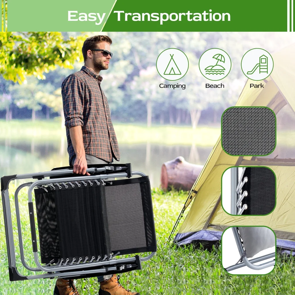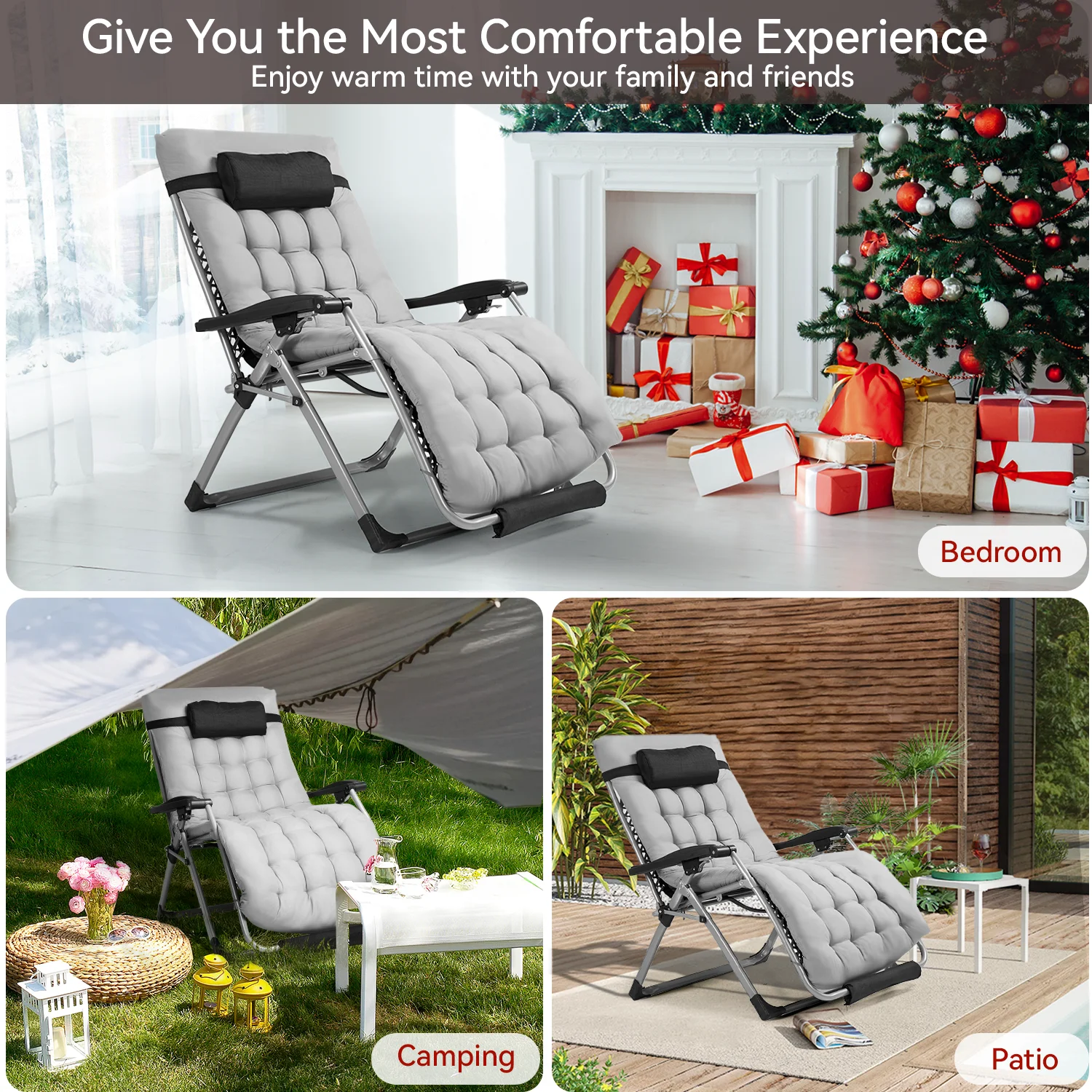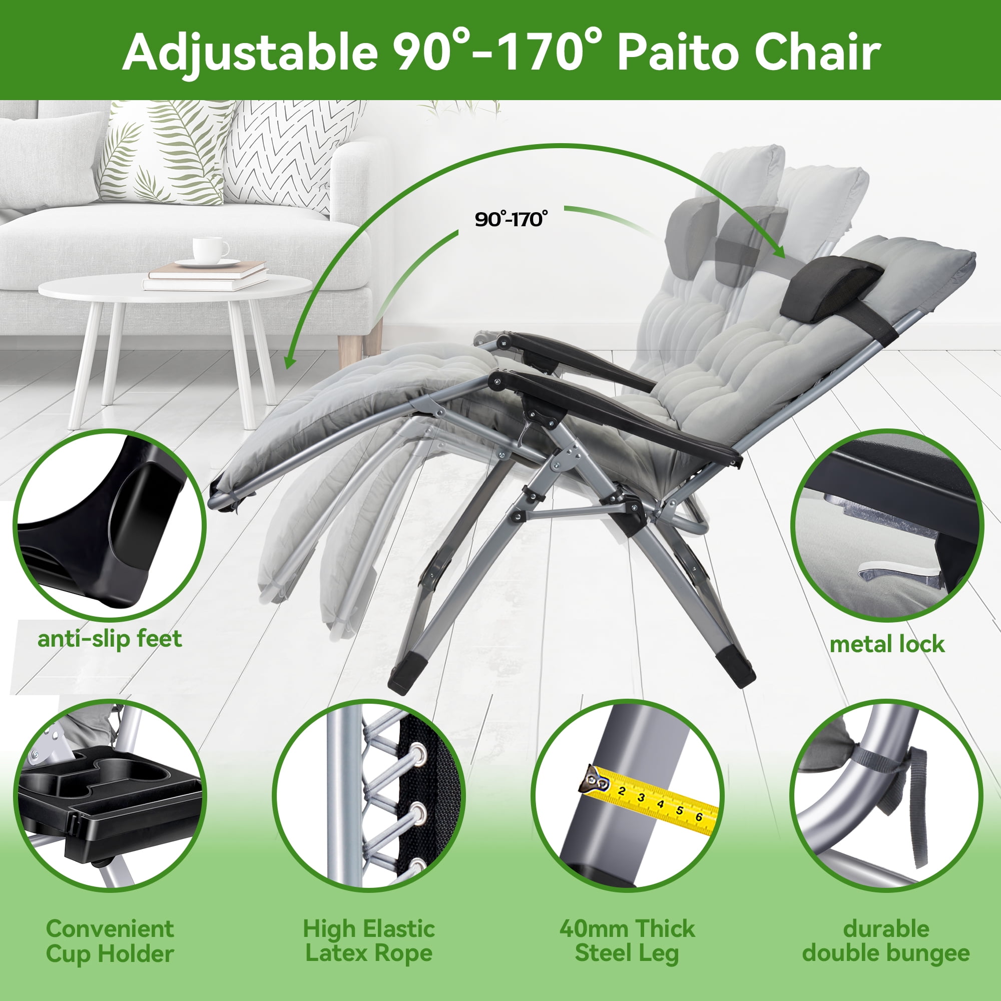 Reclining Lounge Chair with Removable Cushion & Tray [OVERSIZED XXL SIZE]💺💺💺💺💺💺💺 Set up size is 29″W x 31″D x 45″H, Folding size is 31″W x 33″L x 5.7″H. Cushion Pad is 70″L x 33″W. CHAIR WEIGHT is 22lbs.The WEIGHT CAPACITY is 500lbs. [LONG-LASTING & DURABLE USE]💺💺💺 The zero gravity chair can take 440-500 pounds of weight. This outdoor patio reclining chair is extra durable and will last you a lifetime. This professional outdoor padded lounge chair is built with premium quality materials, which provide increased durability and resistance. [COMFORTABLE & ERGONOMIC DESIGN]💺 The zero gravity chair is designed to satisfy your ultimate comfort. The armrest of outdoor padded lounge chair is thick and contoured. It will serve you whether sitting or lying, outdoor and indoor. Our folding lounge chair comes with a thick and soft pad, and the ergonomic design of this outdoor recliner chair can relieve pressure on your spine, improve circulation, and reduce muscle tension. [ADJUSTABLE & ZERO-GRAVITY CHAIR]💺💺 Our folding lounge chair has an adjustable design that can be adjusted from 110 to 170-degree angle. This amazing feature of outdoor recliner chair helps you select the optimal angle that brings you to a comfortable, relaxing position. Simply push the clip to unlock the position, and pull the clip back to secure it at your desired position. [WIDELY APPLICATION]💺💺💺💺💺💺💺💺 Whether relaxing by reading a book or getting a quick break, this comfortable outdoor patio reclining chair is your one of the best choice. This padded lounge chair can be used indoors, for outdoor activities, such as family gatherings, BBQs or beach day, or at the office, lawn and yard. [REMOVABLE SOFT PAD]💺💺💺💺💺💺💺 Intuitive design features that this outdoor recliner chair can be used by anybody. You can remove the soft cushion from outdoor patio reclining chair to promote better airflow durin.Whether it’s summer or winter, you deserve it.