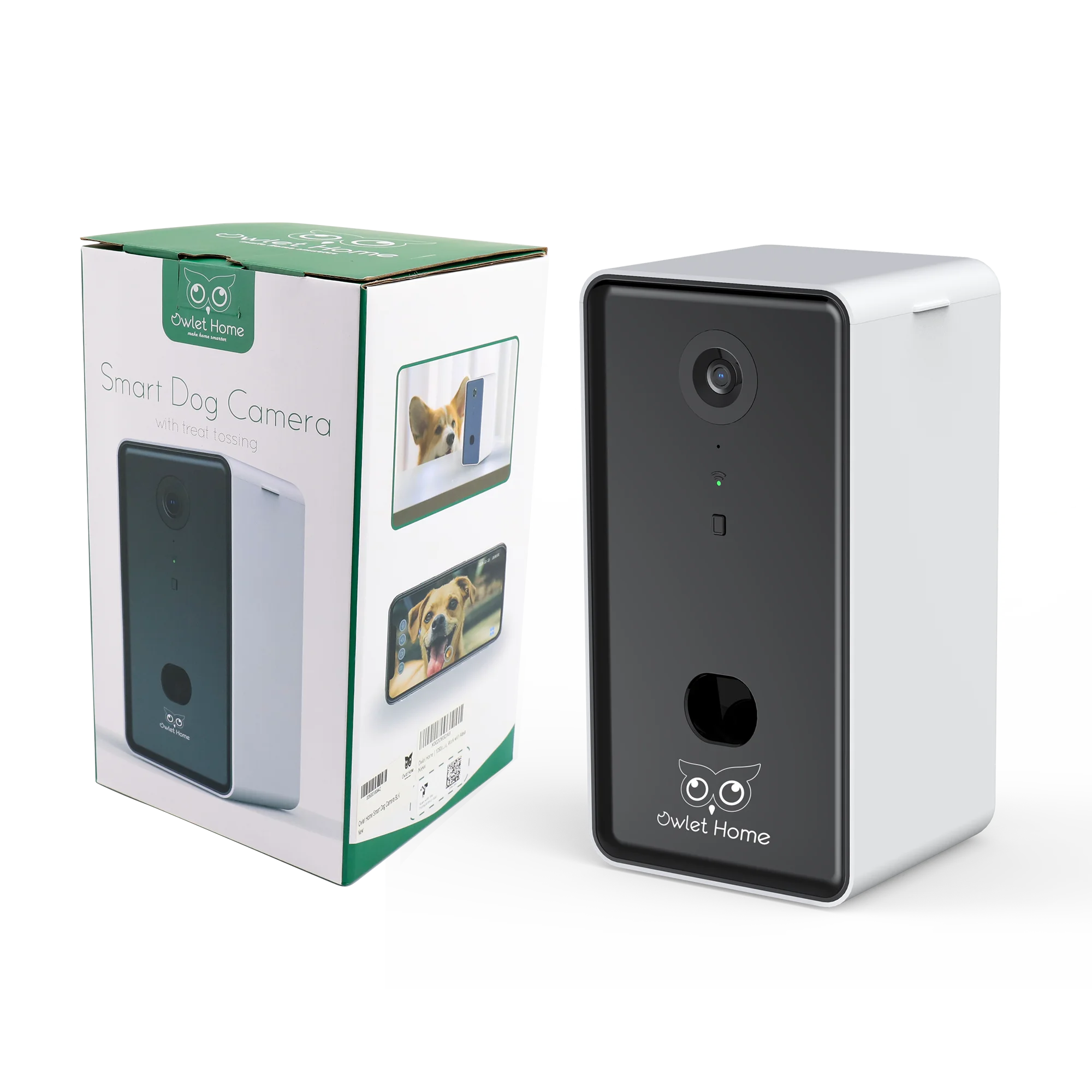 Watch & Talk Anytime: Keep an eye on your furry friend and chat with them through the free app or Alexa – because they miss you too! Super Easy Setup: Unbox, plug in, and connect via Bluetooth, QR code, or WiFi. You’ll be up and running in no time – pet-approved! Toss Treats Like a Pro: With a tap on your phone or a manual toss, delight your pet with their favorite dry treats – the amount dispensed depends on the treat size! Just remember, it’s not for medicated treats, but you’ll still be their hero even when you’re away! Scheduled Treat Time: Plan treat tosses and control portions through the app, making sure your pet gets their treats on time and in just the right amount, even when you’re away. Crystal-Clear Views: Enjoy 1080P HD video and night vision, so you never miss a whisker, day or night! Clear Conversations: Chat with your pet using the built-in speaker and microphone – it’s like FaceTime, but for pets! Fun Voice Feature: Record your voice and let your pet hear your soothing words as you toss a treat – it’s like you’re right there with them! Advanced Pet Sitter: Motion detection keeps you updated on your pet’s every move – perfect for sneaky paw prints. Pet-Approved Compatibility: Works with iOS 7.0+ and Android 5.0+ devices, supporting 2.4GHz & 5GHz WiFi. Guaranteed Smiles: With a 30-day money-back guarantee, 12-month warranty, and tech support, you and your pet are in great hands. What’s in the Box 1x Smart Dog Camera 1x Power adapter & USB Cable (9.8 feet or 3m) 1xQuick Start Guide About Us: Owlet Home is a California-based team of devoted pet lovers with one mission: to make life better for you and your furry friends. Since 2019, we’ve been designing smart pet tech that keeps you connected to your pets, whether you’re home or away. Our unique products help you monitor their health, toss treats, and add a little extra joy to their day, all while giving you peace of mind. We believe that when pets are happy, homes are happier, and we’re proud to be a part of that bond between you and your pet.