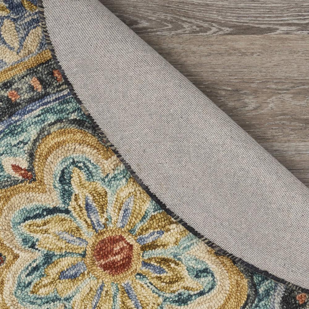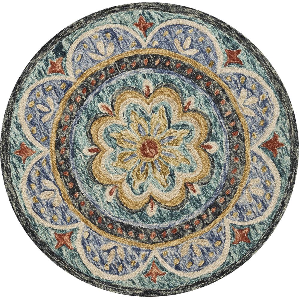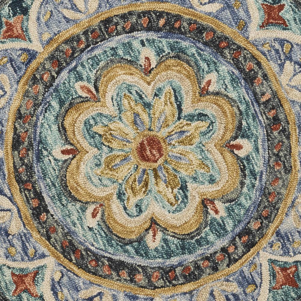 Who could deny the beauty of adding this piece to your home The flower with its huge petal border on this piece is a beautiful transition from a soft tufted rug to hard flooring. The color combination, especially with the soft Blues & yellow, is an easy match for a variety of spaces. Easily placed in your living area, foyer, bedroom, or even in an office this piece is sure to thrill. Hand tufted in India, this piece has been made with intricate craftsmanship from hardworking hands to your home.