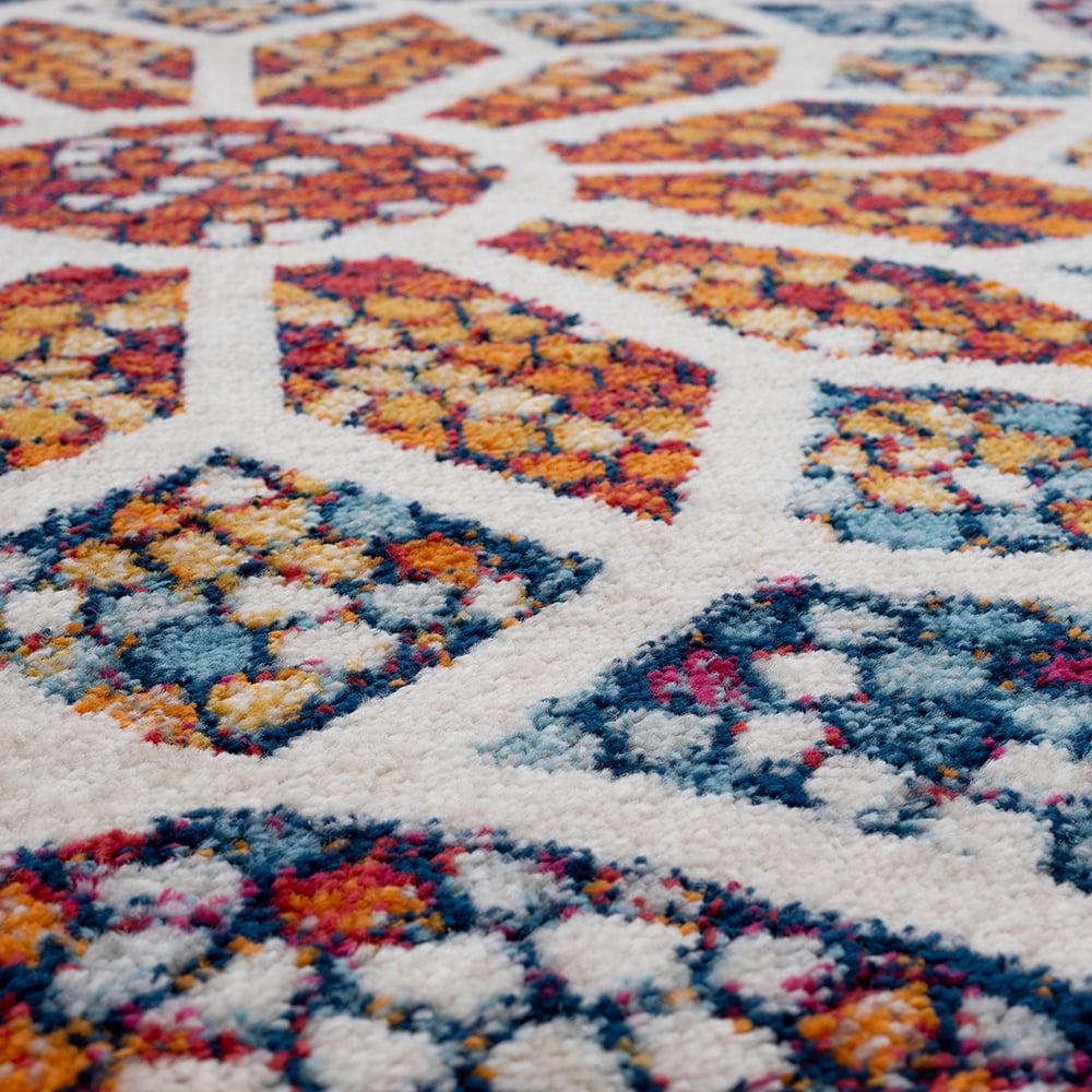 The finest details can be found in this beautiful mosaic rug. This piece is a must have for the home looking to add some bright and intricate patterns into their space. This multiple toned hue rug goes well with a variety of different color combinations with its variety of shades. This piece would make a great addition to a bedroom, modern living area, creative playroom, or even in an office space. Look forward to many years of functional style by bringing this piece home today!