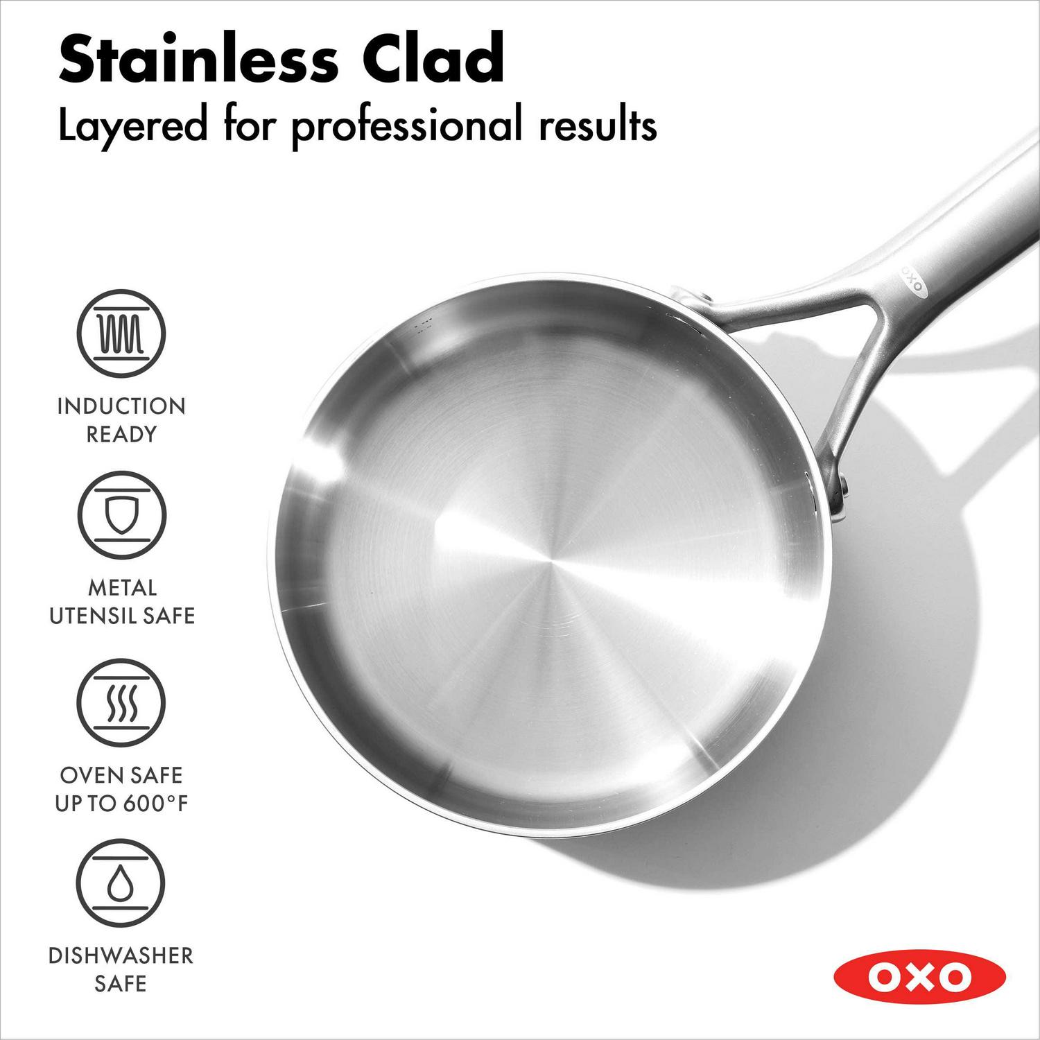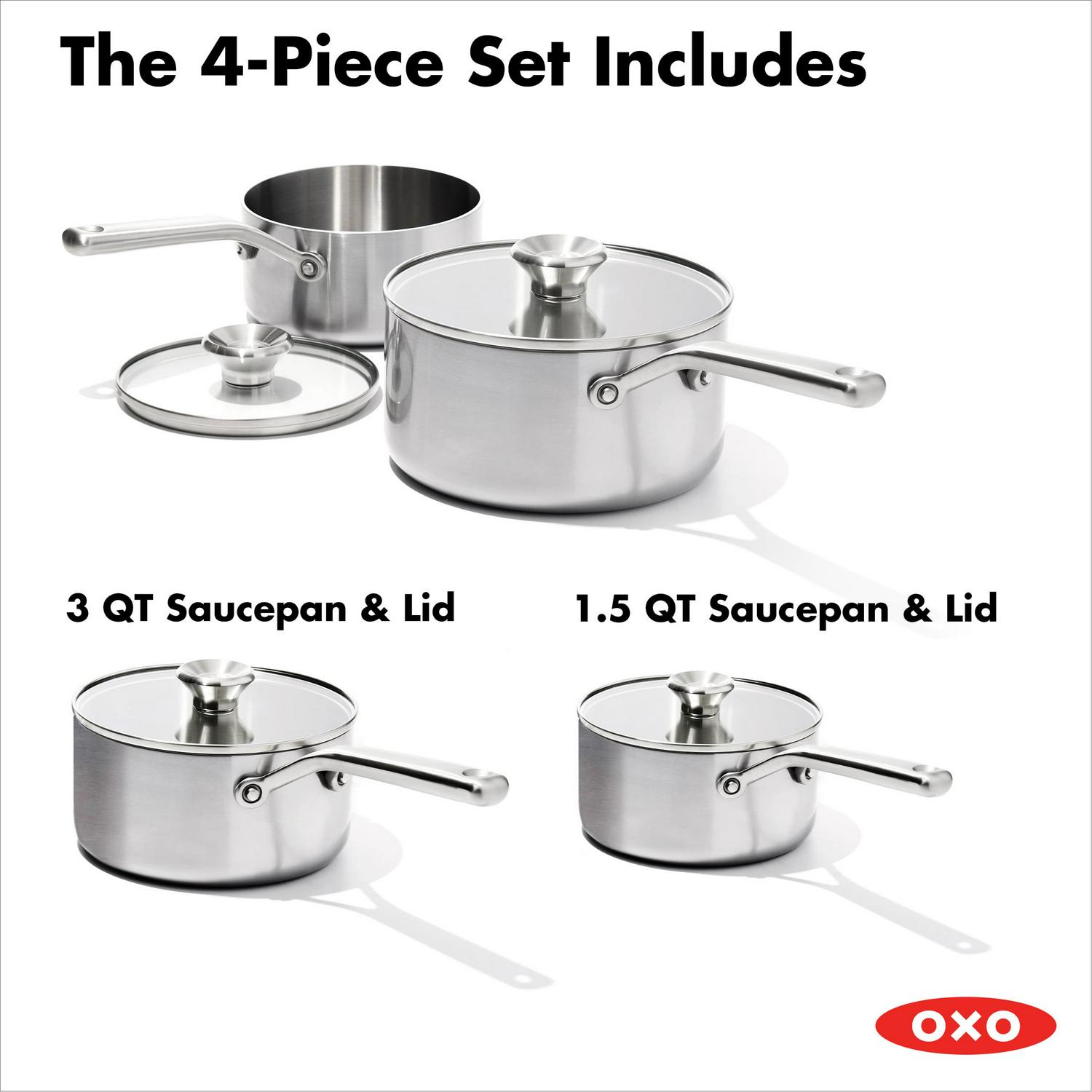 The OXO Mira 3-ply stainless steel collection is high-performance tri-ply built for modern kitchens. This saucepan set is perfect for making sides, simmering soups, and crafting sauces. Each piece is crafted with two stainless steel layers and a heat-radiant aluminum core to deliver fast and even cooking. A stain-resistant finish on each exterior prevents heat discoloration. Lightweight, contoured stainless steel handles keep cooking comfortable while the streamlined rivets eliminate food traps for a seamless, snag-free interior. Permanent markings on interior walls are great for adding stock, water, milk and other liquid ingredients. Clear, tempered glass lids make it easy to check the progress of your dish without losing heat and the double-duty knobs on each lid flips to create a rest area for tools and keep your countertop clean. The durable, all-metal construction is perfect for all stovetops, including induction, and can move directly from the stovetop to oven or the broiler. Oven safe up to 600 F, lids up to 425 F. The tri-ply Mira collection is dishwasher safe for quick and easy cleanup. The 4-piece saucepan set includes: 1.6 Qt saucepan with lid and 3.25 Qt saucepan with lid.