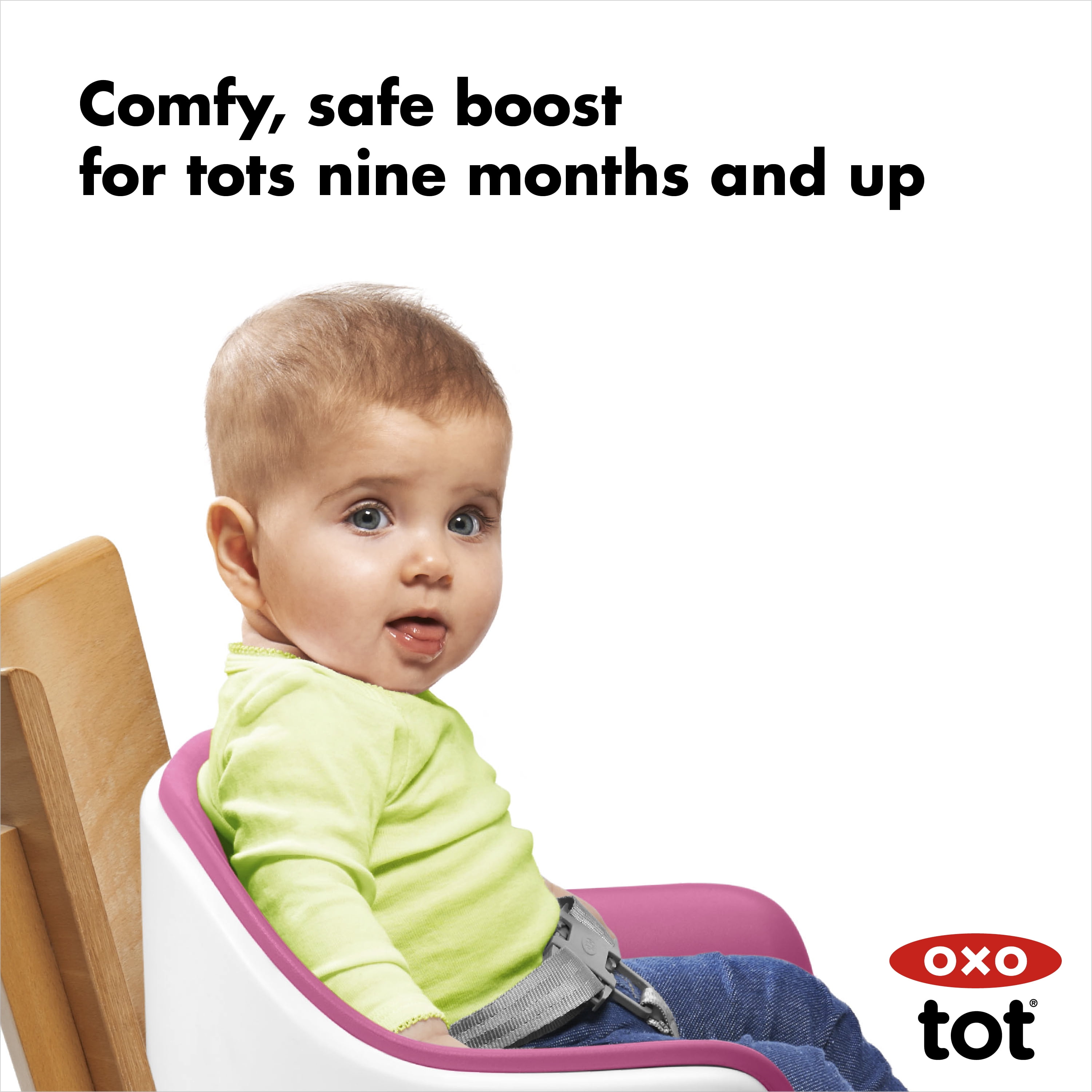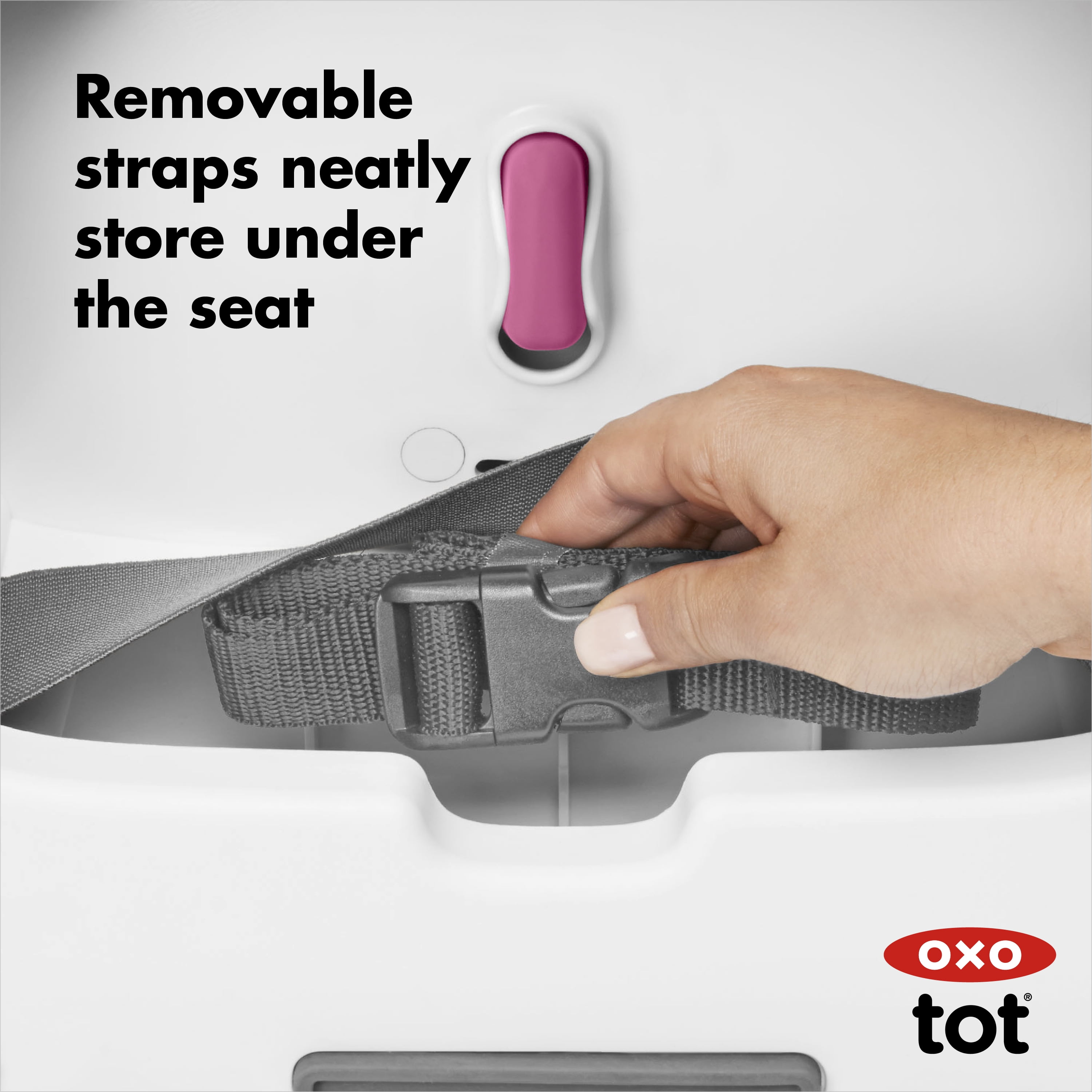 We designed the OXO Tot Nest Booster Seat with Removable Cushion to help bring kids as young as nine months kids to the family table. The soft cushion, high back, and sides make any grown-up chair comfortable for your little one. The 3-point harness with side-release buckles keeps even the wiggliest tots secure and is easy to adjust as your child grows. The removable cushion makes cleaning up after mealtime a breeze. Whether for a quick trip to Grandma or for long-term storage, the straps store neatly in a compartment under the Booster Seat.