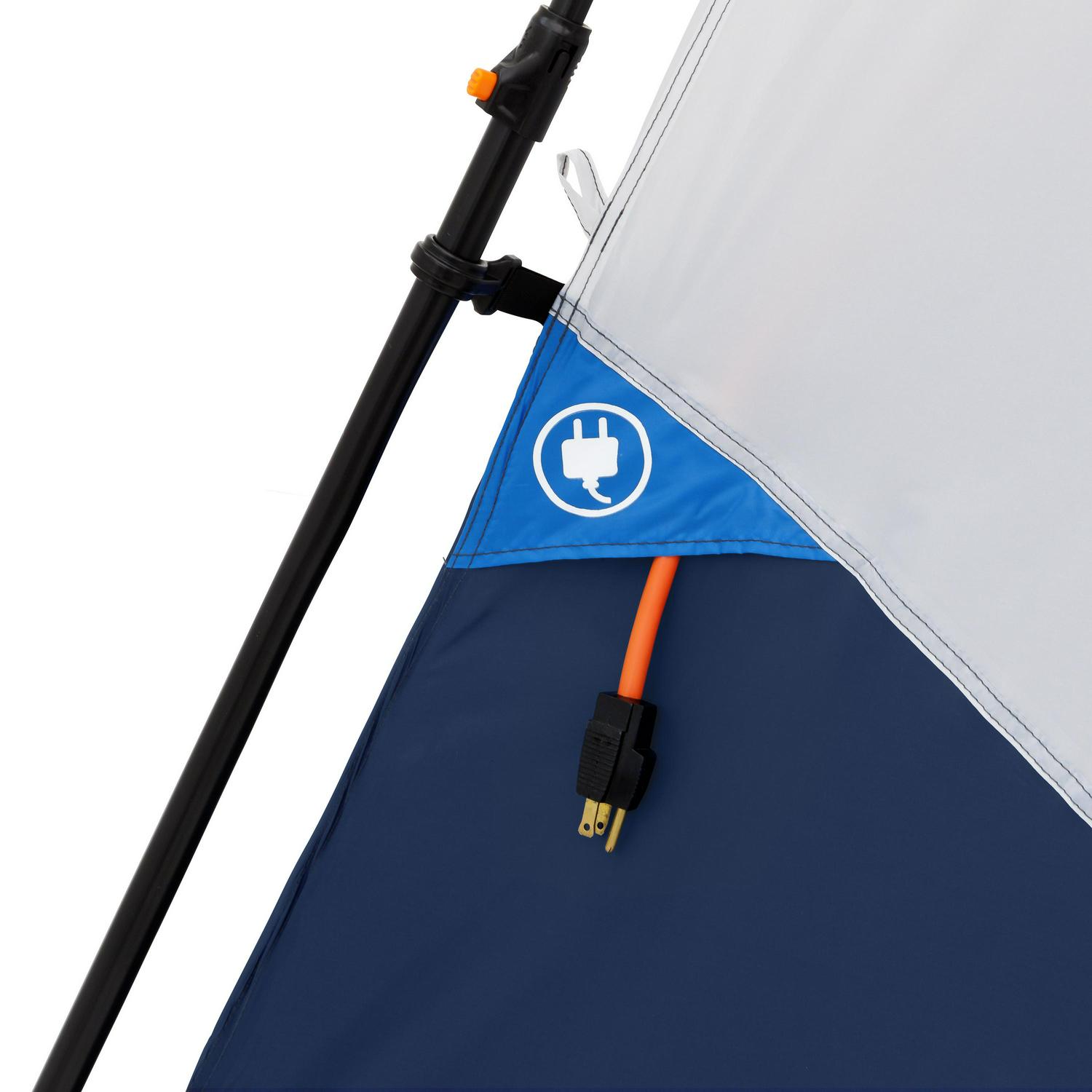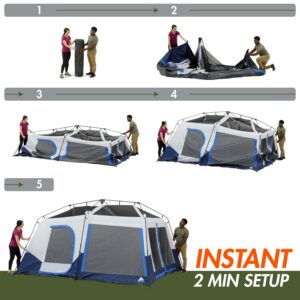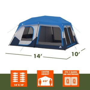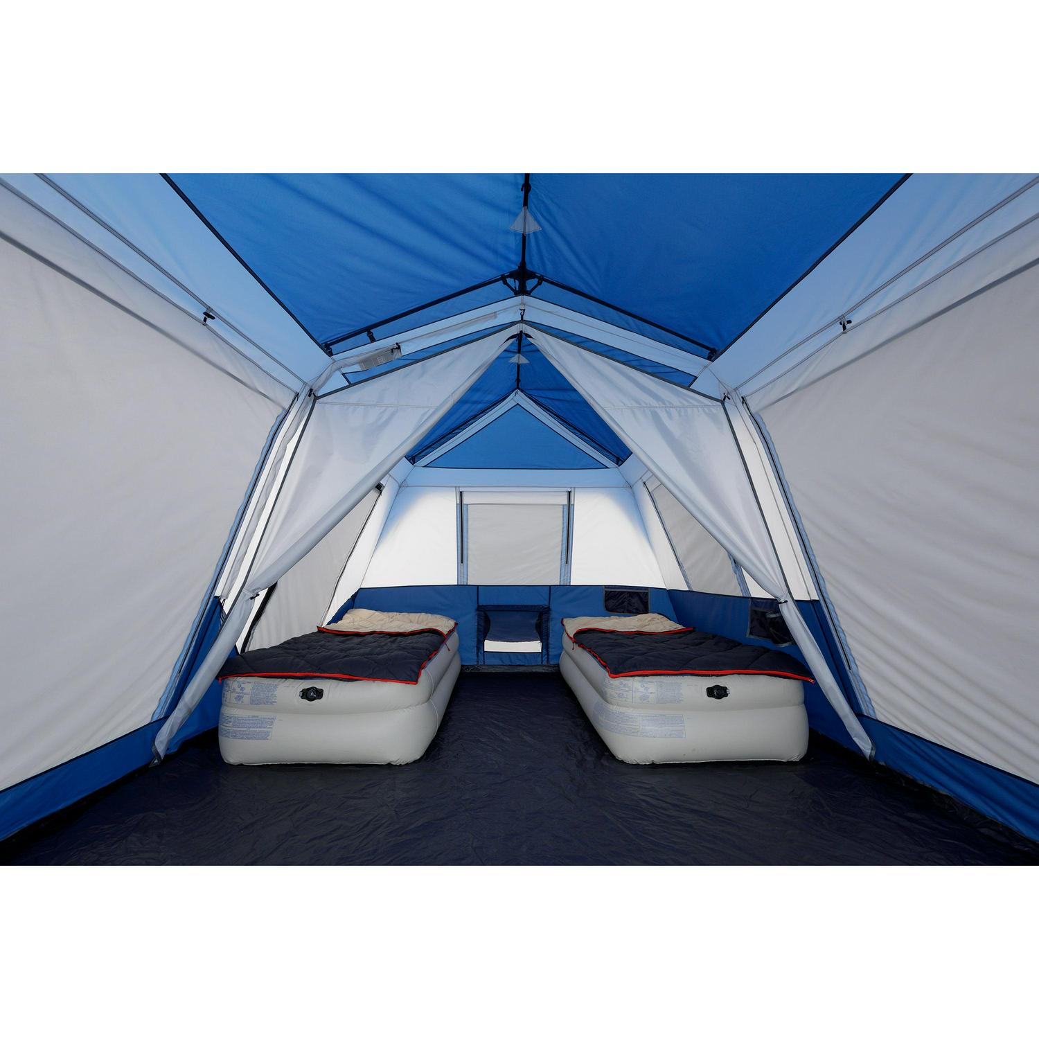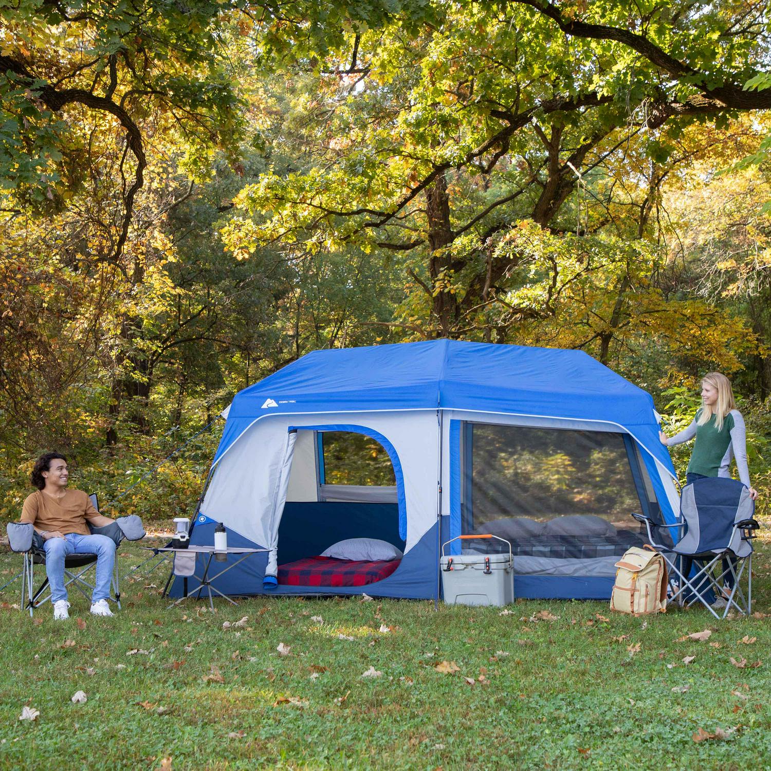 Step up your next outdoor adventure with the Ozark Trail 10-Person Instant Cabin Tent. This spacious two-room cabin-style tent requires no assembly because the poles are pre-attached to the tent, so all you need to do is unpack, unfold, and extend. This tent features seven large mesh windows and one for improved air circulation throughout the tent. This tent comfortably fits two queen airbeds or up to. Keep yourself organized and connected with the included and electrical cord access. The ambient LED-lighted poles allow for amazing light throughout the tent and can be adjusted with the settings. This tent features an anti-snag door zipper, no-see-um mesh, and 1200mm water. This Ozark Trail 10-Person Instant Cabin Tent is perfect for your next family camping adventure.