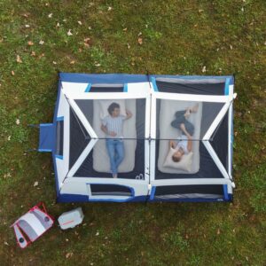 – Fits two queen airbeds or 10 campers in sleeping bags on the floor