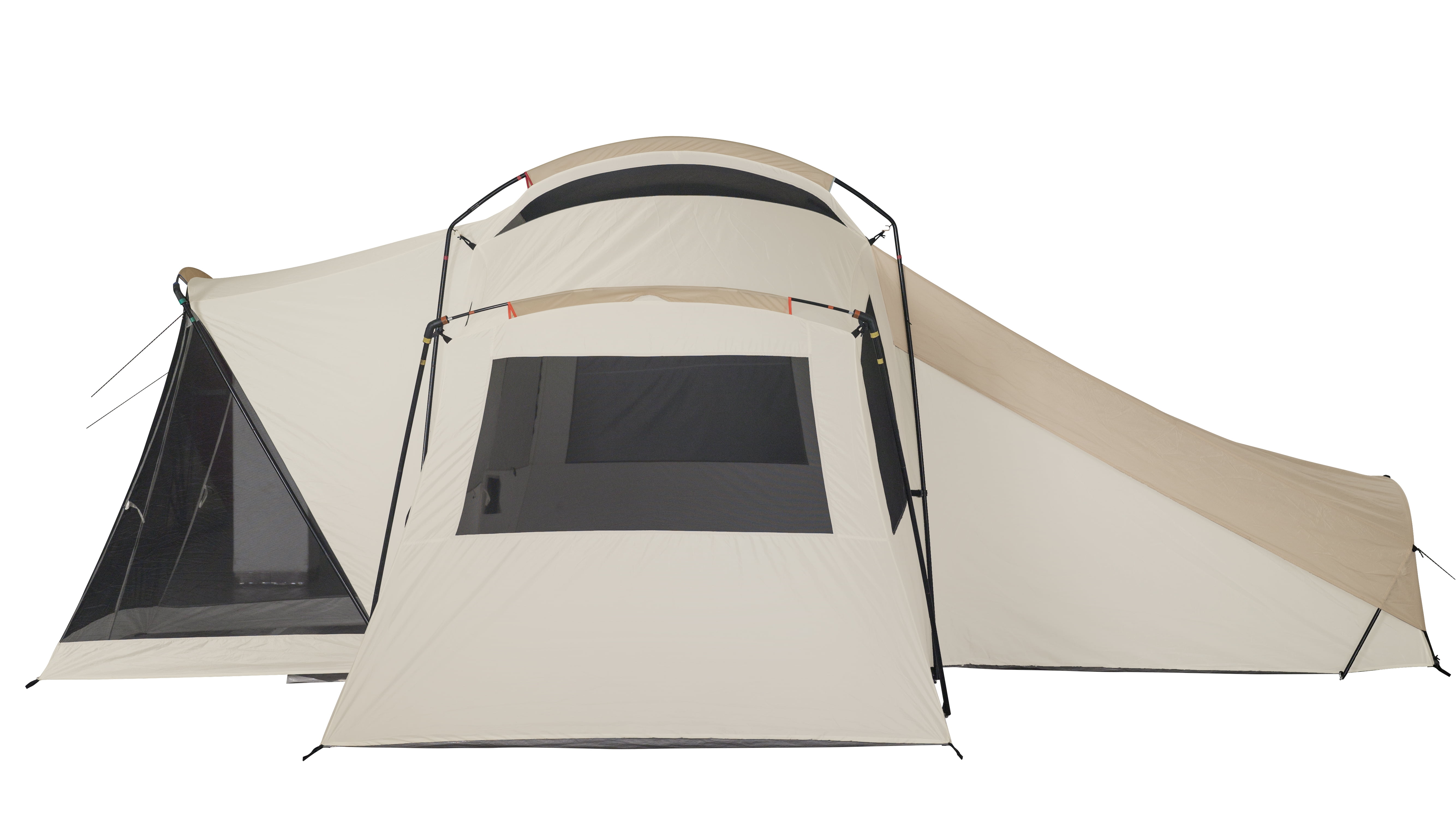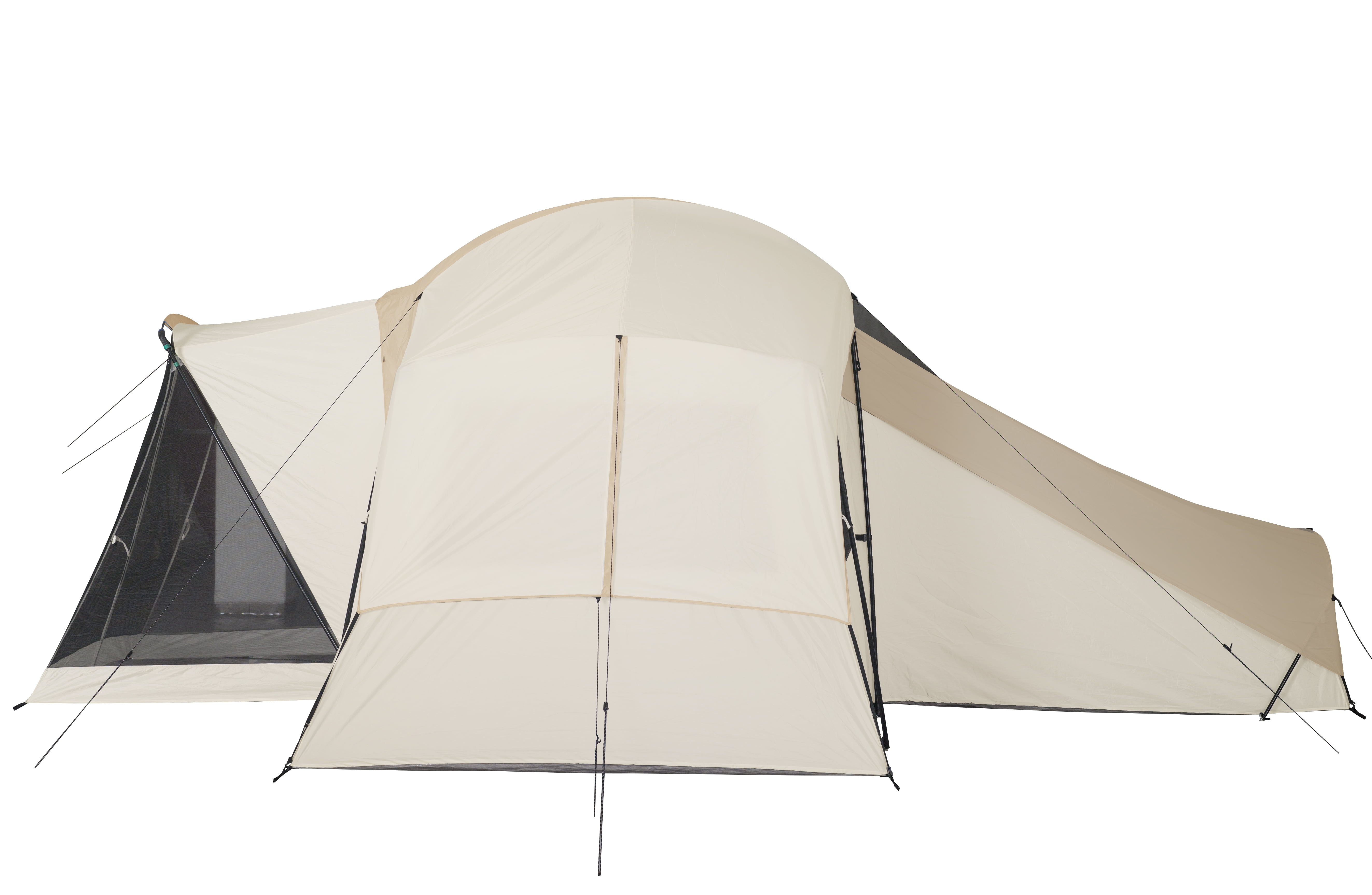 Spacious Glamping Tent for relaxing with family and friends Sleeps: 12 Large rear room with roll- back fly Large screen room sitting area 100 percent polyester with fiberglass frame. Chain corded free-standing frame system for easy set-up 6 windows and mesh roof for excellent ventilation Hanging shelves for storage Wheeled duffle carry bag 6-month replacement parts warranty