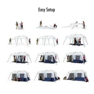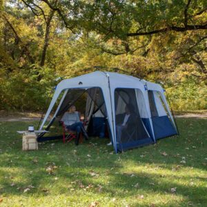 - Includes two 4-person cabin tents, one 15′ x 9′ instant shelter and one screen room