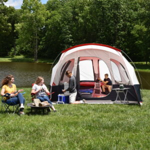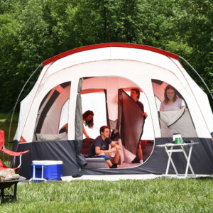 The Ozark Trail Hazel Creek 16 Person Tunnel Tent is ideal for family and group camping adventures. This tent’s unique design gives campers comfortable room to spread out. Mesh walls and roof provide great ventilation as well as the ability to stargaze in the evenings. Included Seam-Taped rainfly provides added weather protection and water-resistance when you may need it. The entryway of your tent features a built-in awning, large D-shaped doorway and a full-length mud mat; great for keeping the inside clean and debris free. Inside you’ll find a built-in room divider, for added privacy, as well as storage pockets throughout. Your tunnel tent also comes included with four sets of rope lighting, great for evening activities and features an E-port for conveniently supplying power to your devices. The Ozark Trail Hazel Creek 16 Person Tunnel Tent is convenience and comfort all wrapped in one, easy to set-up, spacious design.