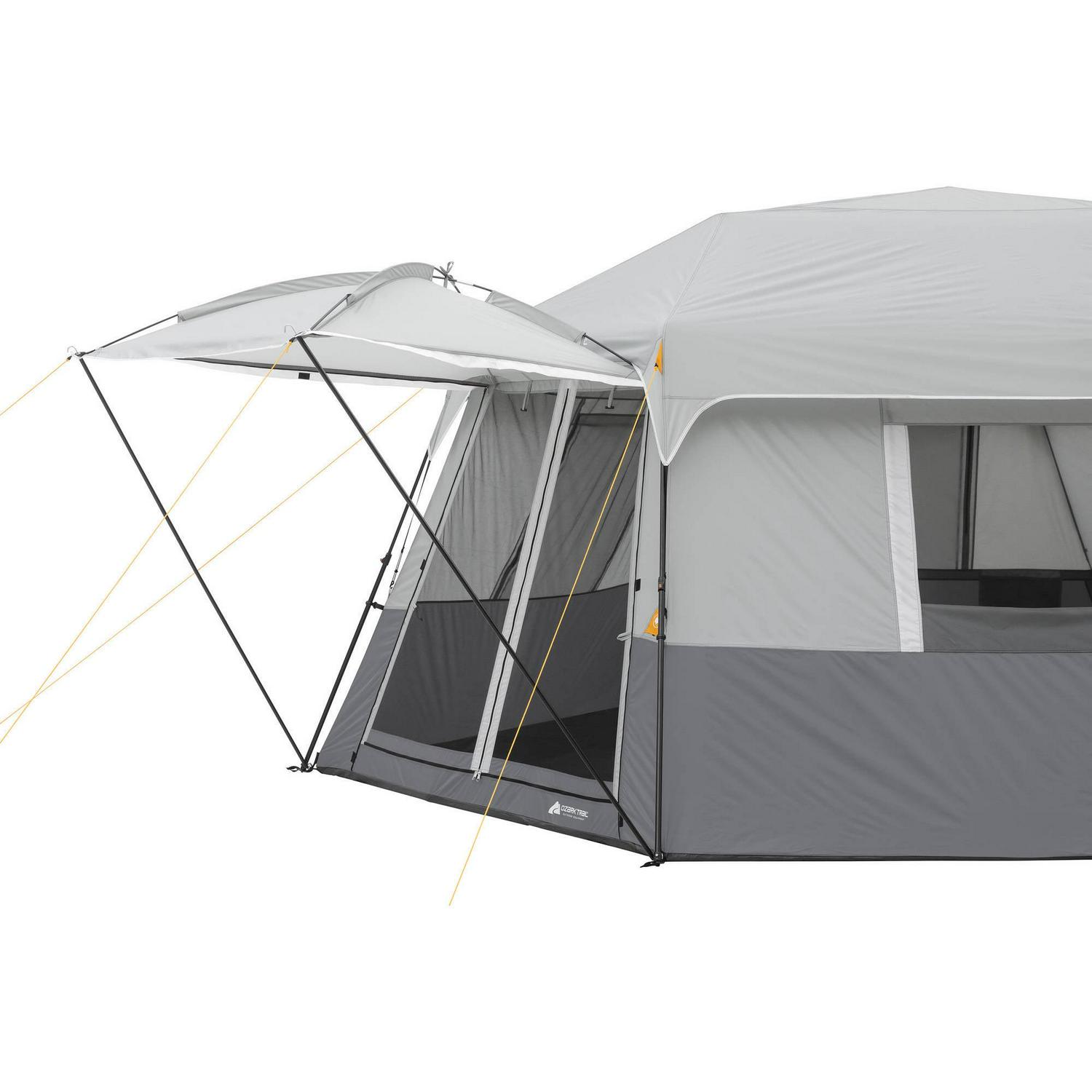 This Ozark Trail 11-Person Instant Hexagon Cabin Tent is the perfect tent to take with you on your next outdoor adventure. The innovative instant steel frame allows this tent to be set up in under two minutes for a fun and easy camping experience. This 255 square foot, 11-person instant tent requires no assembly because the poles are pre-attached to the tent, just unfold and extend. Enjoy the panoramic views with the extra-large windows, front and rear doors, and a shade porch. It will comfortably fit two queen air beds or up to 11 campers in sleeping bags on the floor. Keep yourself organized and connected with the included two storage pockets, gear loft and electrical cord access. Included are sixteen steel tent stakes to secure the tent and a tent carry bag for easy portability and storage. Make camping easy and enjoyable with the Ozark Trail 11-Person Instant Hexagon Cabin Tent. Take this tent with you on your next outdoor adventure.