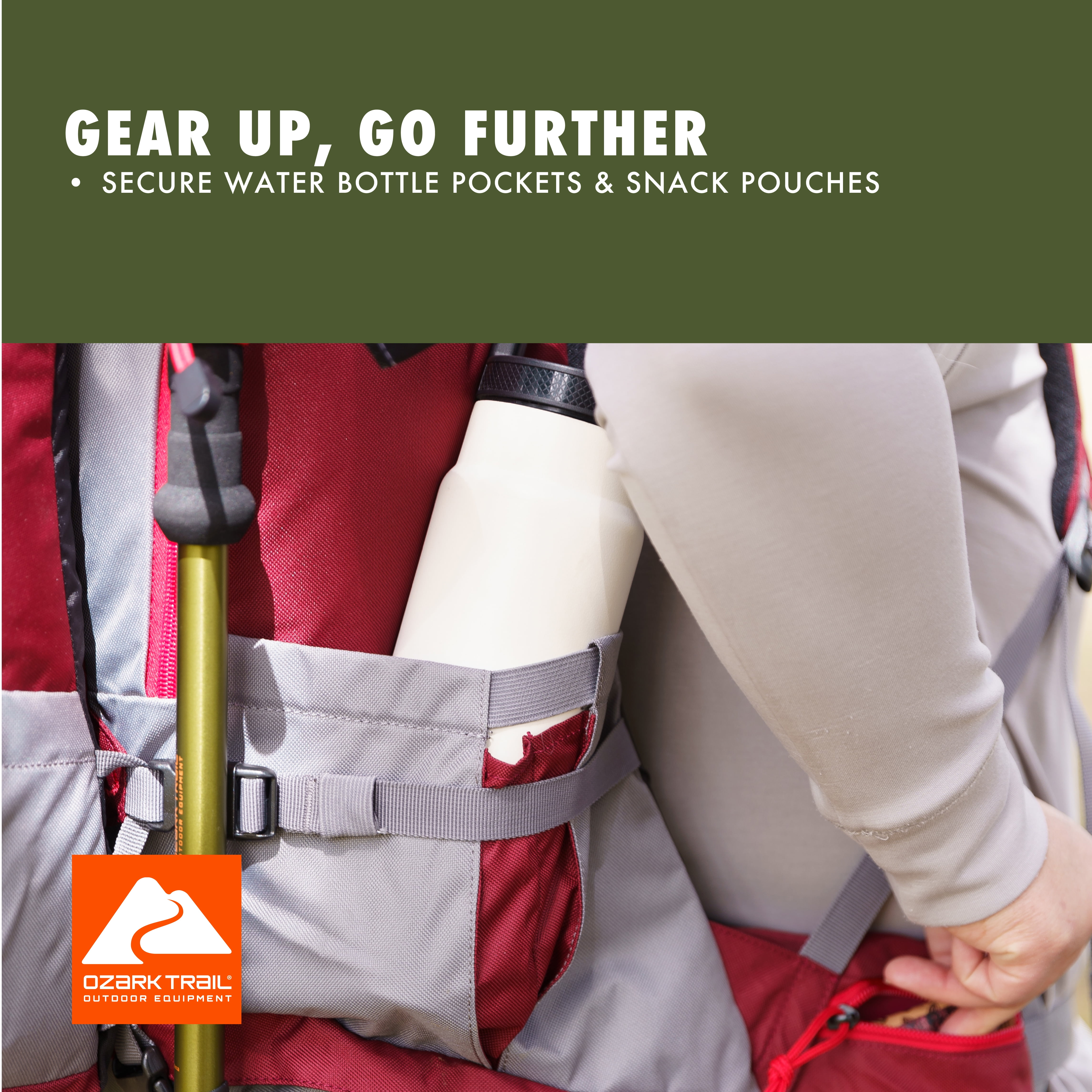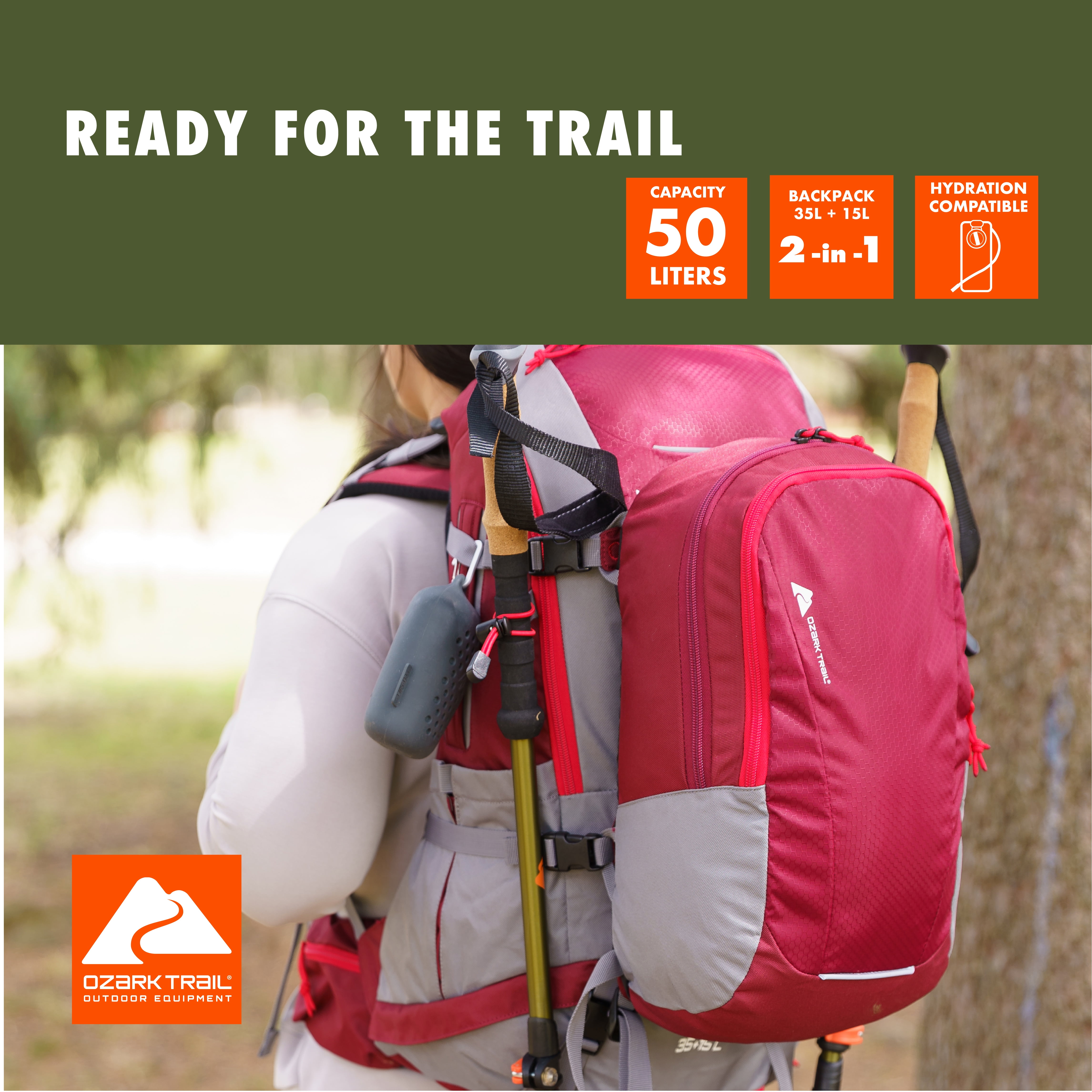 Ozark Trail 50 ltr Backpacking Backpack, Red: Material: Recycled red polyester fabric, Unisex Abrasion-resistant bottom 35-liter hiking pack with a 15-liter day pack secured with compression straps Both packs are hydration compatible Both packs feature side water bottle pockets Bottom compression straps for camp pad on larger pack Rainfly included Front accessory pocket on daypack Backpacking Capacity: 35L (hiking pack) Capacity: 15L (day pack) Product weight: 3.40 lbs 35L Dimensions (inches): : 22.84” x 13.39” x 10.24” 15L Dimensions (inches): 15.35” x 9.06” x 7.48”