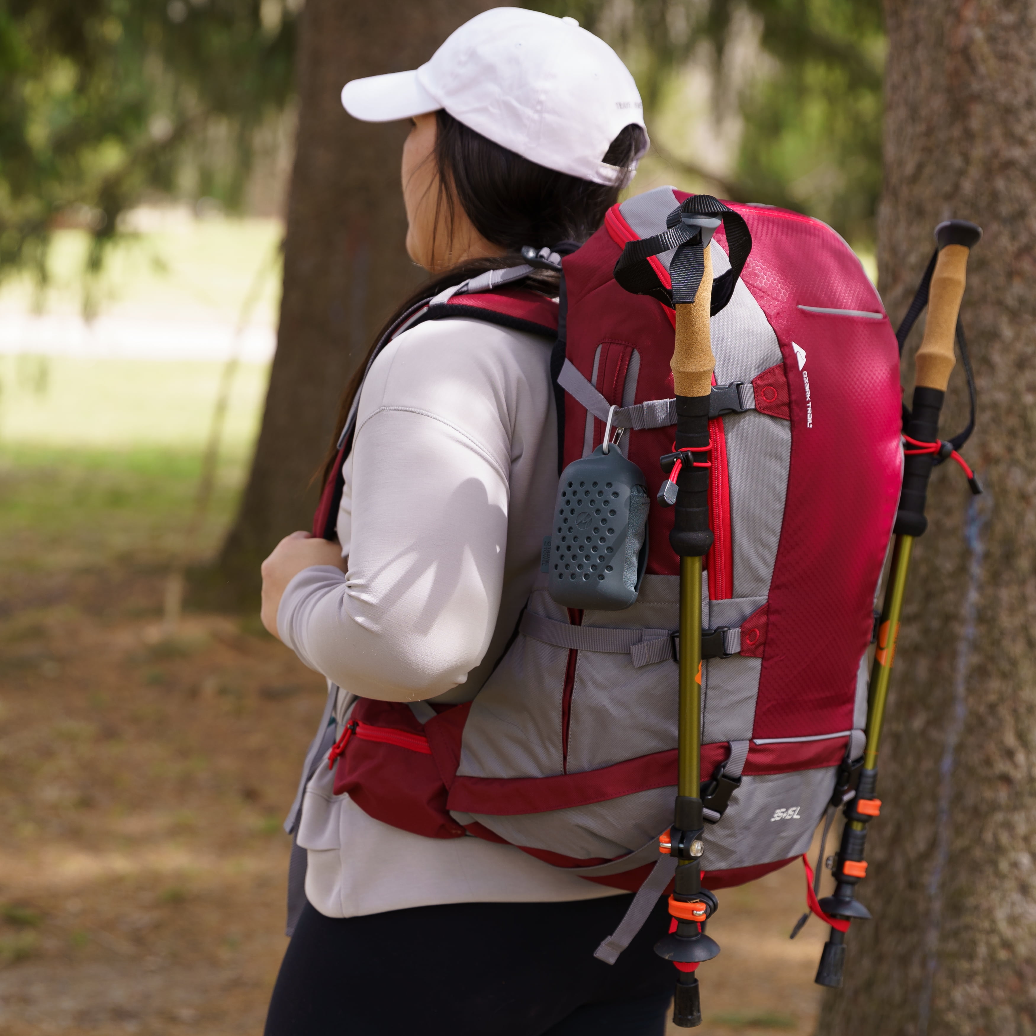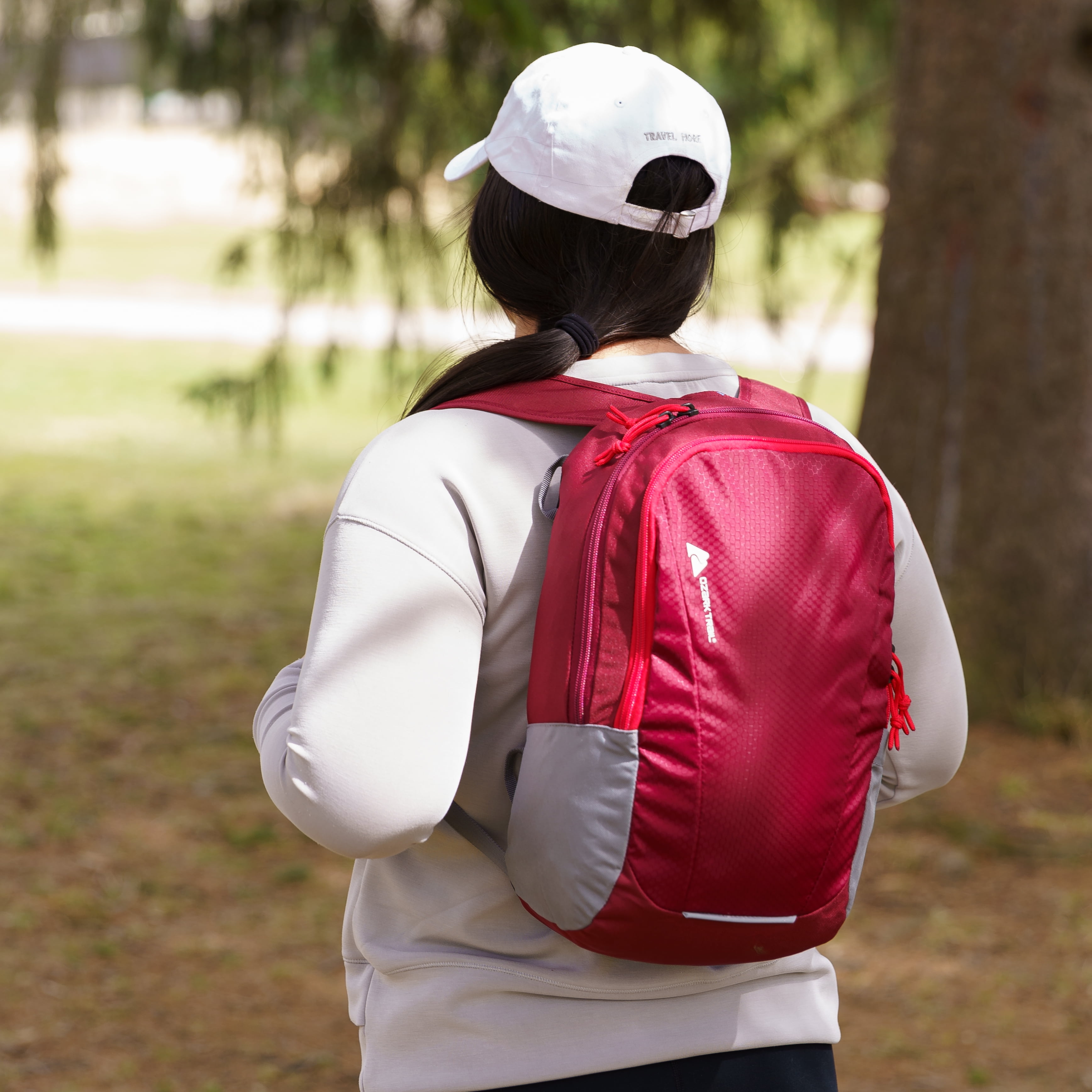 The Ozark Trail Convertible 2 in 1 Family 50L Hiking Backpack provides an innovative 2-in-1 design featuring a 35-liter hiking pack with a 15-liter day pack secured by compression straps. Each pack is hydration compatible and feature side water bottle pockets to keep refreshments within reach. On the 35-liter pack there are plenty of options for storage with a top zippered accessory pocket with a tricot-lined pocket inside for sunglasses or other important items. The larger pack also features side accessory pockets for extra storage and an ultra-padded back panel and waist belt for added comfort. There are also bottom compression straps for camp pads or other items. Other features include a rainfly and reflective accents for safety when hiking and the red recycled polyester fabric material is a perfect unisex backpacking option.