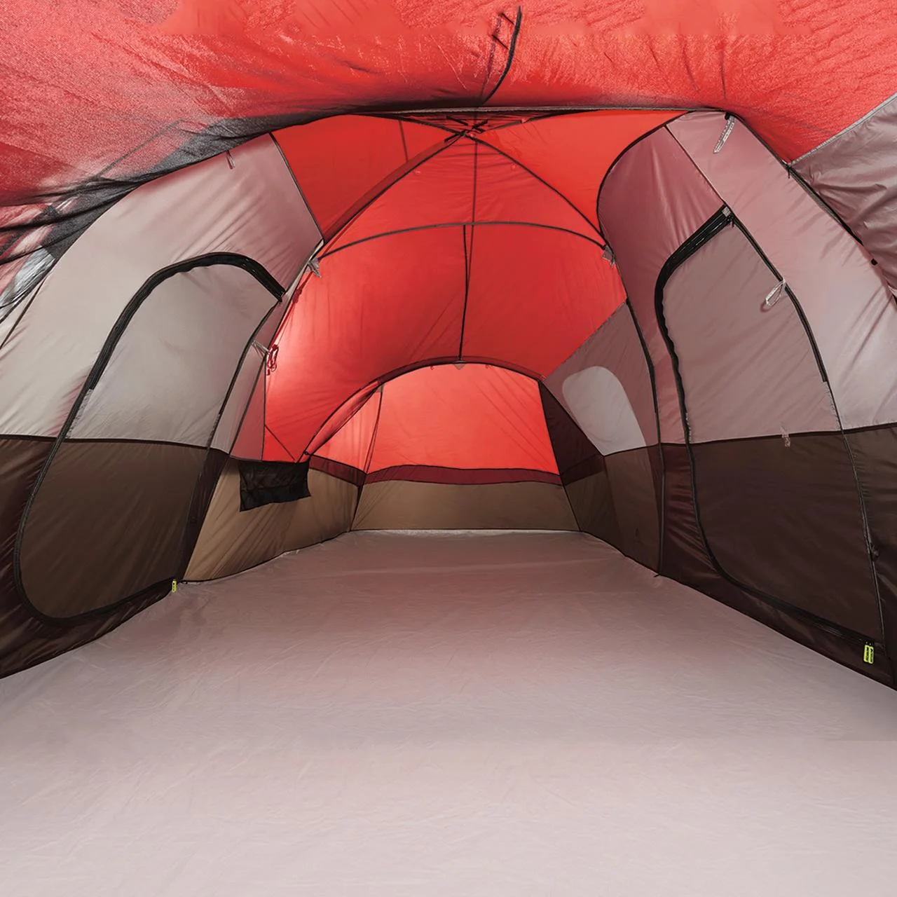 10-person camping tent 2-door entry Easy to set up Suitable for backyard use or camping Perfect for beginners and experienced campers Tent offers two rooms with divider curtain for privacy Multiple storage pockets Screened-in porch offers ventilation on hot days and protection from bugs Mesh body allows rainfly to be rolled back on warm days for better ventilation Made of polyester taffeta and polyester mesh with PE sheet floor