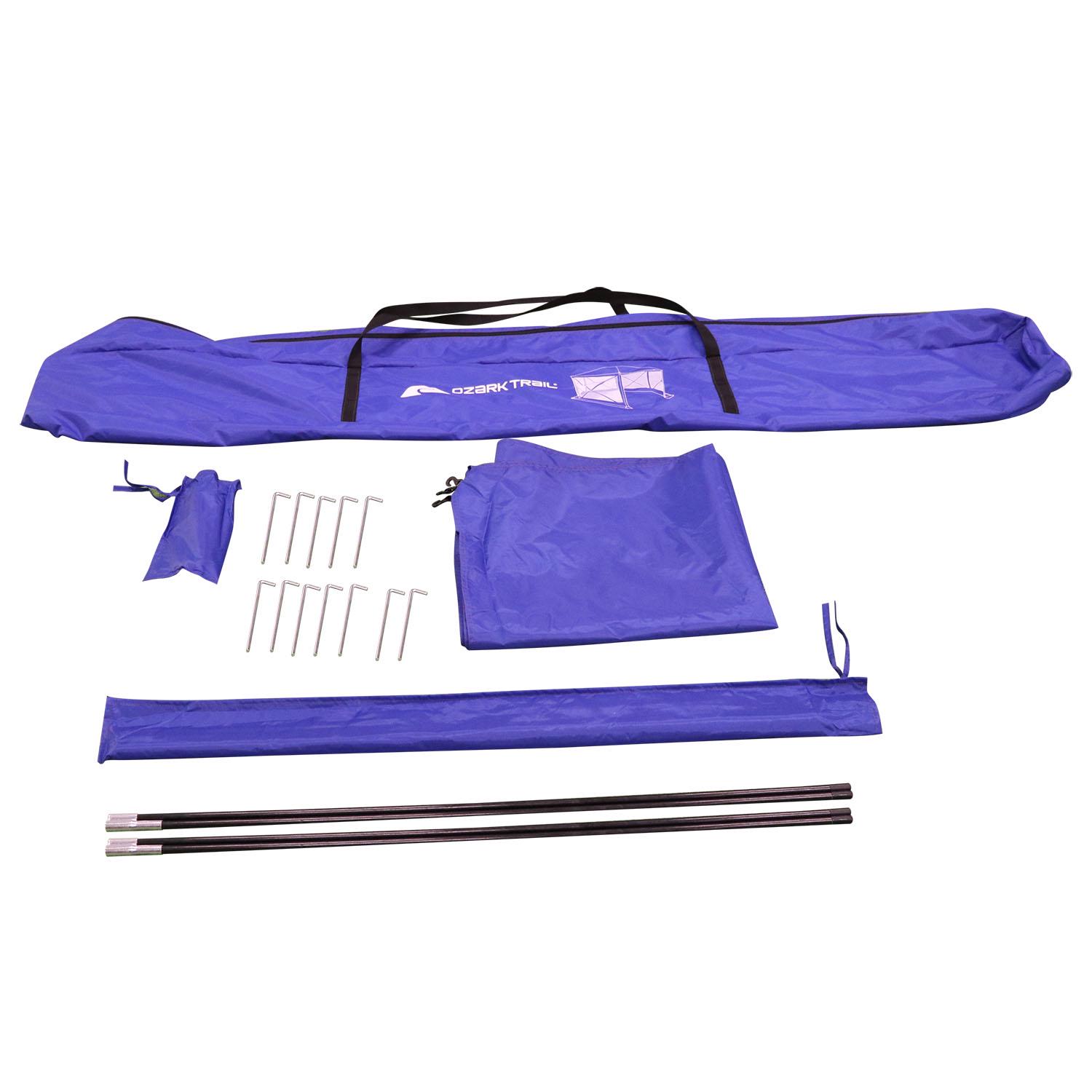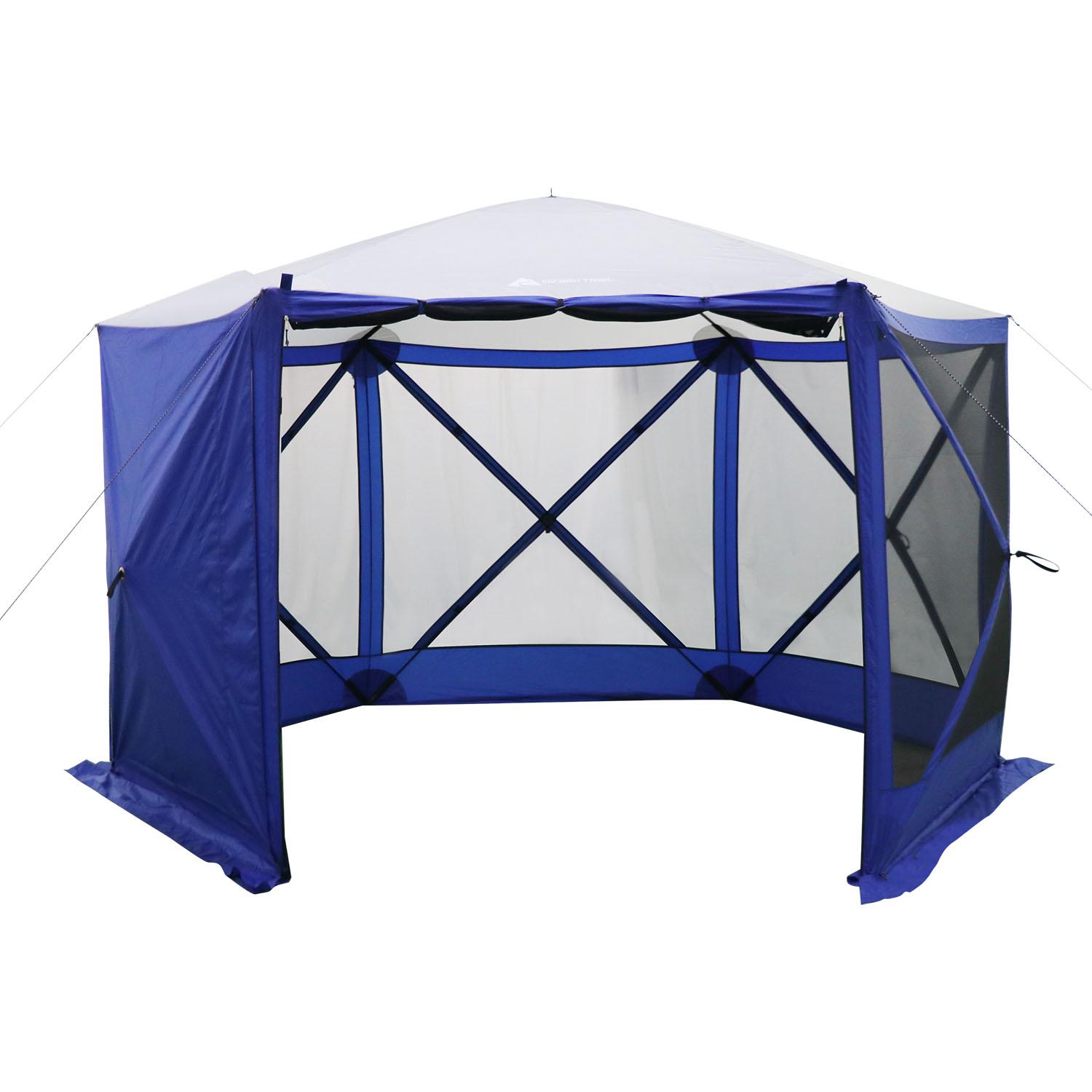 Add shelter to your next outdoor gathering with the Ozark Trail 6-Hub Pop-up Screen House. Whether you re planning a summer cookout, family reunion or any other outdoor event, this screenhouse offers shelter, shade and even protection from pests. Unlike other similar products, this screenhouse is designed with a simple, easy to use fiberglass hub style frame that can be set up in just minutes. It is designed with durable 150D polyester UPF 50 fabric that is water resistant. It also features reinforced panels on the roof for even more structural integrity. Polyester mesh is included to offer protection from pesky insects, as well as provide ideal ventilation. This screen house s extra-large, full panel door also makes entering and exiting a breeze. Looking for a way to add shelter to your next outdoor event or gathering If so, make sure to choose the Ozark Trail 6-Hub Pop-up Screen House. Canopy Tent Screen House. A Family Camping Tent item. One Large Room. Dimensions: 11’x10’x88.5″, Weight: 29.61 lbs.
