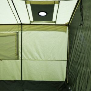 – Integrated stove jack with zippered cover fits 5″ diameter stove pipes