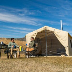 Get this Ozark Trail North Fork 12′ x 10′ Wall Tent for your outside exploring needs. It is convenient whether there’s rain, sleet or snow. The canvas-imitation fabric on this wall tent with a stove jack wraps around a frame with adjustable legs and eaves to place it on uneven ground. Setup is easy with the color-coded poles and hubs, while a removable PVC floor keeps you dry from underneath. Fit your heat source in the outdoor tent, with its integrated section that fits pipes up to 5″ in diameter. For ventilation, it has a screen door, two ceiling vents, two side windows and one large rear window. Storage is not a problem, since the wall tent with a stove jack includes two hanging gear storage pockets with an integrated tablet pocket. For wind and weather, heavy-duty guy lines and eave flaps help to manage gusts and downpours. It all fits in an included storage duffel for your convenience.