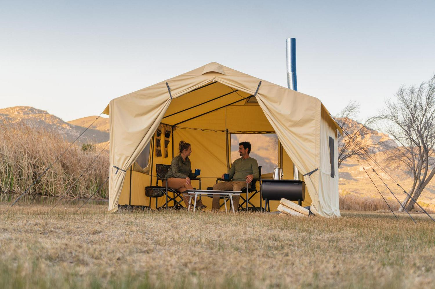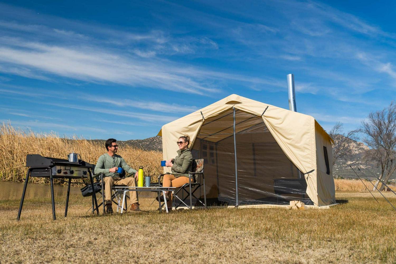 - Single-wall luxury outfitter tent with heavy-duty ripstop polyester canvas-like fabric