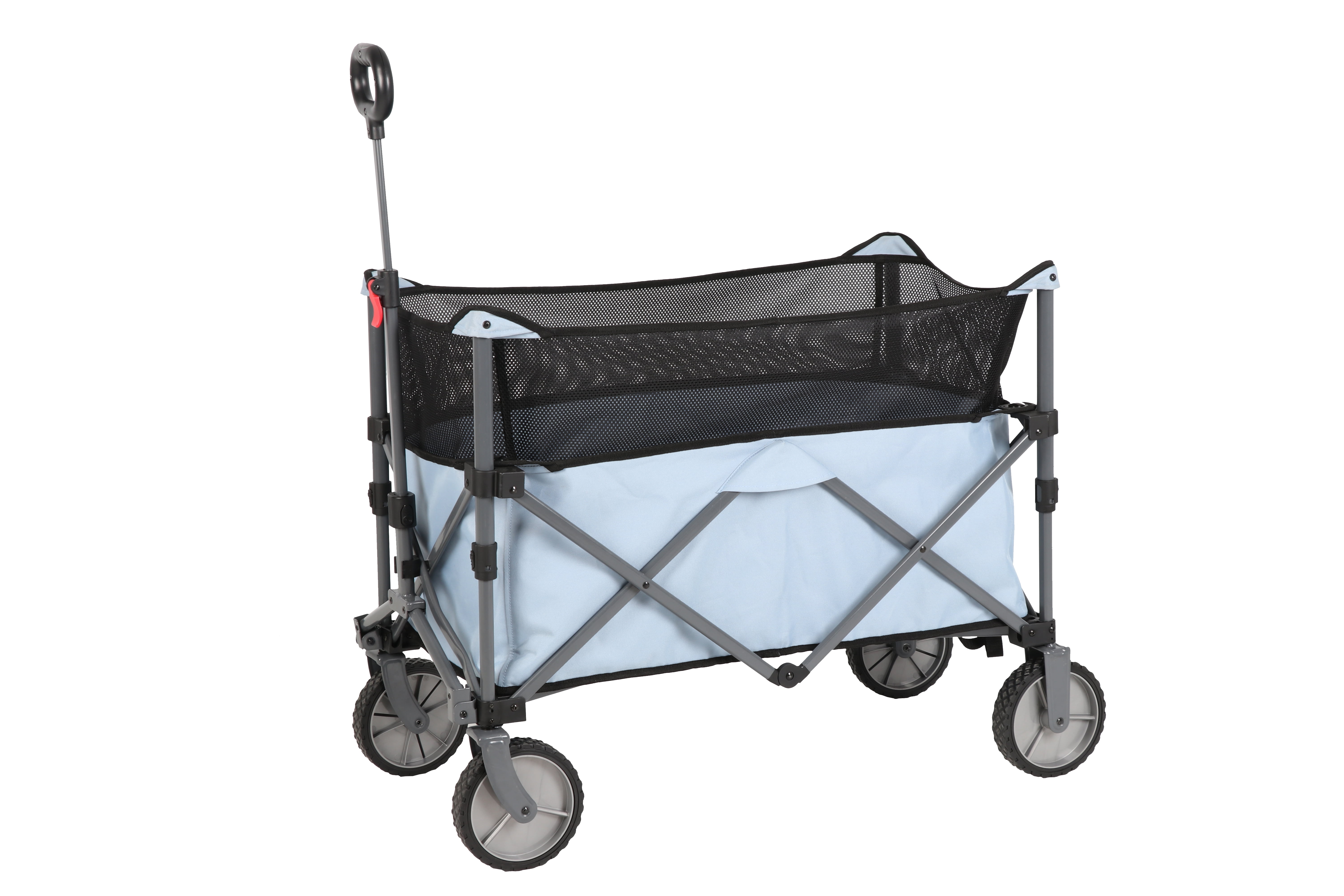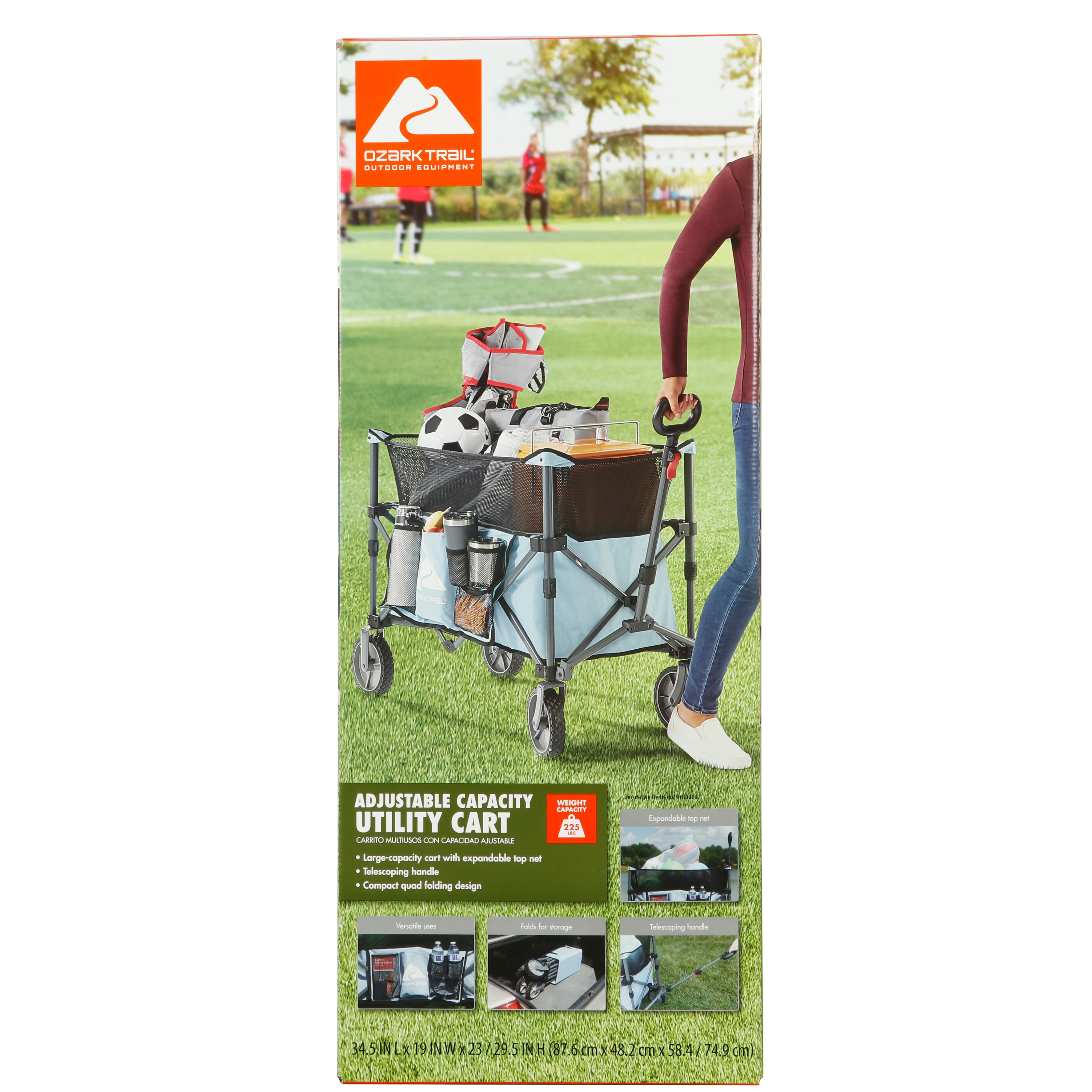 Ozark Trail Height Adjustable Quad Fold Cart, Blue: Large capacity cart with expandable top net for storing other items provides plenty of room for hauling items Telescoping handle adjust to make hauling loads easier for users of all heights Compact quad folding design won’t take up much space so you can easily transport and store this cart Top mesh allows for more basket room so you can haul more items Weight capacity (pounds): 225 pounds Product weight (pounds): 21.2 pounds Adult Product dimensions (inches): 39” x 19” x 29.6”/23.5”