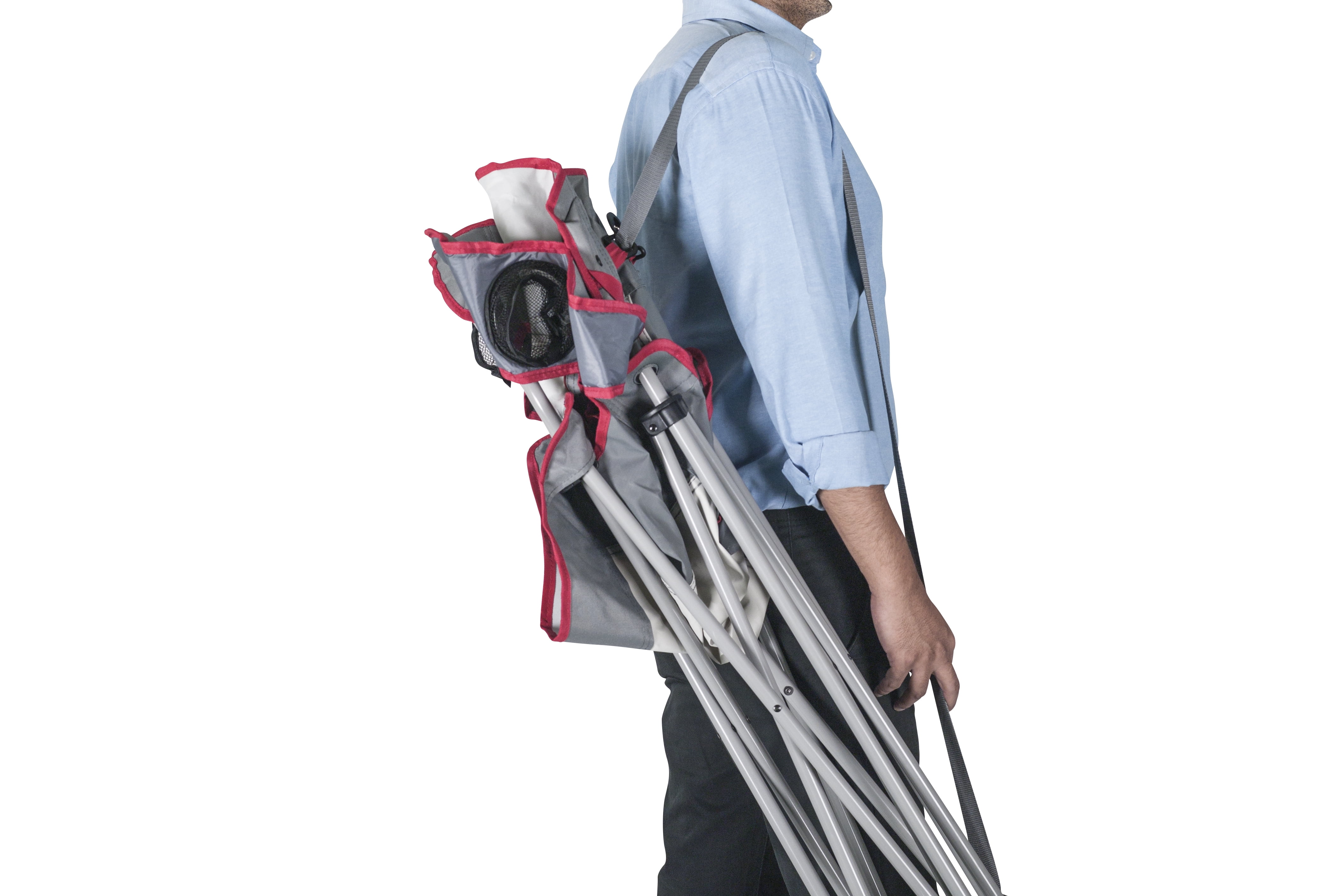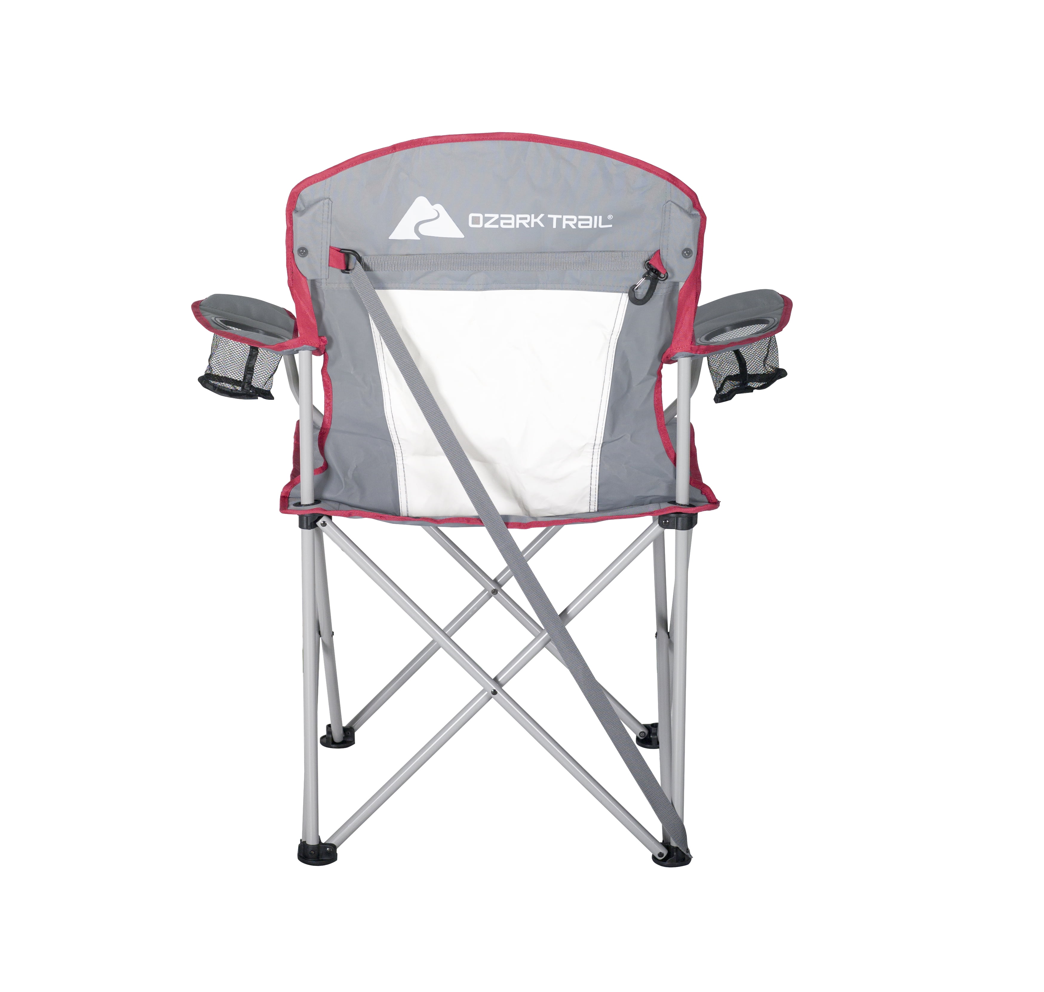 Ozark Trail Adult Oversized Quad Chair, Off White & Gray Built-in strap and clip folding system which allows you to quickly fold and carry the chair Perfect for a variety of outdoor activities, including tailgating, sporting events, and camping Made from durable polyester fabric with a steel frame Up to a 350-pound weight capacity Keep all your favorite drinks nearby with the two built-in mesh cup holders Included roll-top carry bag with attached shoulder strap for convenient transportation and storage