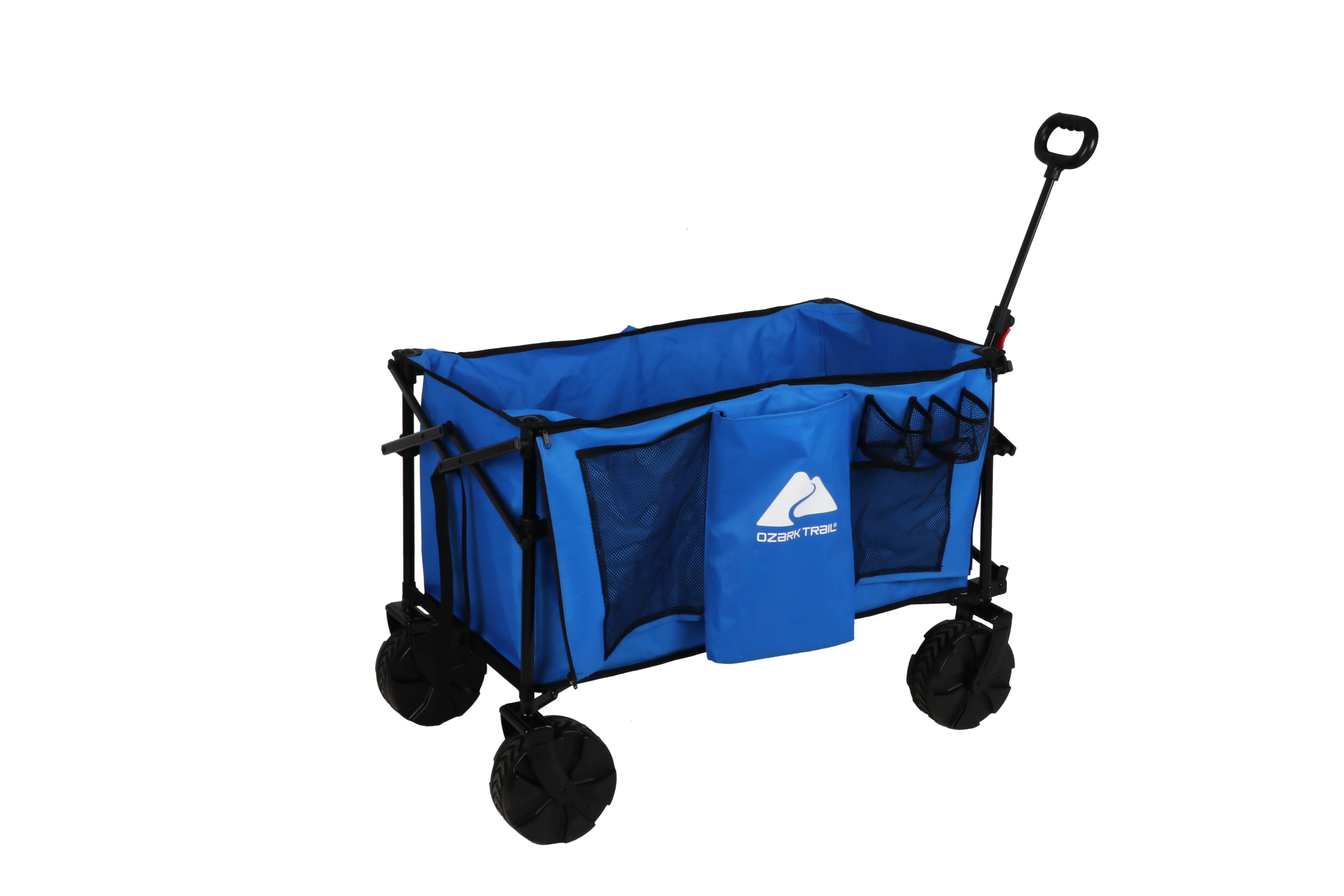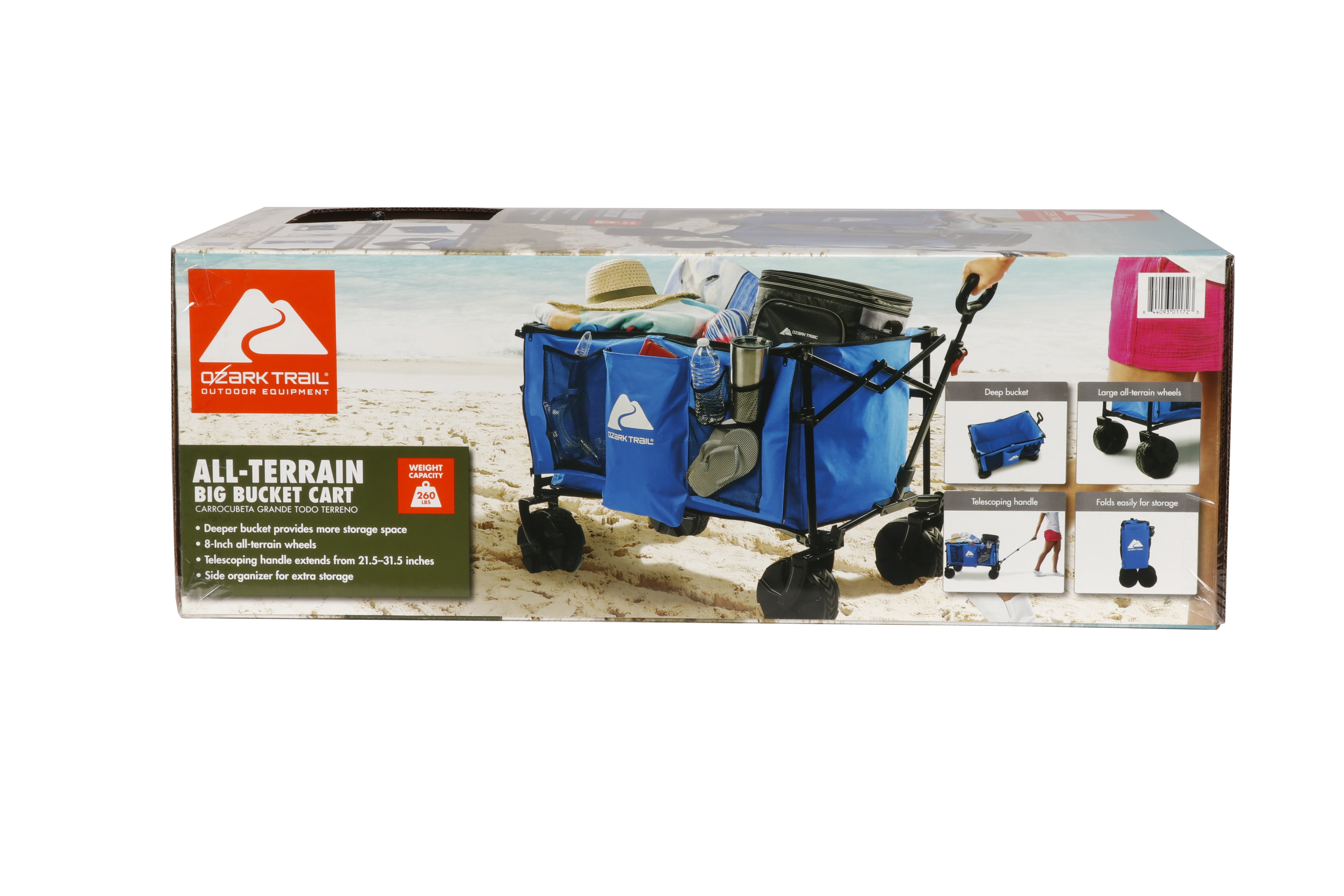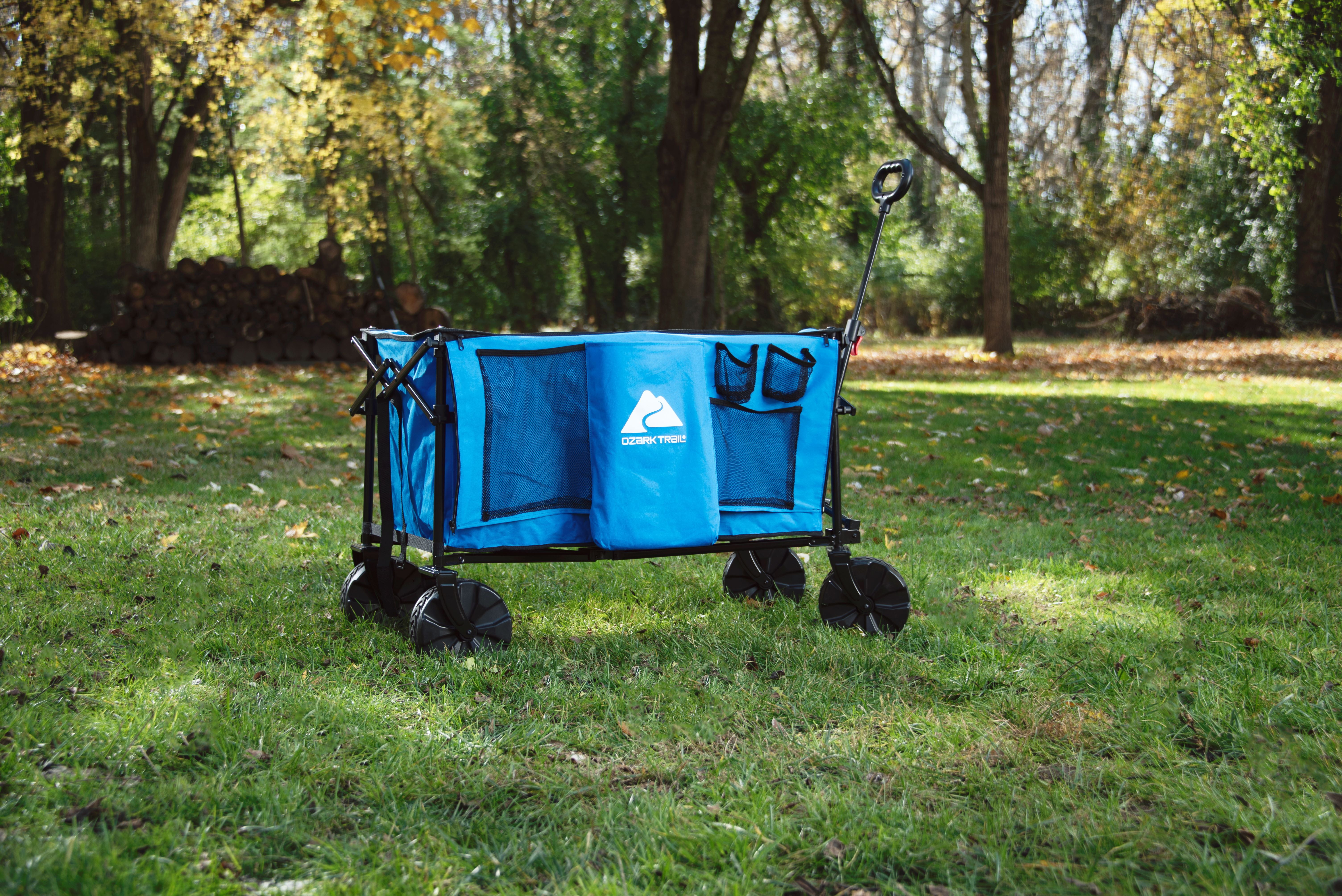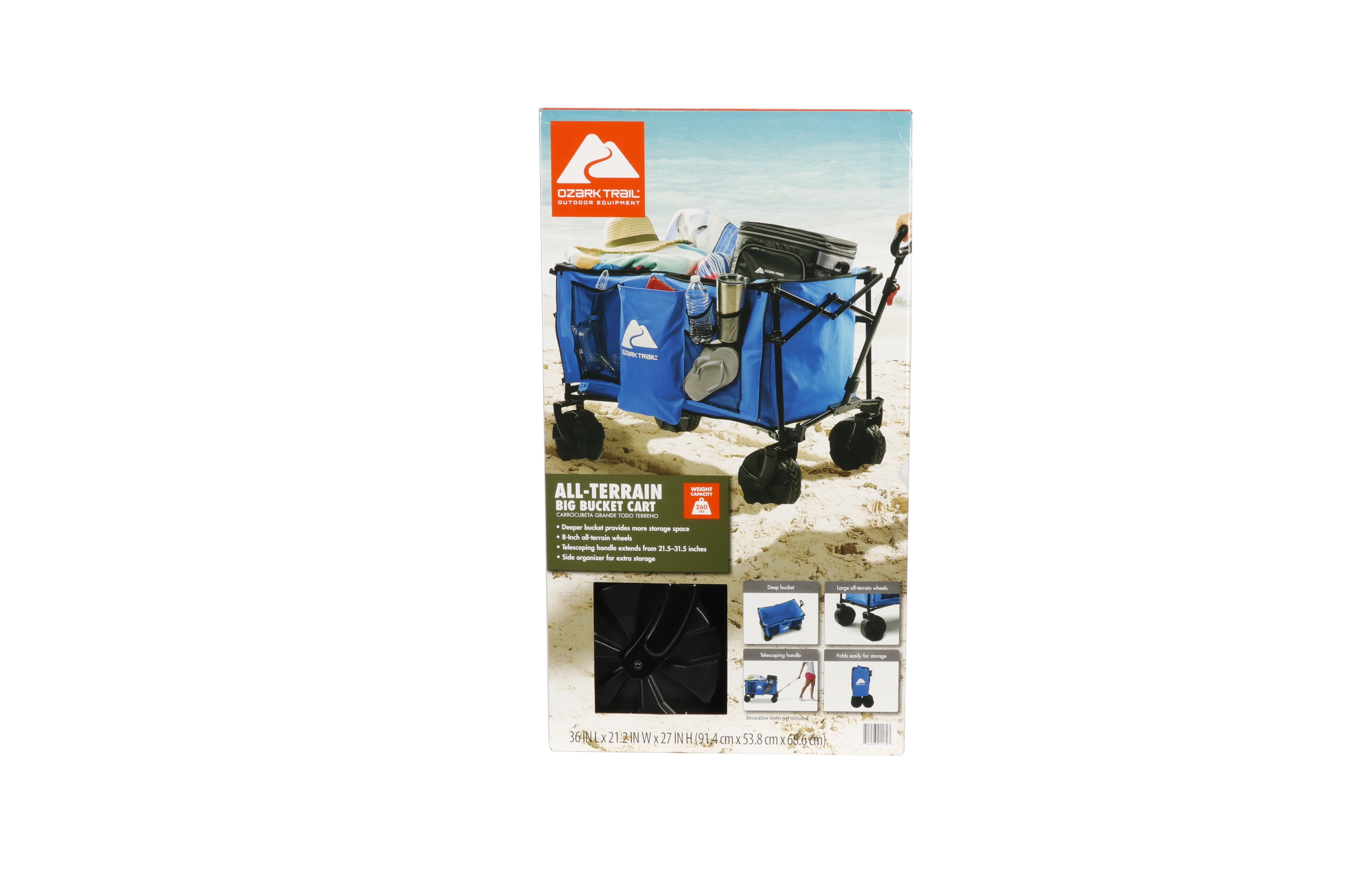Ozark Trail All-Terrain Big Bucket Cart Wagon Telescoping handle for easy towing Side organizer for extra storage Small size for easy transportation in trunk or storage in garage Deeper basket provides more storage space Heavy-duty 8-inch PVC wheels can traverse a variety of terrains Weight capacity (pounds): 260 lbs. Product weight (pounds): 31 lbs. Open dimensions (inches): 36 x 21.2 x 27 Closed dimensions (inches): 9 x 9.8 x 27.7