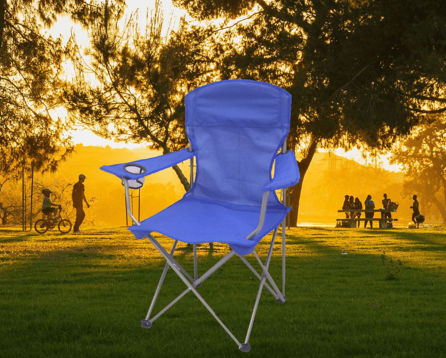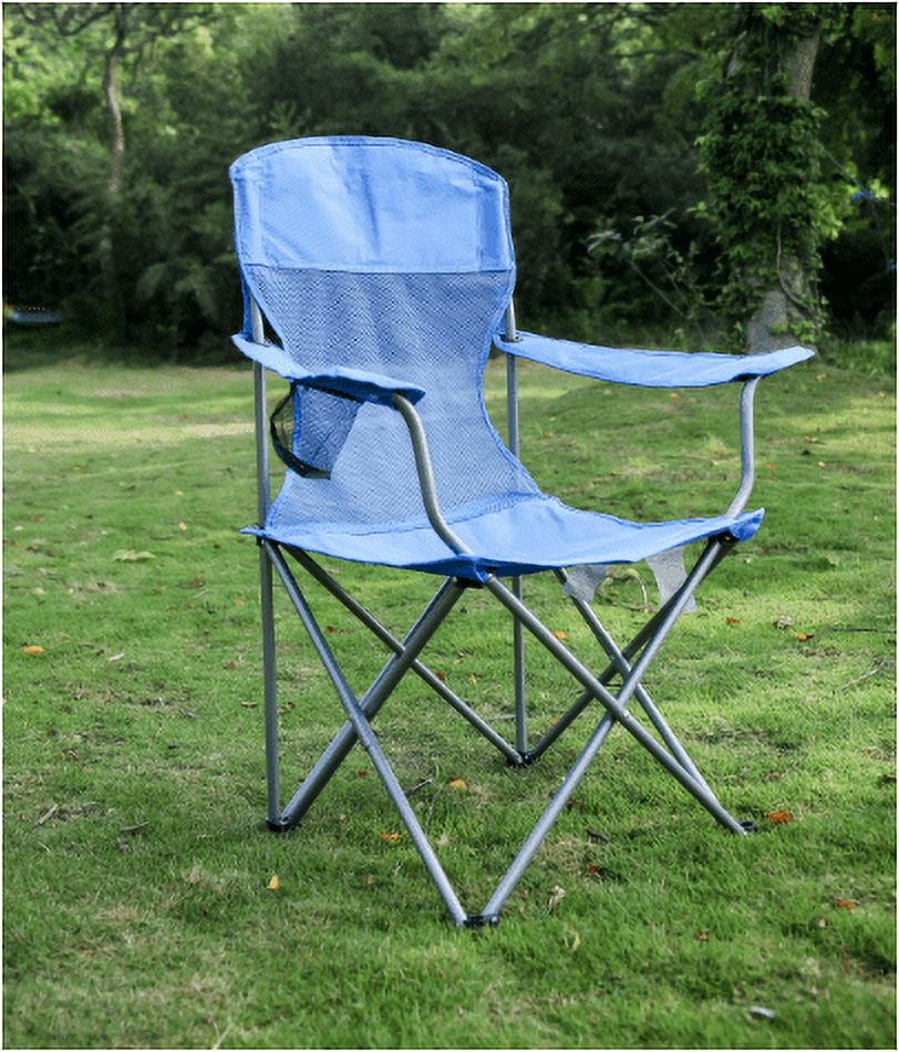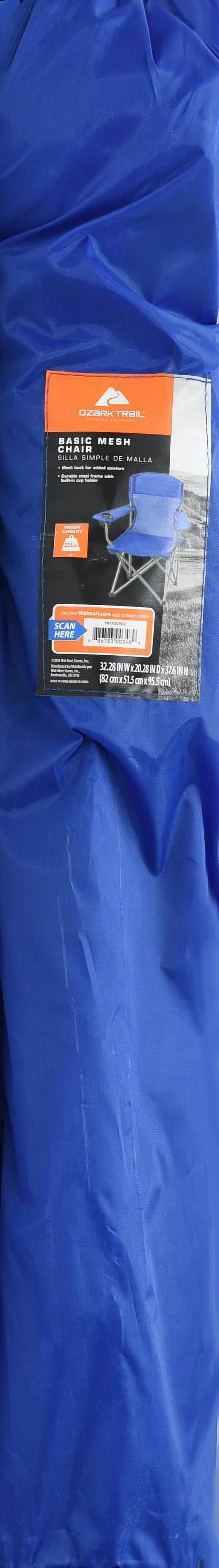 Ozark Trail Camping Chair, Blue: Convenient regular foldable camping chair collapses for easy storage and transportation and features a built-in 1-cup holder Made from durable polyester fabric wrapped around a steel frame for long-lasting comfort and convenience Included carrying bag makes it easy to bring this chair with you most anywhere you go Lightweight camping chair with cup holder 2 available colors: red or blue Cooler not included