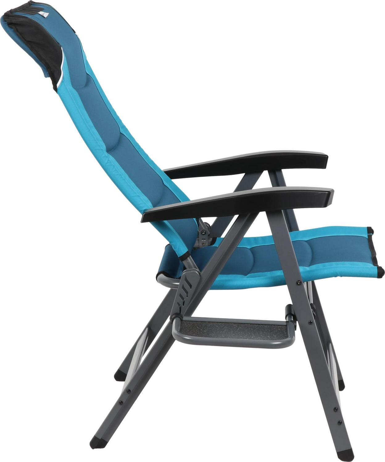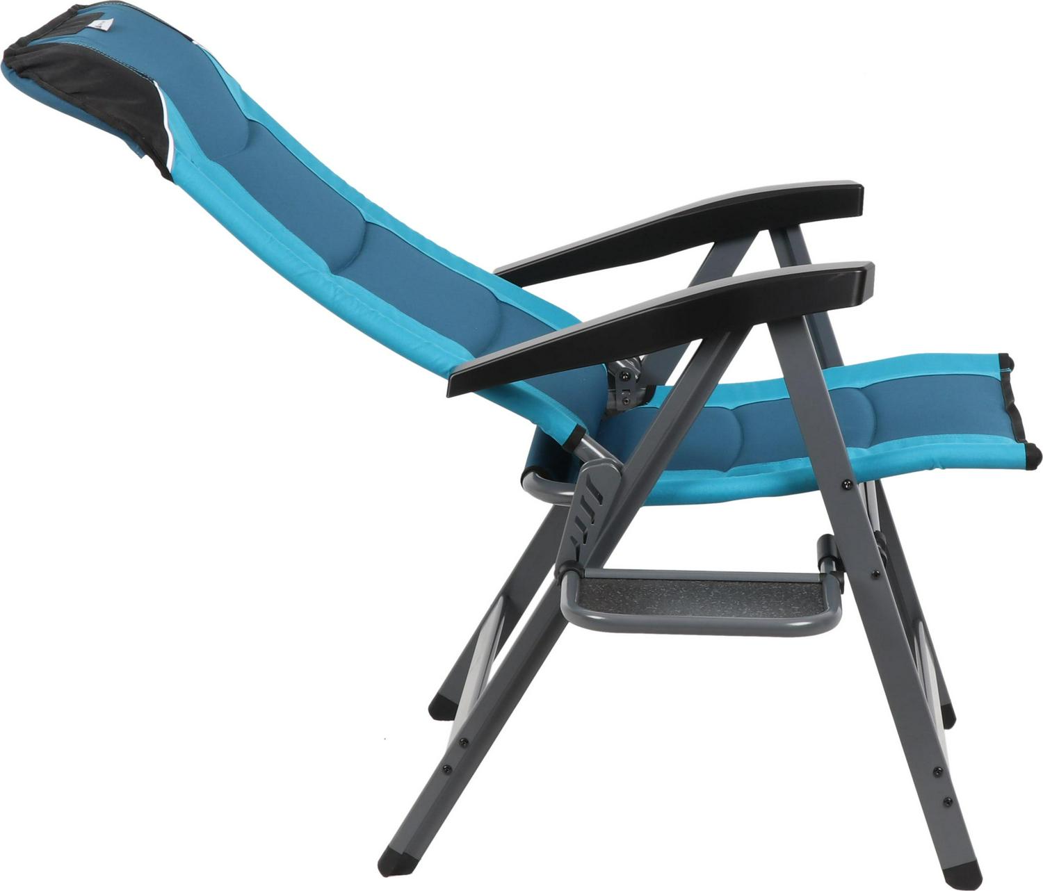 For comfortable seating at the campsite or anywhere else, choose the Ozark Trail aluminum 5-position chair. Unlike similar chairs, this product features a 5-position reclining design that allows the user to relax in multiple backrest angles for customized comfort. It also features a padded headrest and durable hard armrests for an enhanced sitting experience, and to ensure important items are within reach at all times, this chair features a side table that folds down out of the way when it is not in use. Designed for durability, this chair features strong fabric and a lightweight aluminum frame with powder coating that boasts a weight capacity of 300 pounds. This chair sets up quickly and when it is time to go, it folds down compactly for easy storage and transportation. Black.