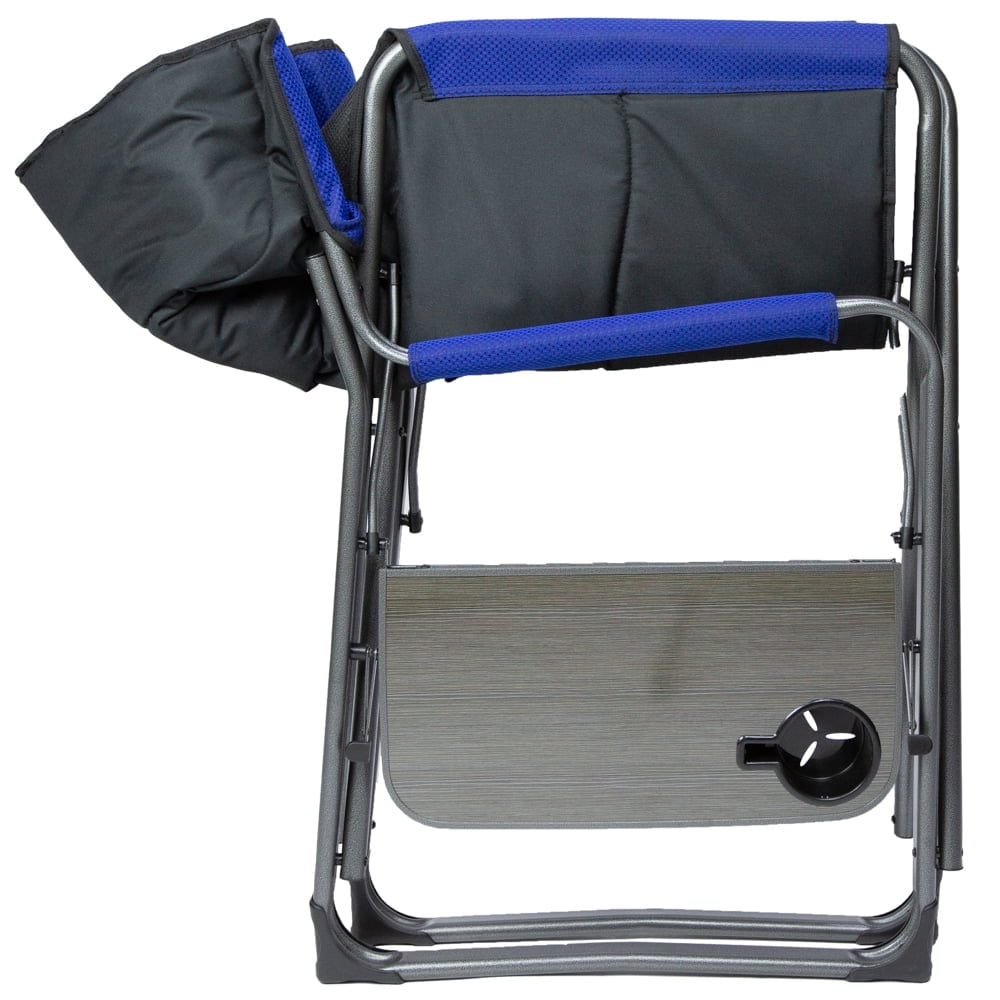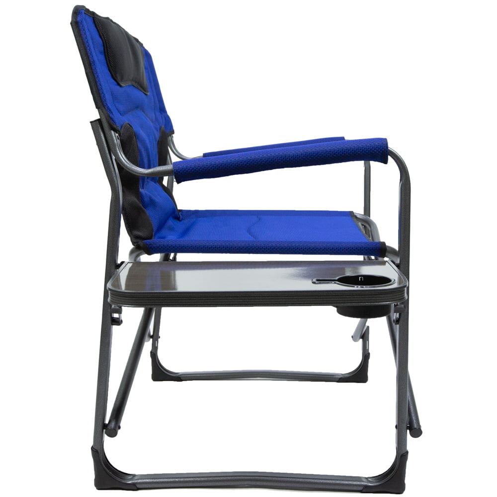 Ozark Trail XXL Folding Padded Director Chair with Side Table, Blue Durable flat-folding extra-wide steel frame makes big comfort easily stowable in a closet or car trunk Lightweight and sturdy, the frame is resistant to rust and corrosion Padded seat and armrest for added comfort while you lounge in the outdoors Foldable side table with built-in cup holder to keep a drink and a magazine FOLDING DIRECTIONS: Stand on one side of the chair, Step on the bottom bar of the frame and pull up on the side of the seat until chair closes Capacity weight is 600 lbs Dimensions: 42.9″W x 25.6″D x 36.5″H Seat size: 27.9″W x 9.09″D x 17.7″H Adult use