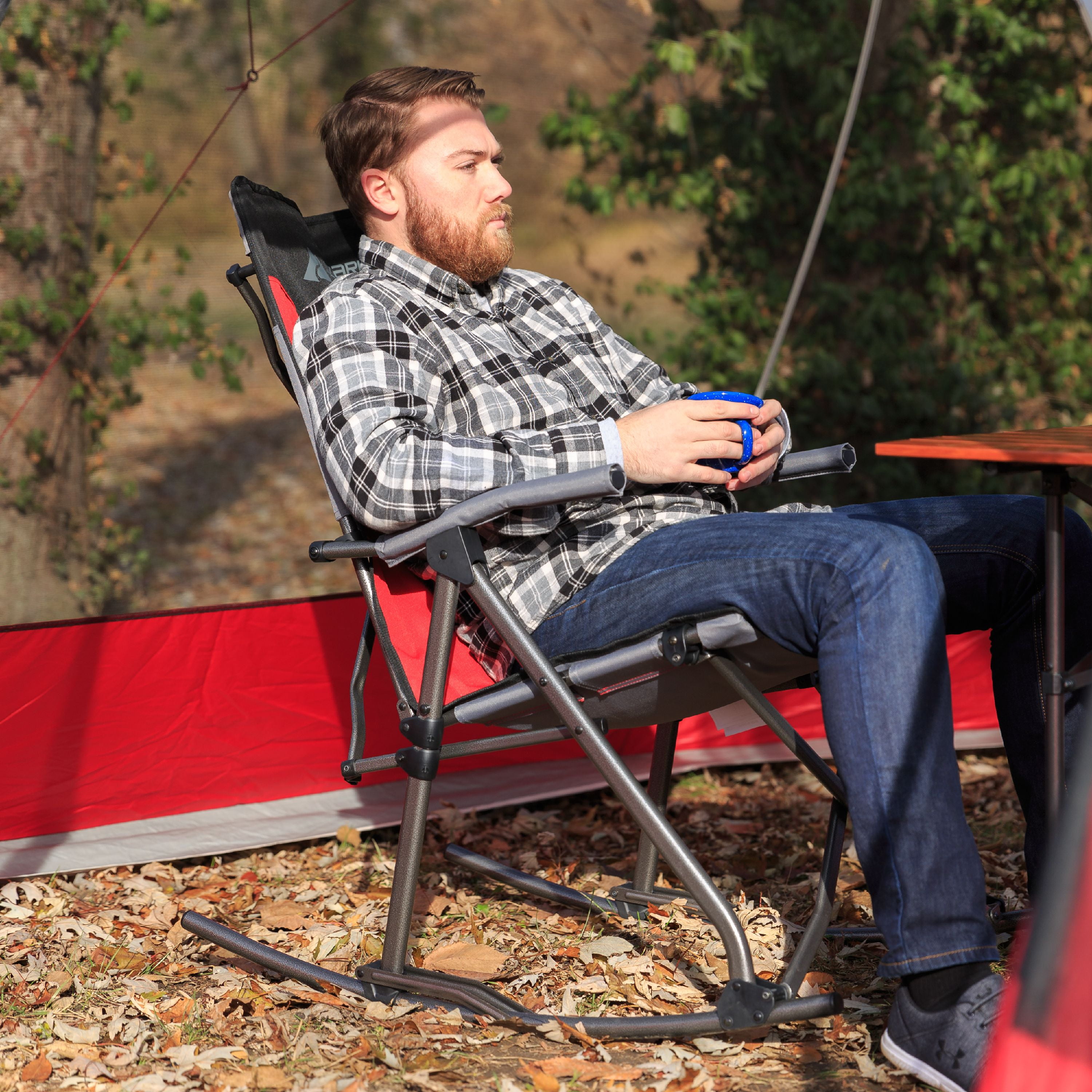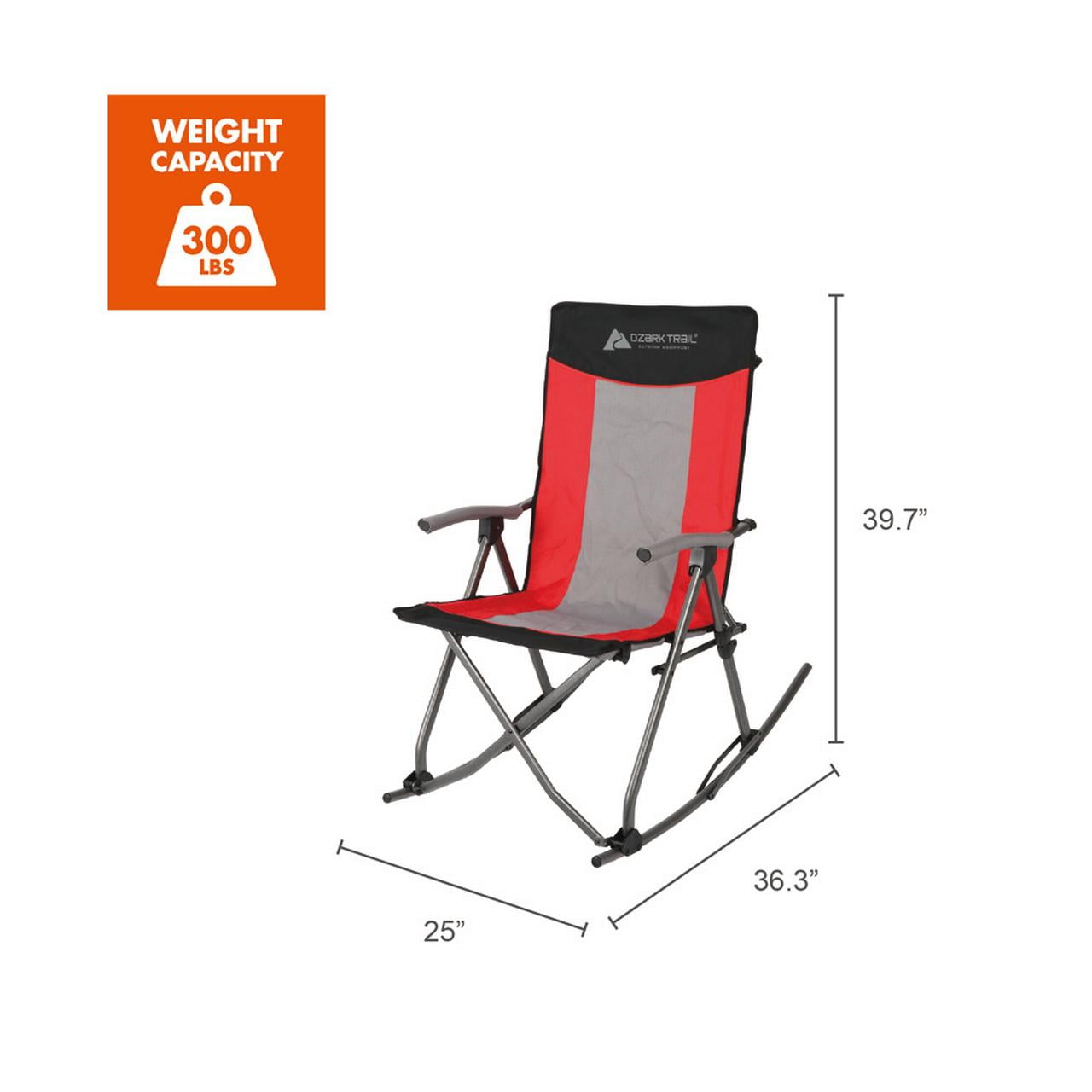 If you are looking to rock your way to relaxation, the Ozark Trail Arm Rest Rocking Camp Chair in red and black is just for you. Perfect for trips to the campsite or tailgating the big game, this comfortable chair’s compact folding frame will not take up much space, so transportation and storage is a breeze. Tired of standard camping chairs. Thanks to this chair’s relaxing rocking design, you will rock your way to comfort while enjoying the outdoors. The seat fabric, high back and hard arms also provide extra support for an enhanced sitting experience which will keep you comfortable for longer. Are you ready for your next outdoor excursion? Whether you are camping, tailgating, or just hanging out in the backyard this chair is for you. Built for total relaxation, when you sit and rock in the Ozark Trail Arm Rest Rocking Camp Chair, you will never want to go back to standard chairs again. Weight is 16.7 lbs. Adult use.