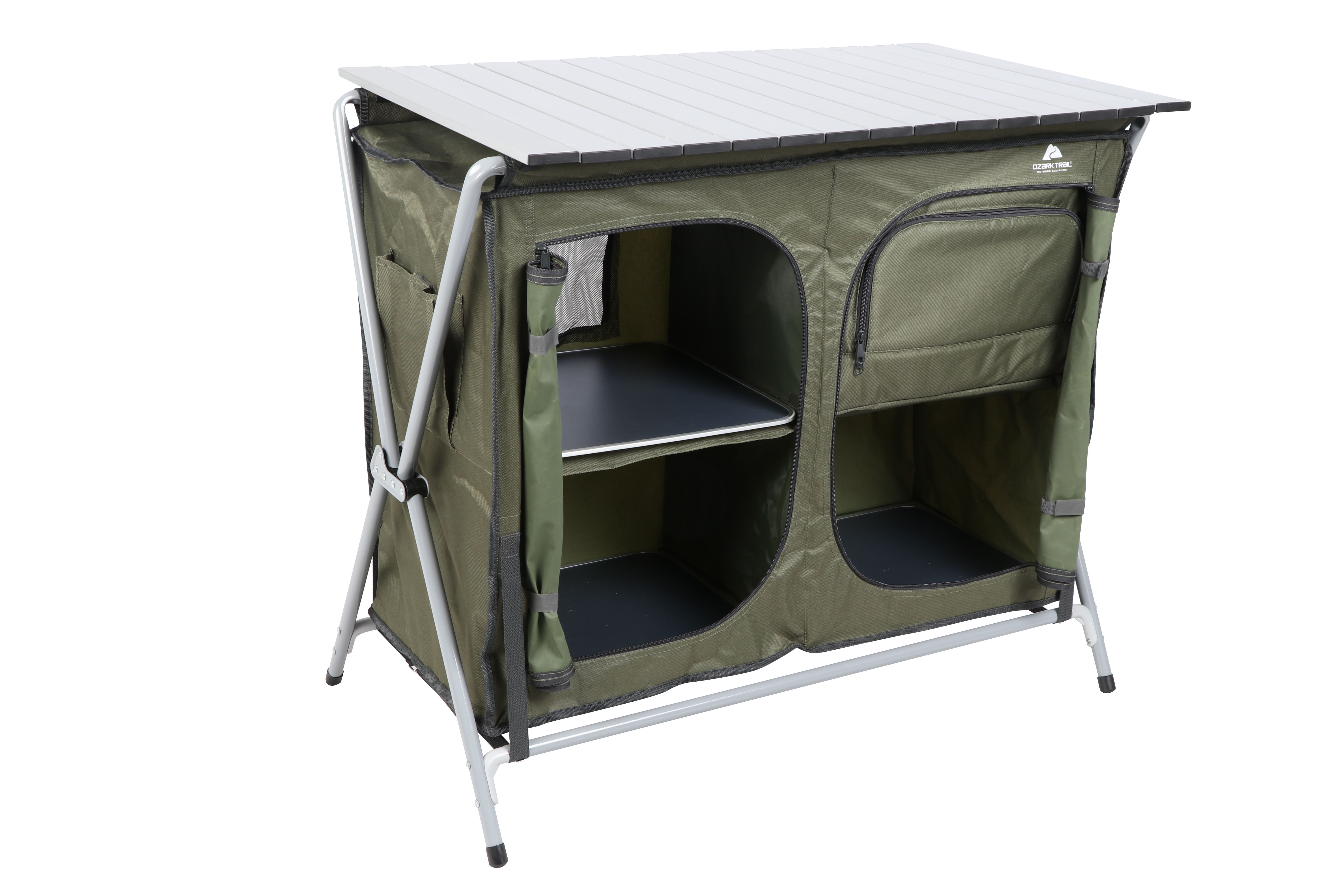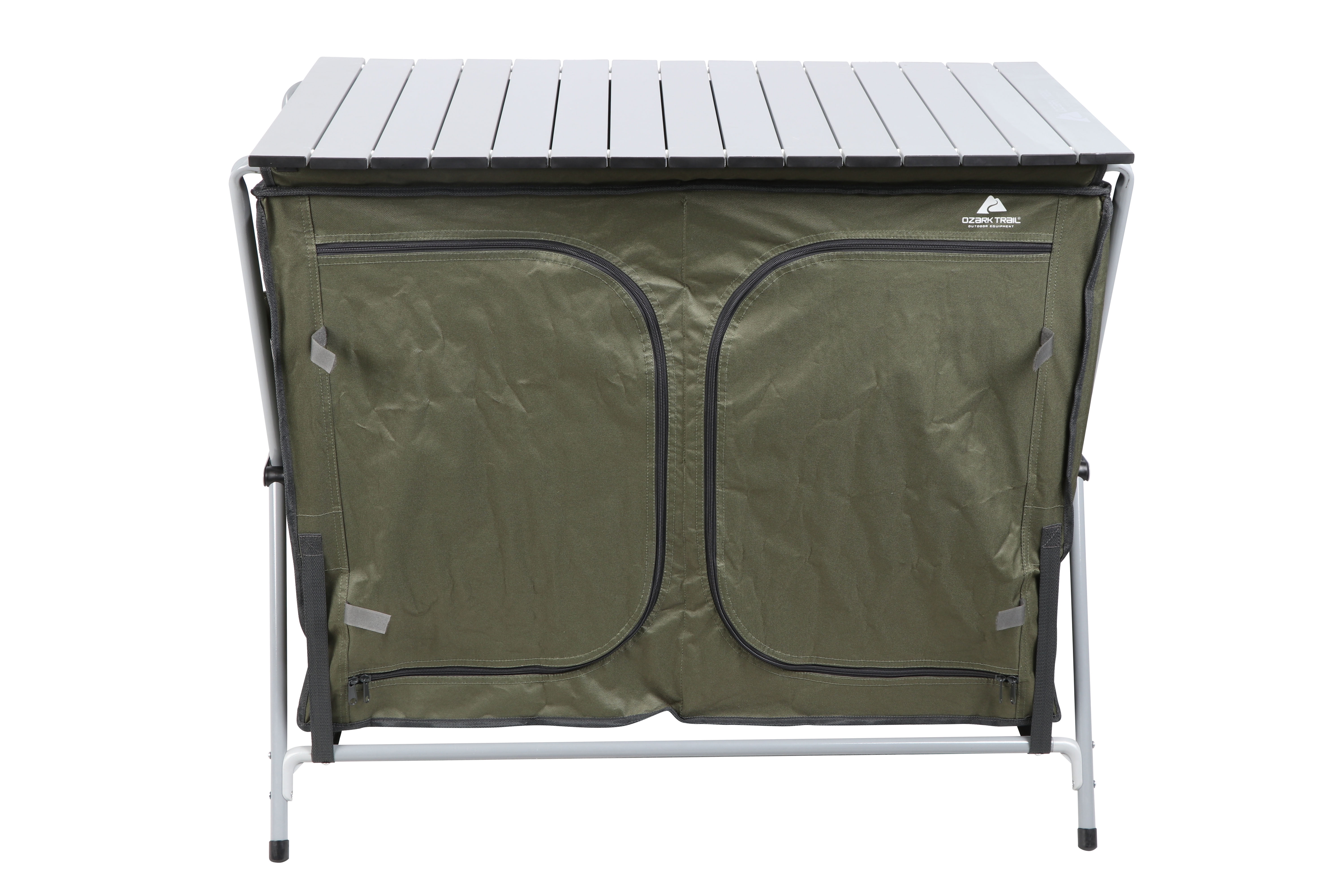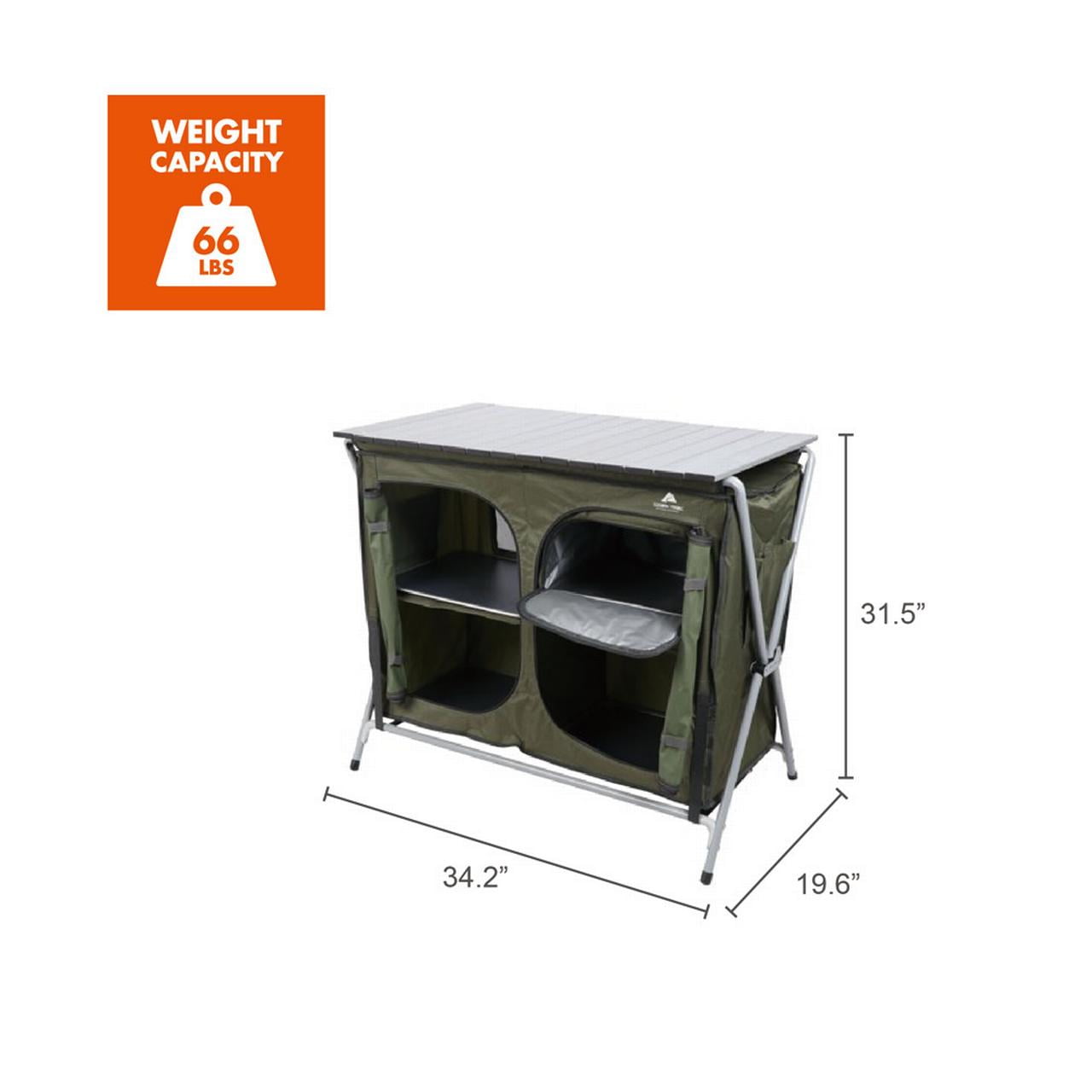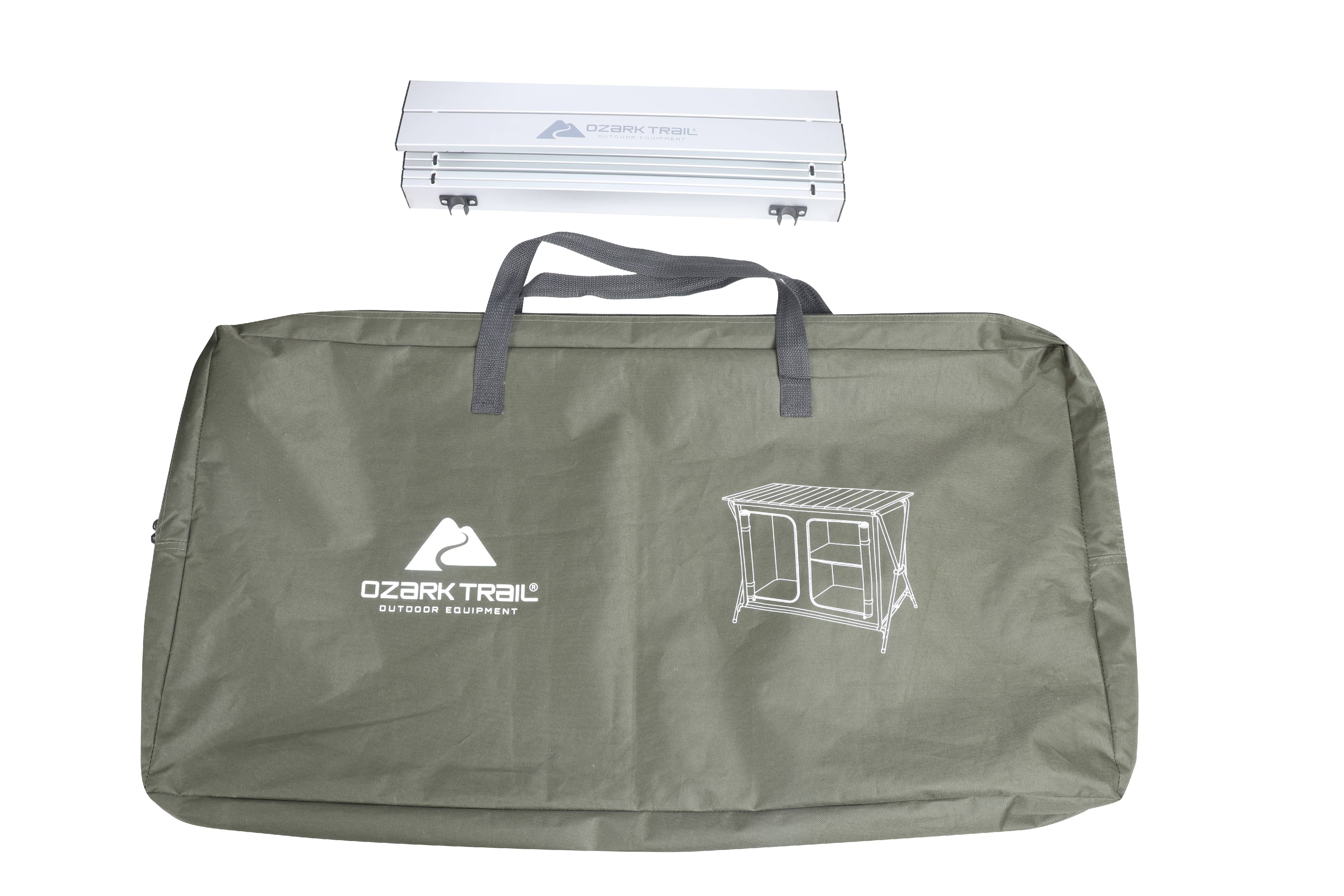 Ozark Trail Camping Table, Gray Double two-shelf deluxe cupboard lets you easily store and organize your cooking tools and supplies Quick and easy to assemble with an “X” shape frame for a sturdy work and storage space A durable aluminum roll-top is great for preparing your meals on your camping weekend Carry bag for convenience Product Overall Size: 34.2″ W x 19.6″ D x 31.5″ H