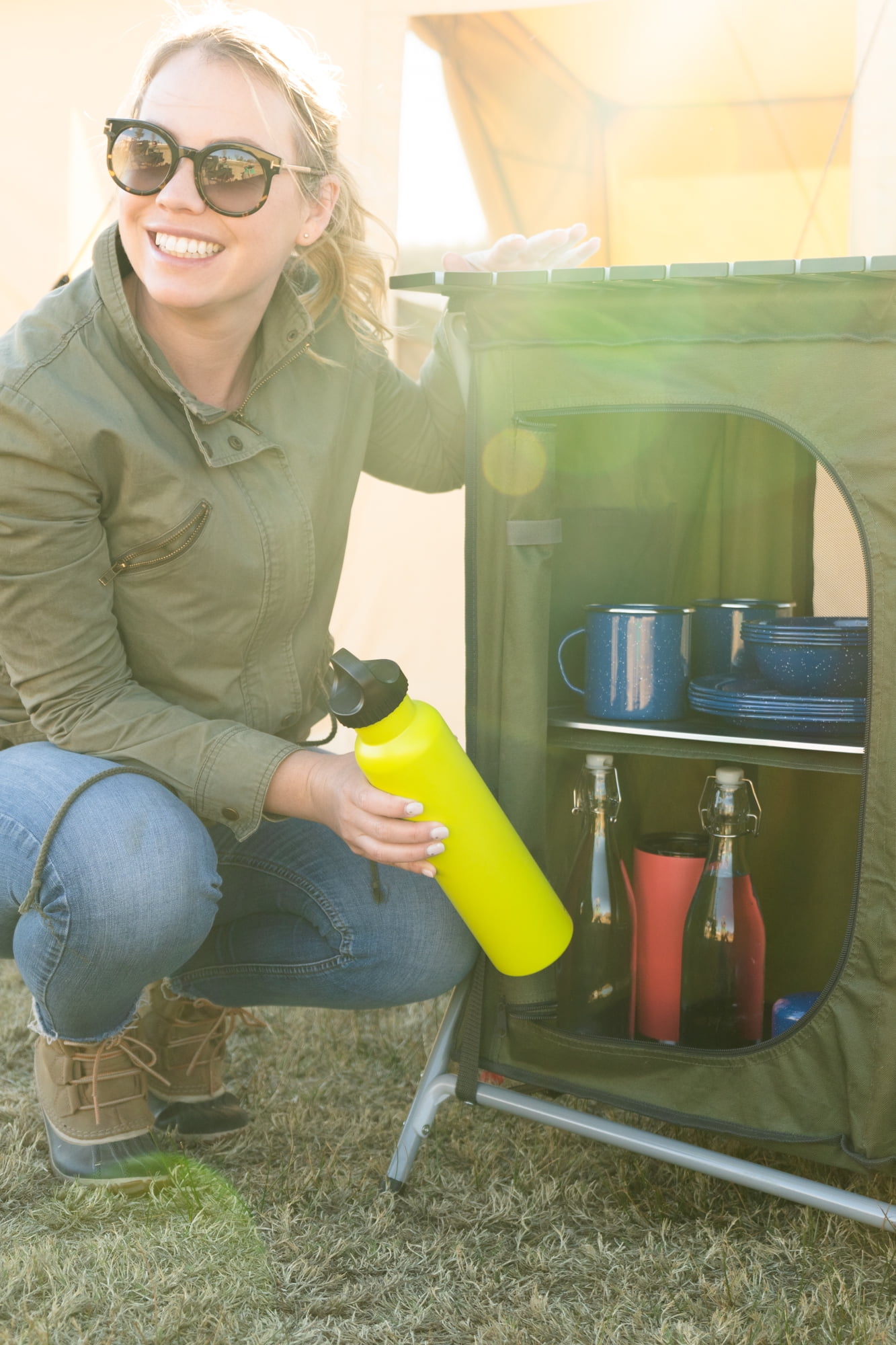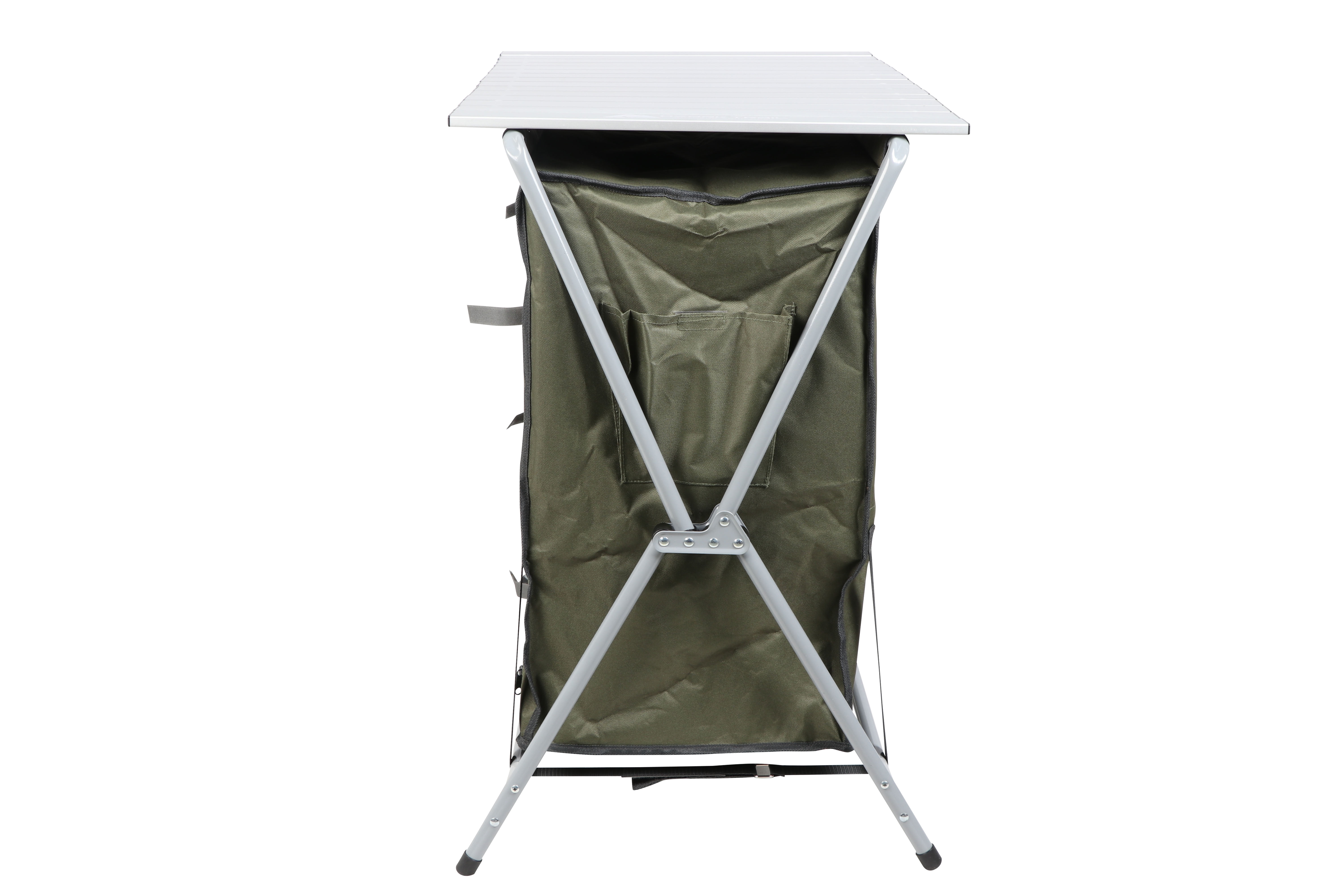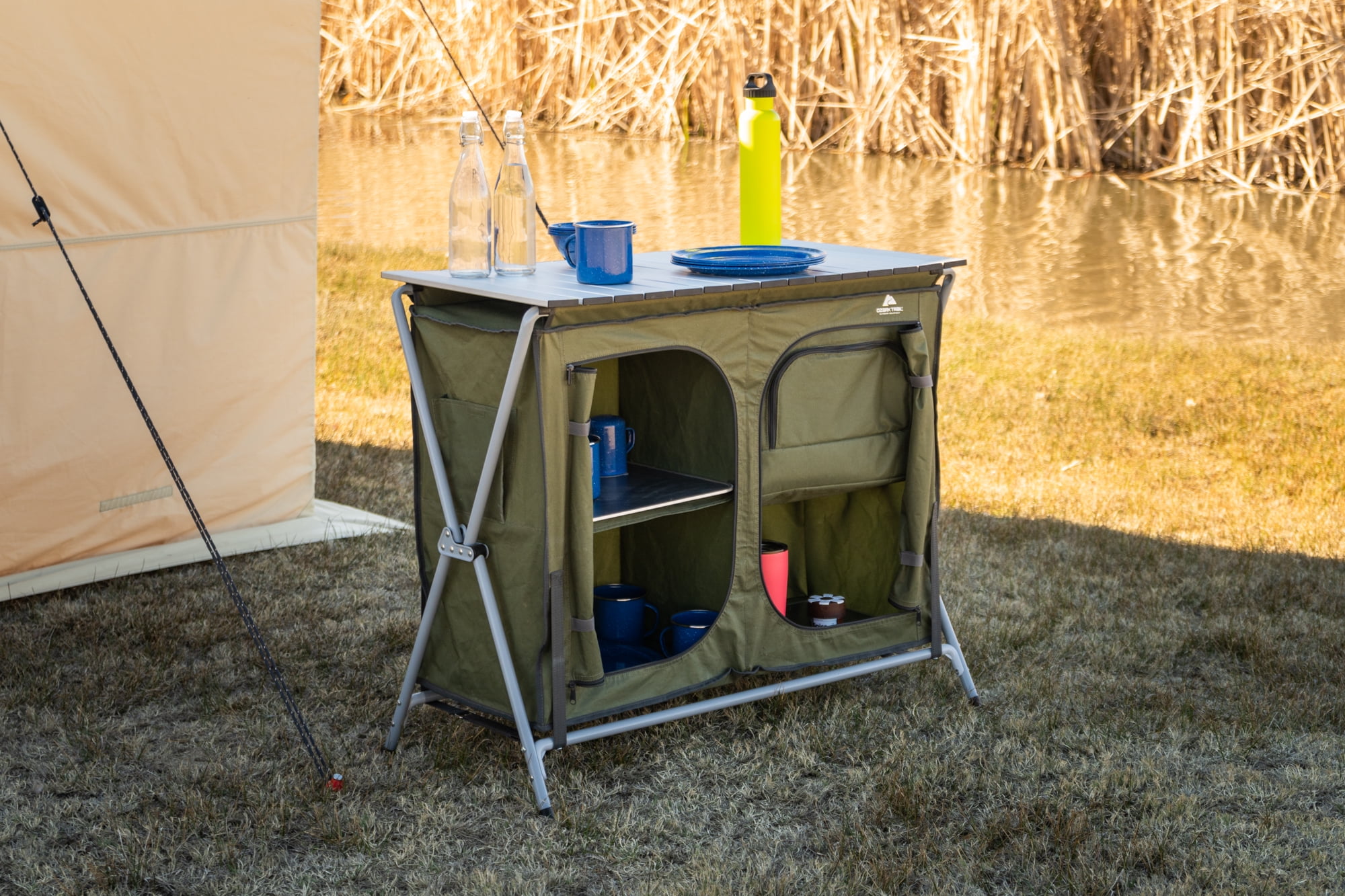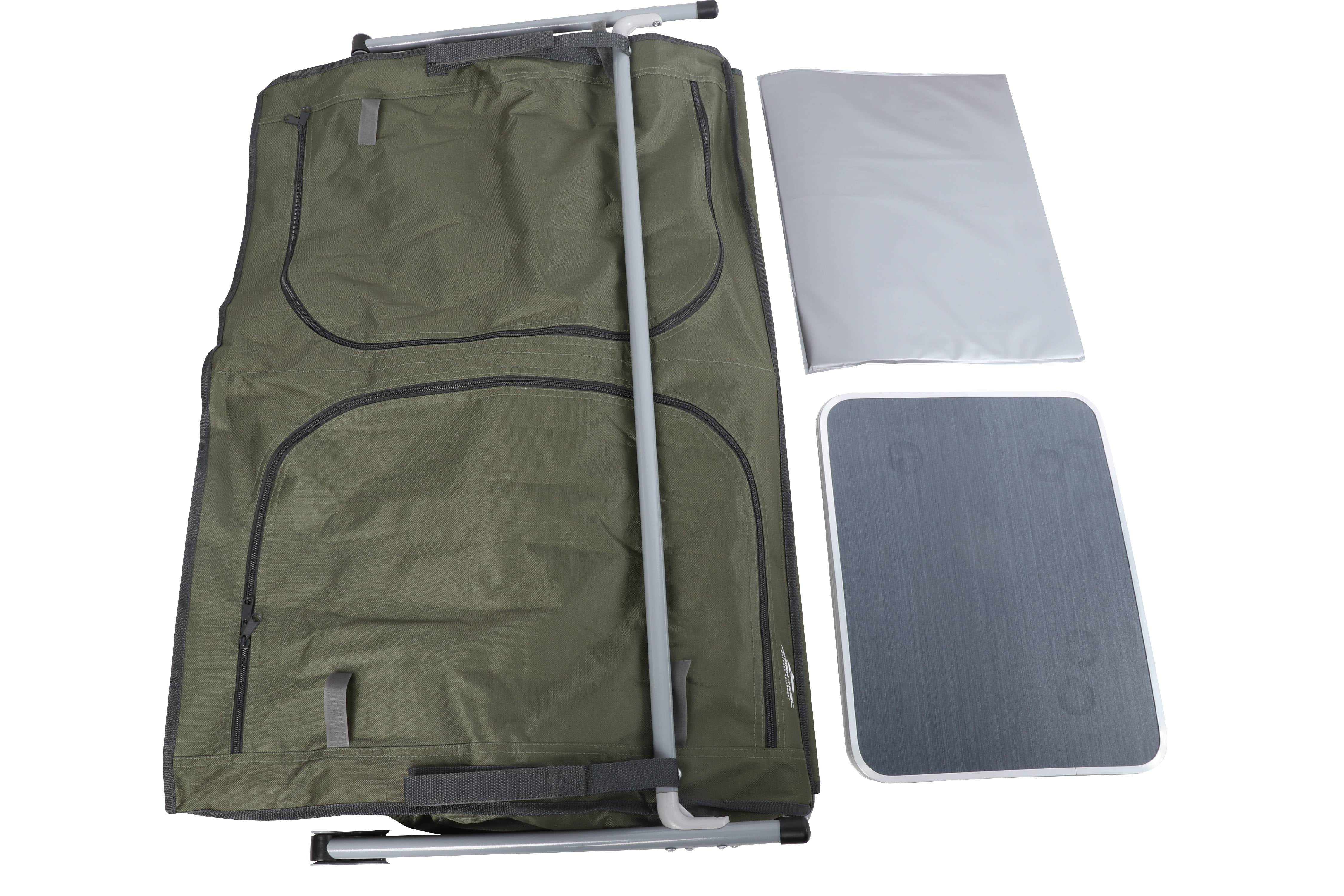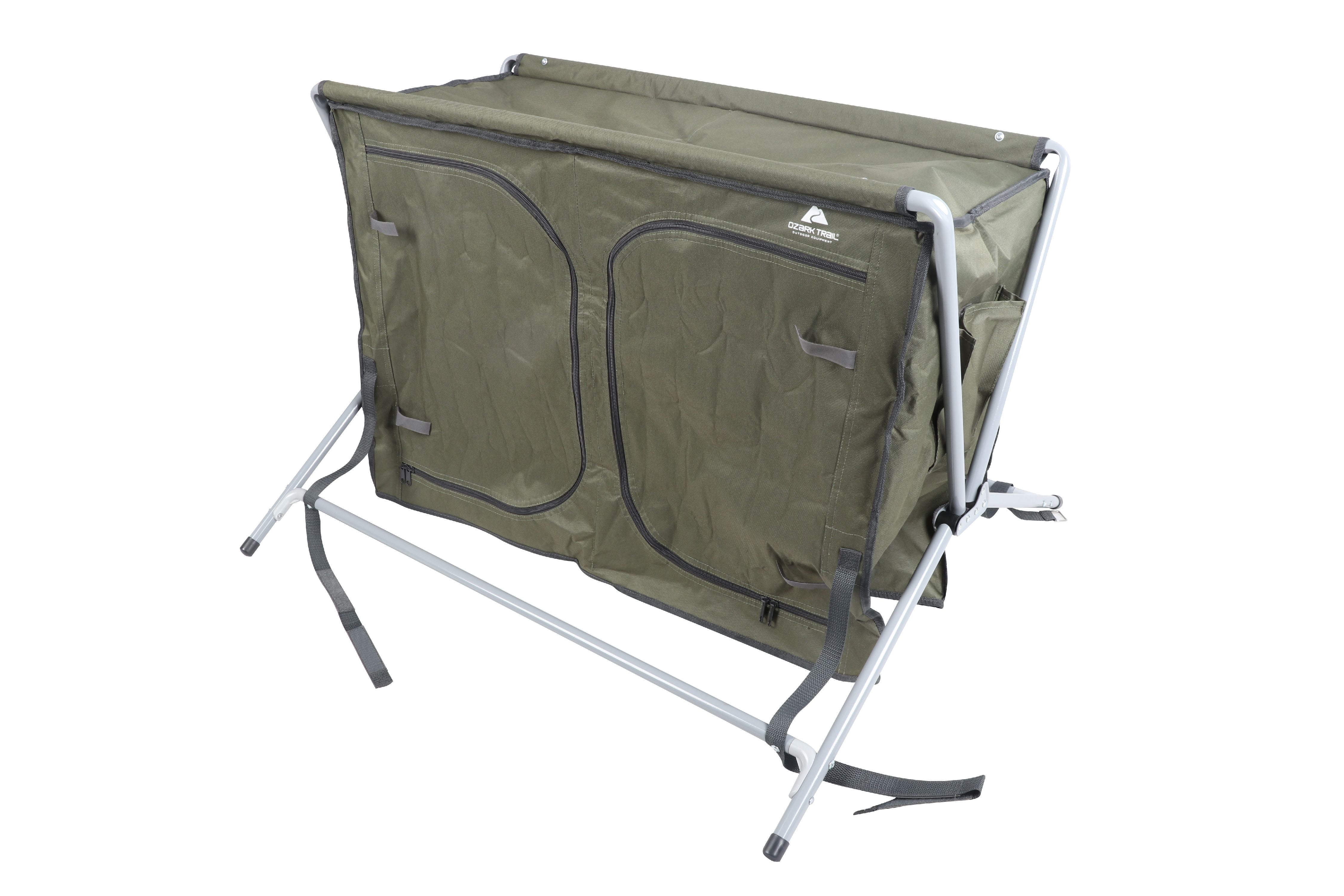 Ozark Trail Camping Table, Gray Double two-shelf deluxe cupboard lets you easily store and organize your cooking tools and supplies Quick and easy to assemble with an “X” shape frame for a sturdy work and storage space A durable aluminum roll-top is great for preparing your meals on your camping weekend Carry bag for convenience Product Overall Size: 34.2″ W x 19.6″ D x 31.5″ H
